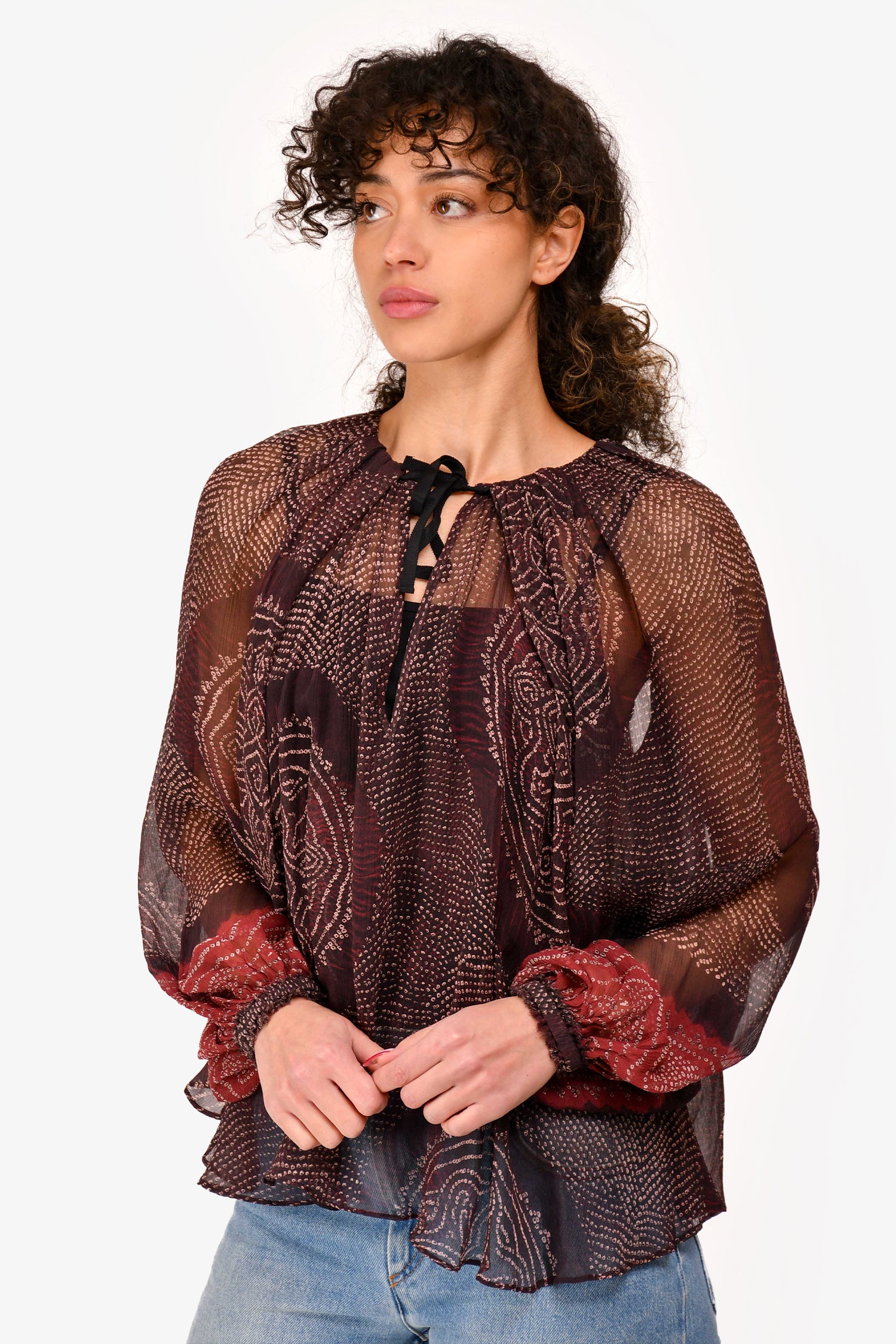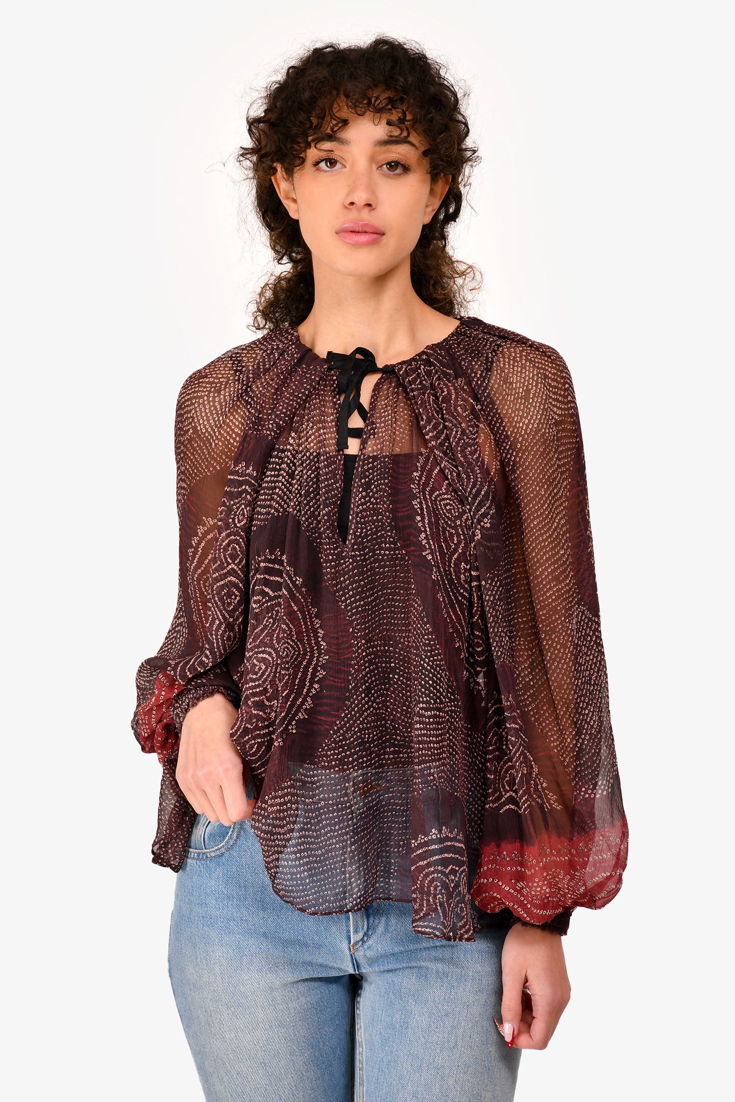 Refresh availabilityUlla Johnson Burgundy Silk Sheer Tie Top. Elasticated cuffs with fringe detail. Grosgrain front tie with a keyhole opening. Unlined. Tonal stitching.