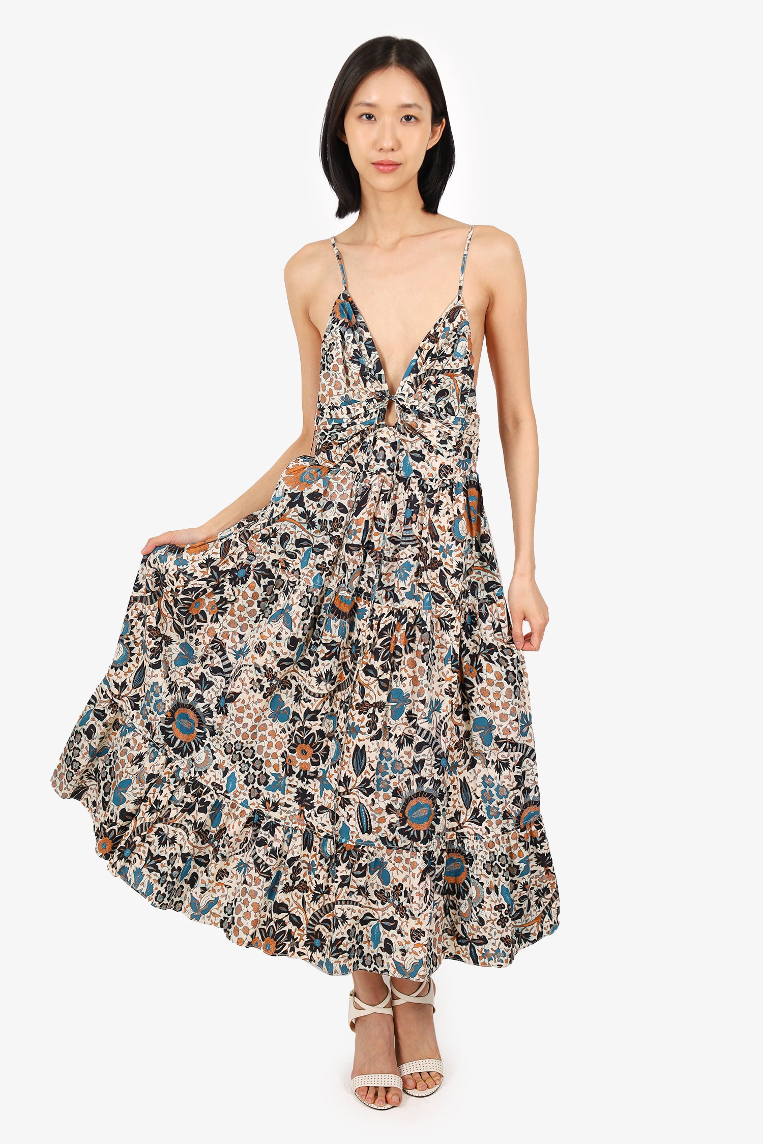 Refresh availabilityUlla Johnson Cream/Orange Floral Printed Stappy Midi Dress. Slip-on. V-neckline. Rear zip and hook closure. Front peep-hole and tie-up closure. Tonal stitching.