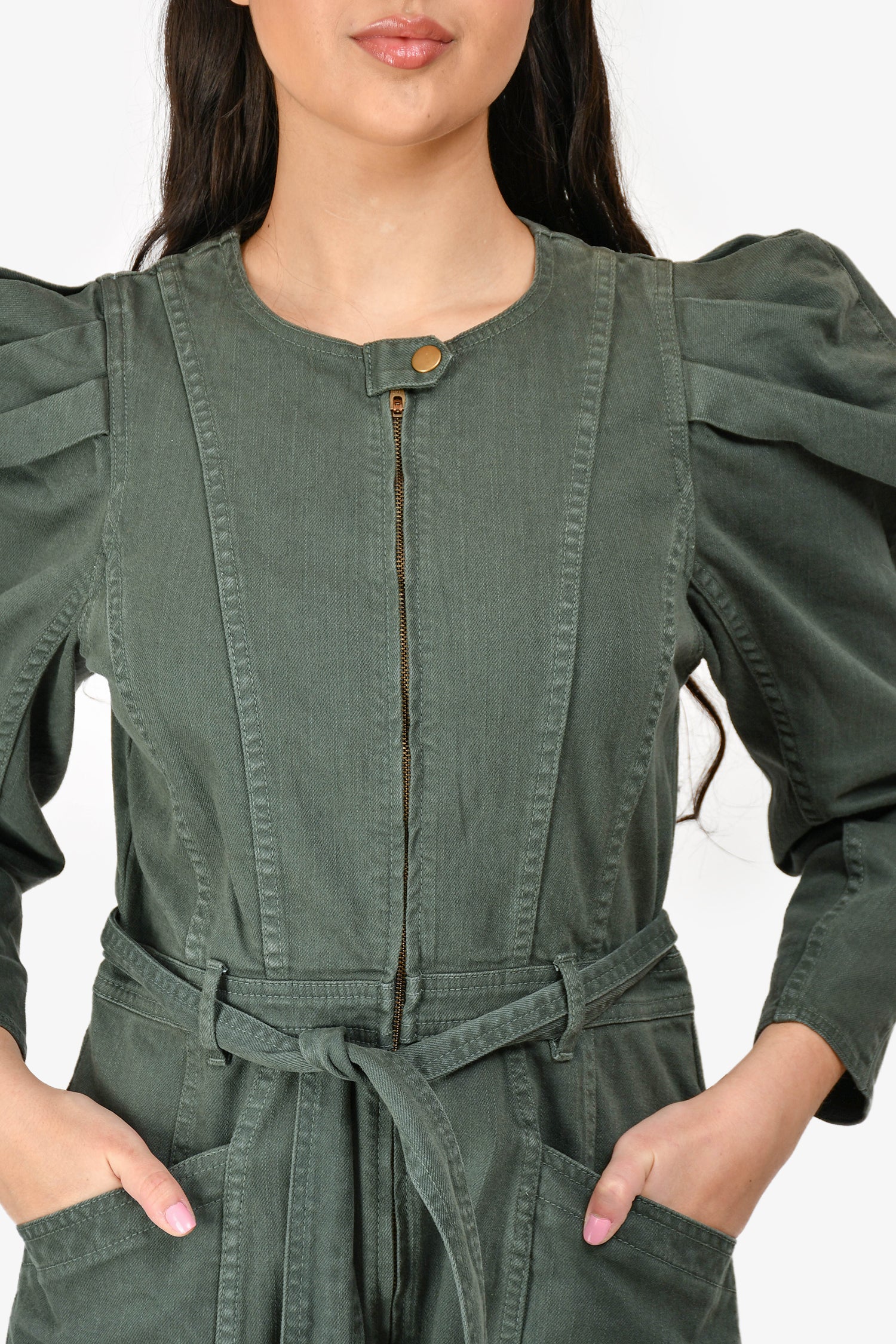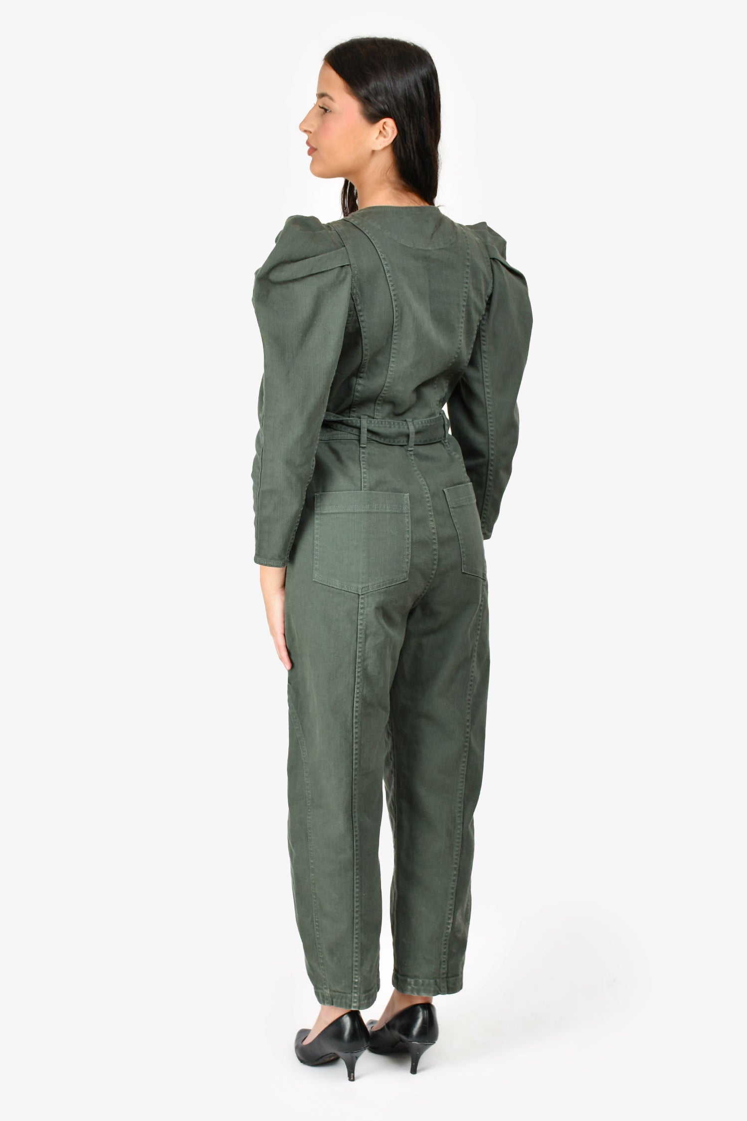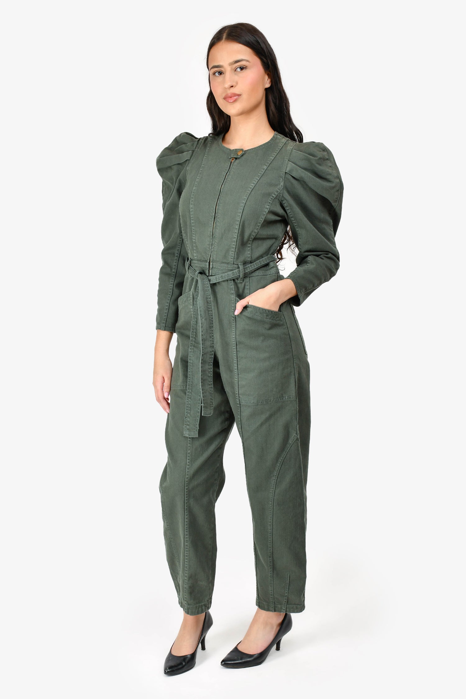Refresh availabilityUlla Johnson Green Denim Puff Sleeve Belted Jumpsuit. Front zip-up and snap-on button closure. Two front pants slip pockets. Two back pants slip pockets. Tonal belt. Unlined. Tonal stitching.