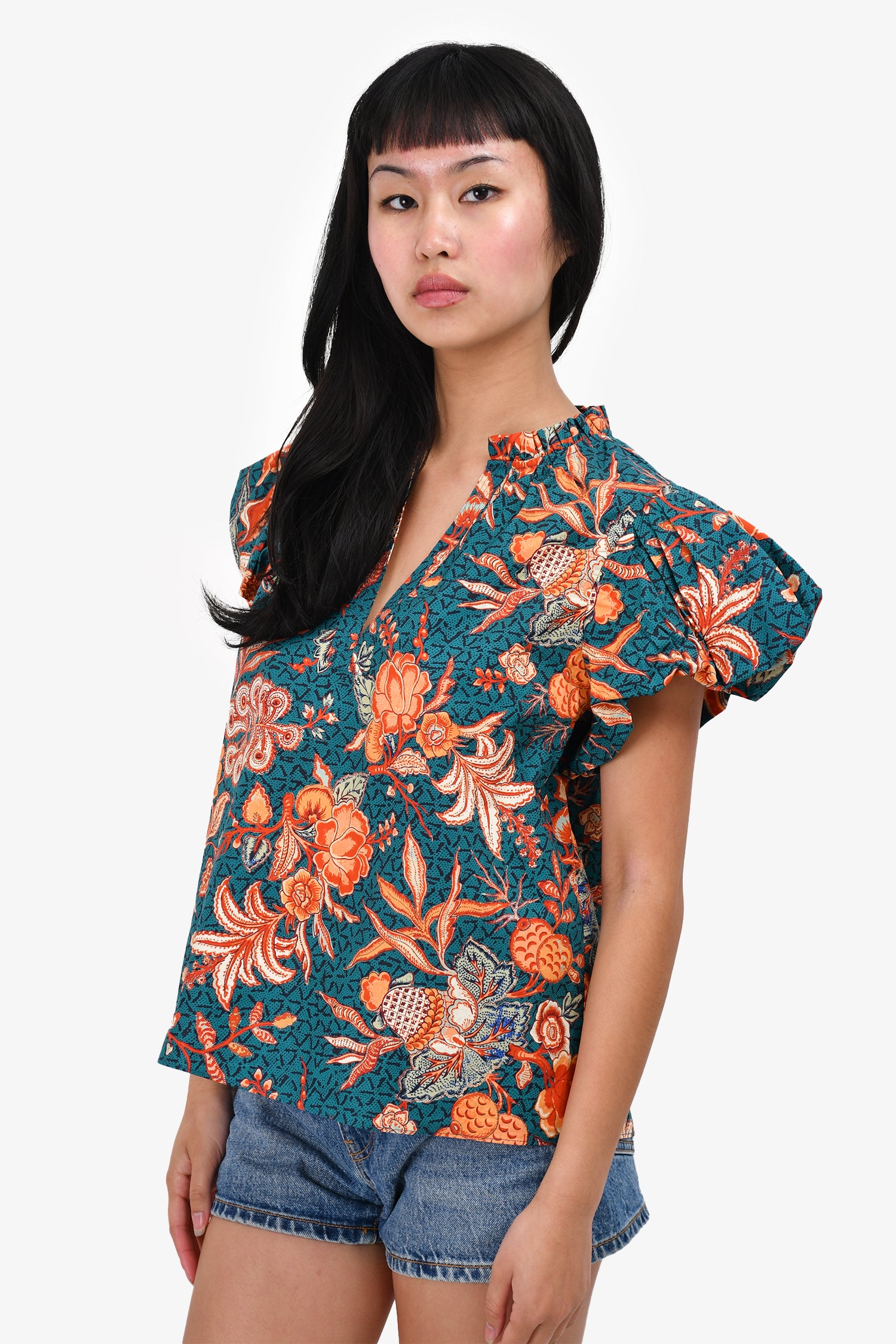 Ulla Johnson Green/Orange V-Neck Puff Sleeve Top Size 6