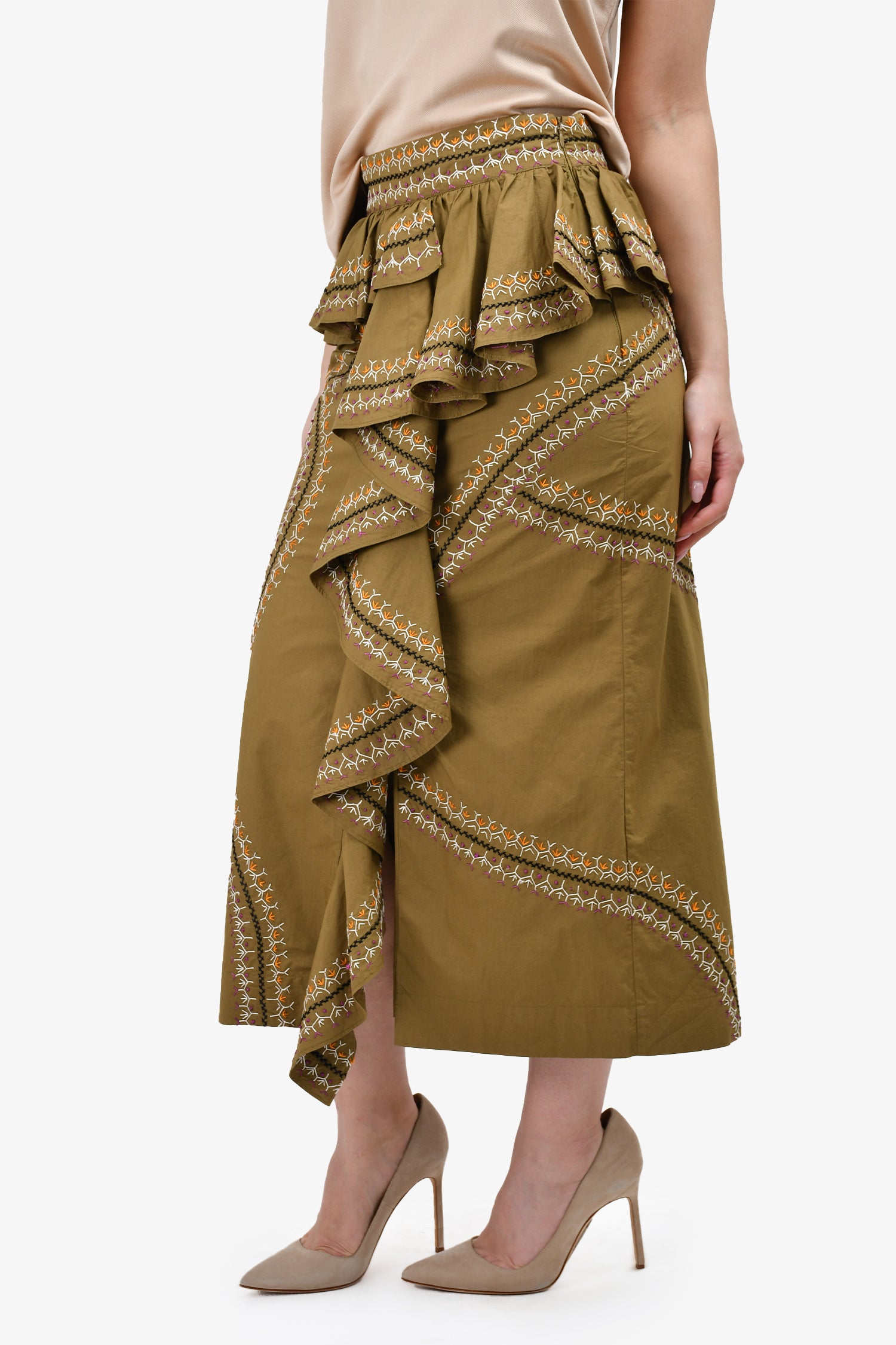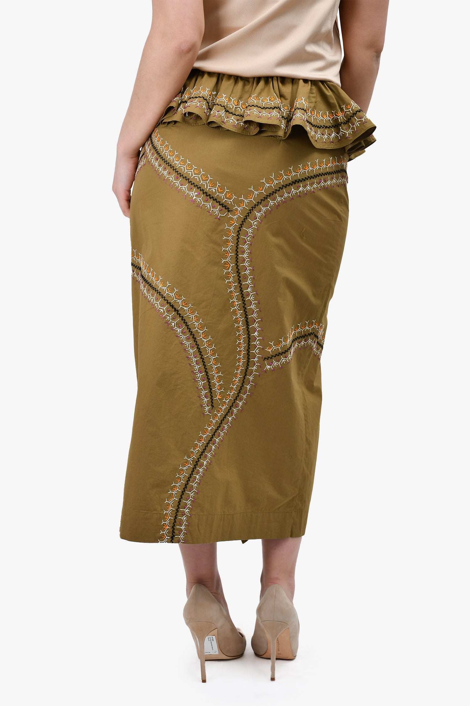 Ulla Johnson Khaki Floral Embroidered Peplum Midi Skirt Size 8