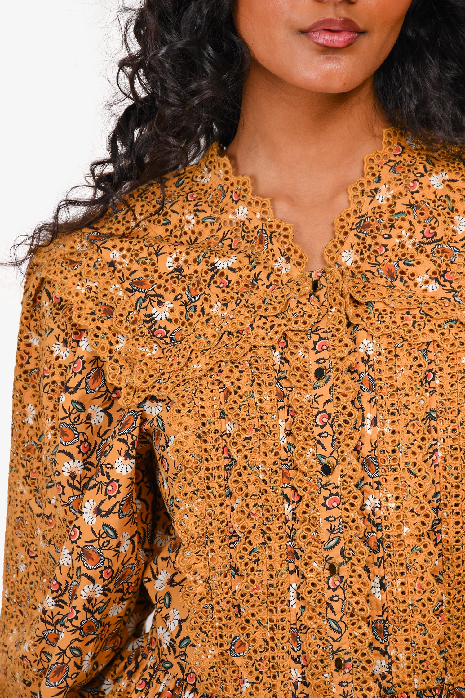 Refresh availabilityUlla Johnson Mustard Printed Eyelet Detail Blouse. Front button-up closure. Tonal stitching.