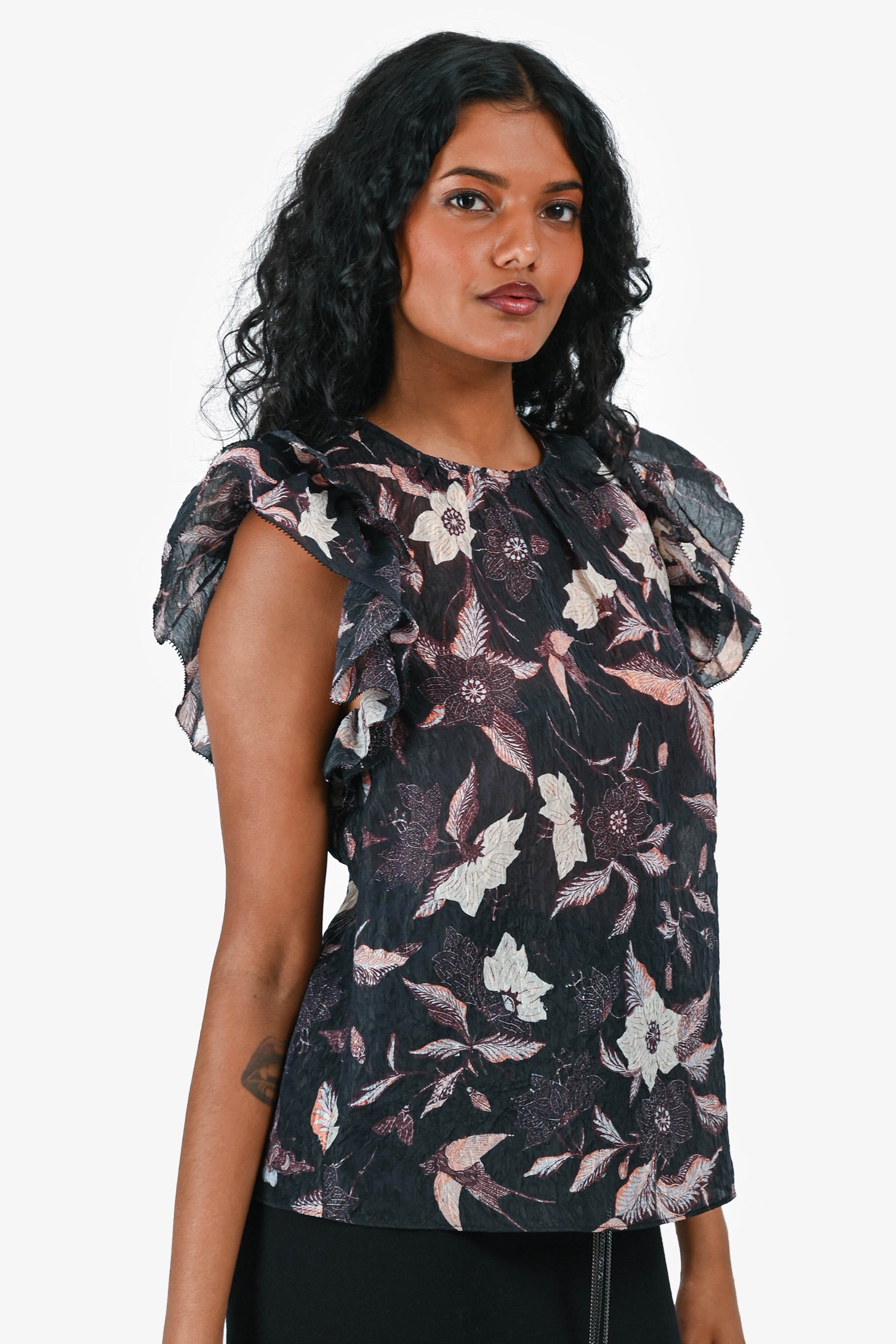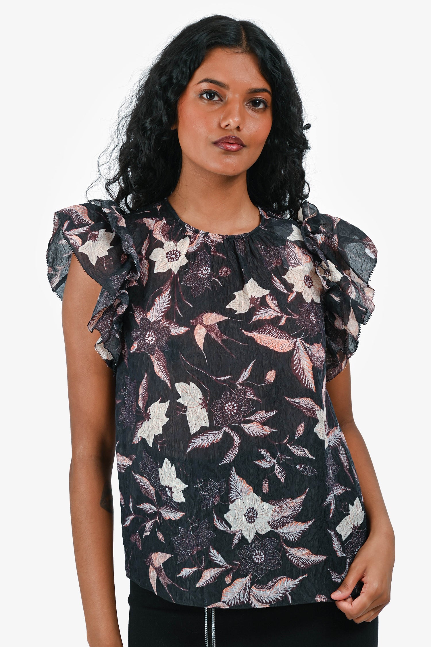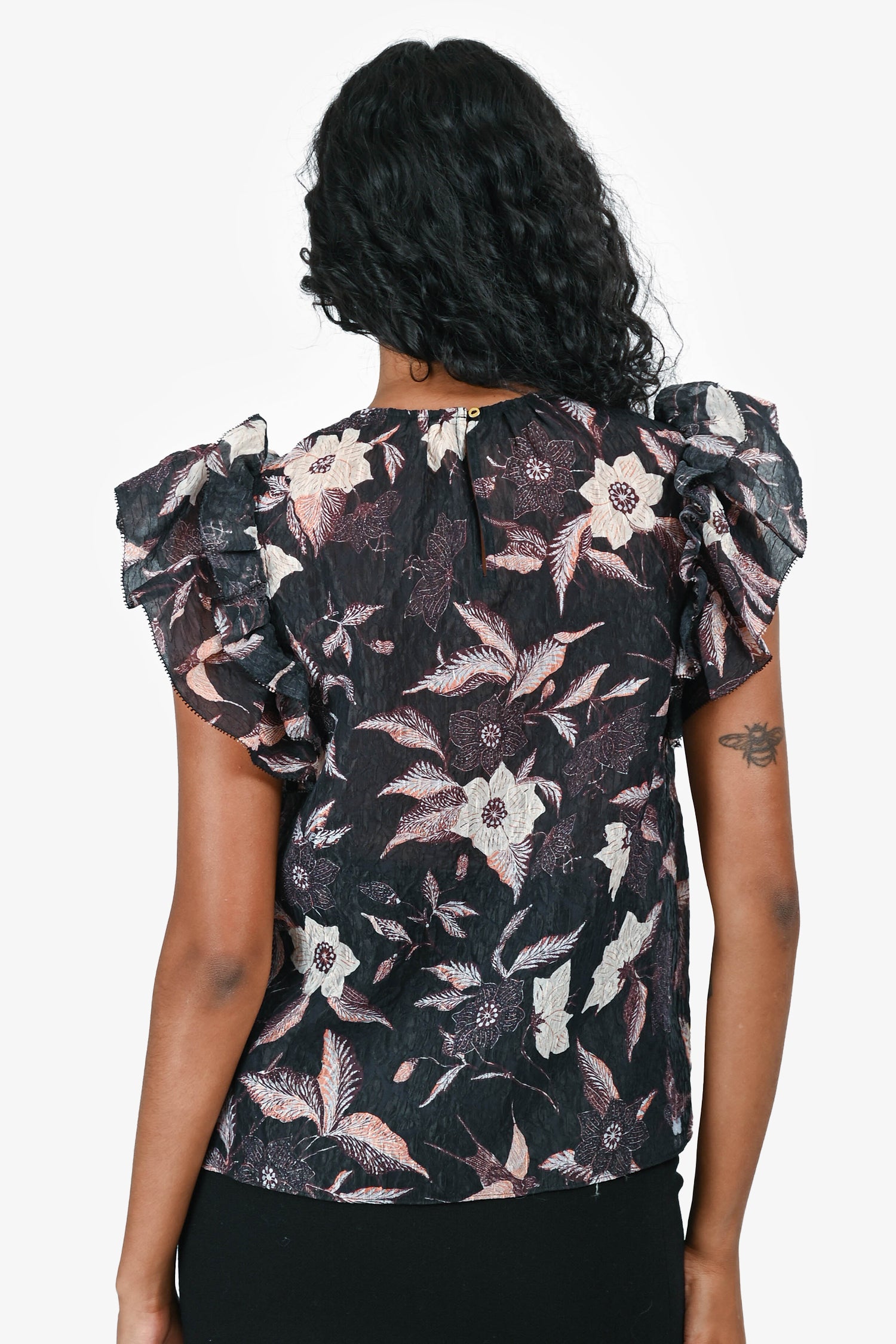 Refresh availabilityUlla Johnson Navy/Pink Silk Floral Ruffle Top. Ruffle trim at sleeves. Sleeveless design. Back keyhole with button closure. Tonal stitching.
