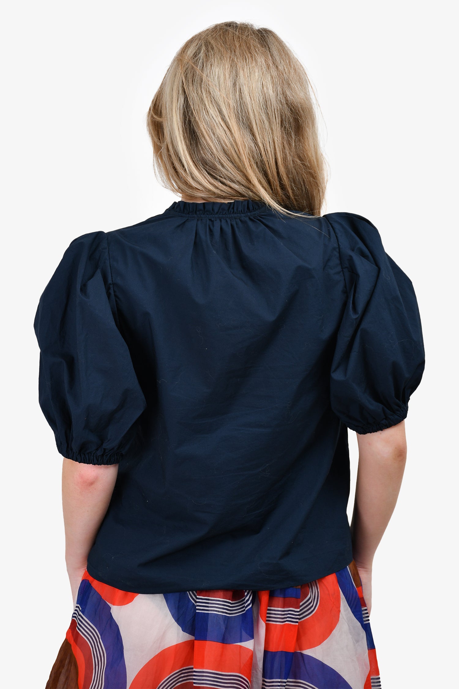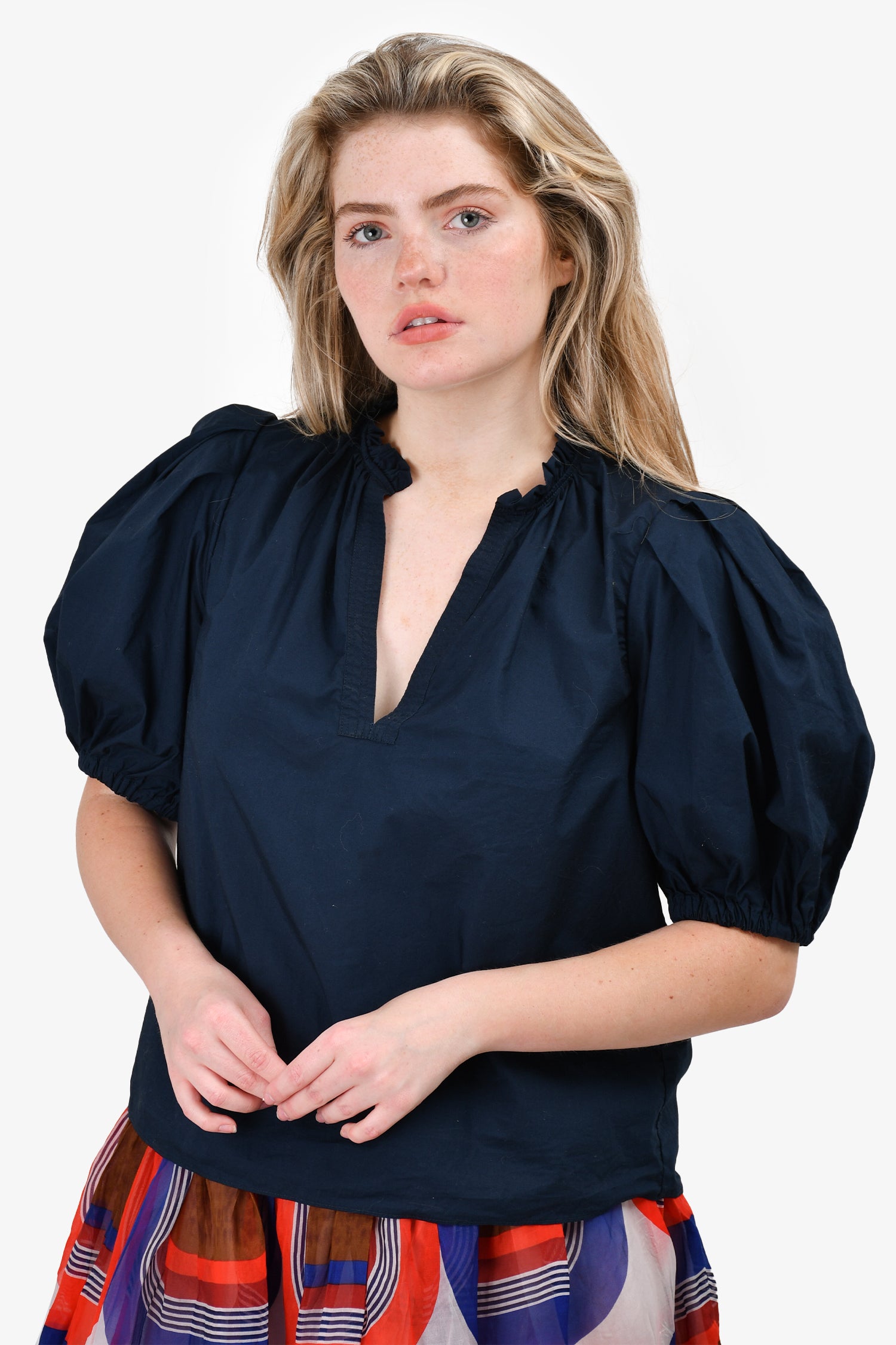 Refresh availabilityUlla Johnson Navy Puff Sleeve V-Neck Top. Pull-on. Elasticized cuffs.