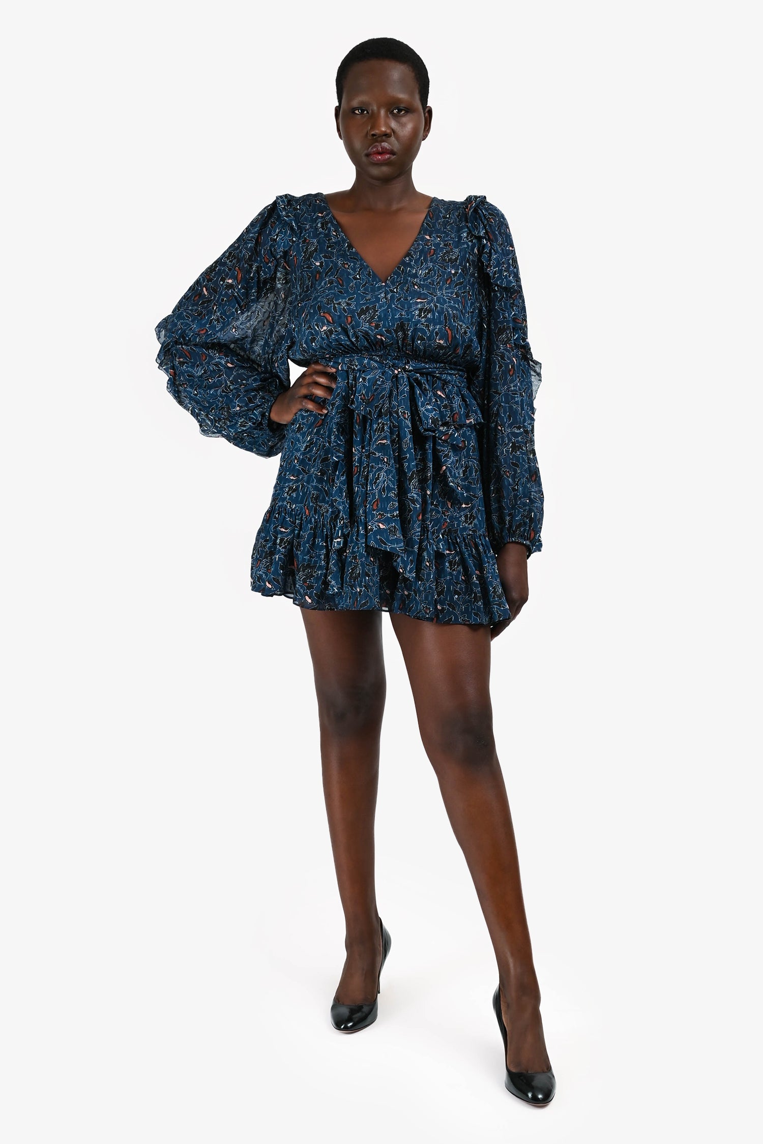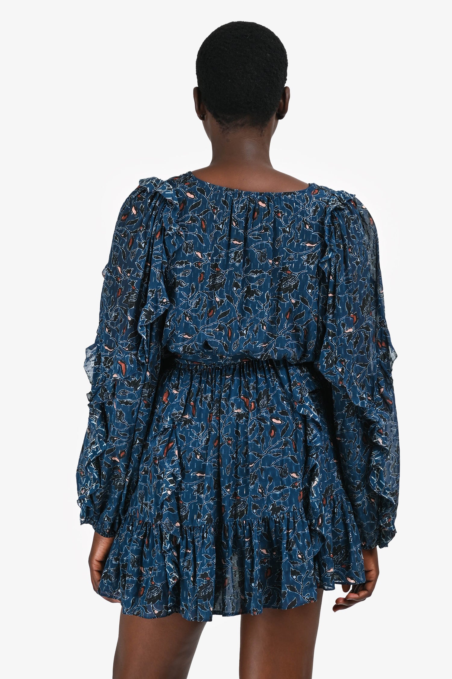 Refresh availabilityUlla Johnson Navy Silk Floral Printed Long Sleeves Mini Dress. V-neckline with ruffle detail. Long sleeves with elastic cuffs. Pull-on style. Tonal stitching.