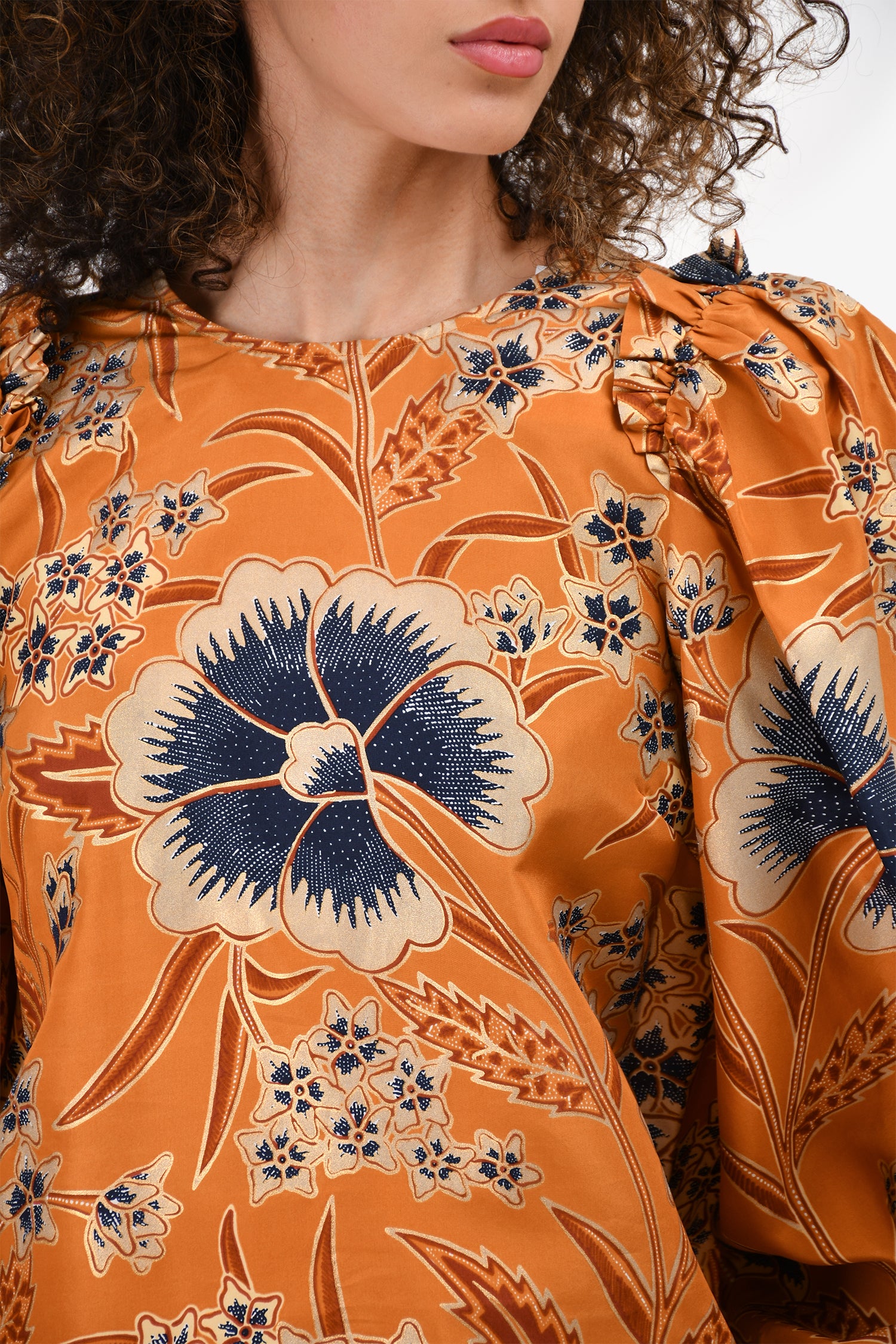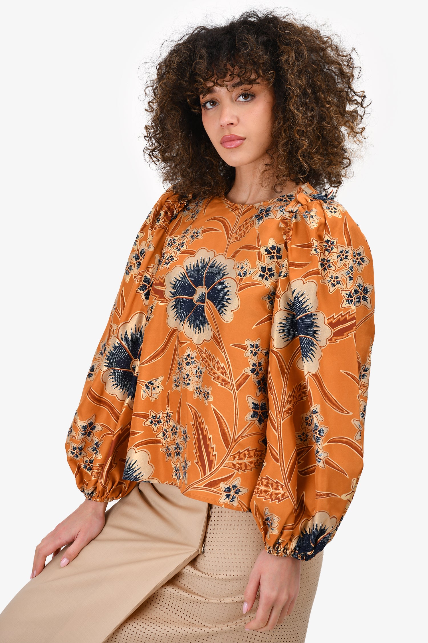 Refresh availabilityUlla Johnson Orange/Blue Printed Silk Puff Sleeve Blouse. Rear zip and hook closure. Round neck. Elasticized cuffs.
