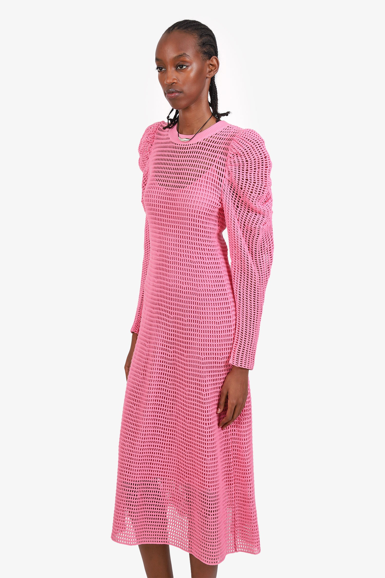 Refresh availabilityUlla Johnson Pink Crochet Puff Sleeve Maxi Dress. Pull-on. Round neckline. Attached interior lining. Tonal stitching.