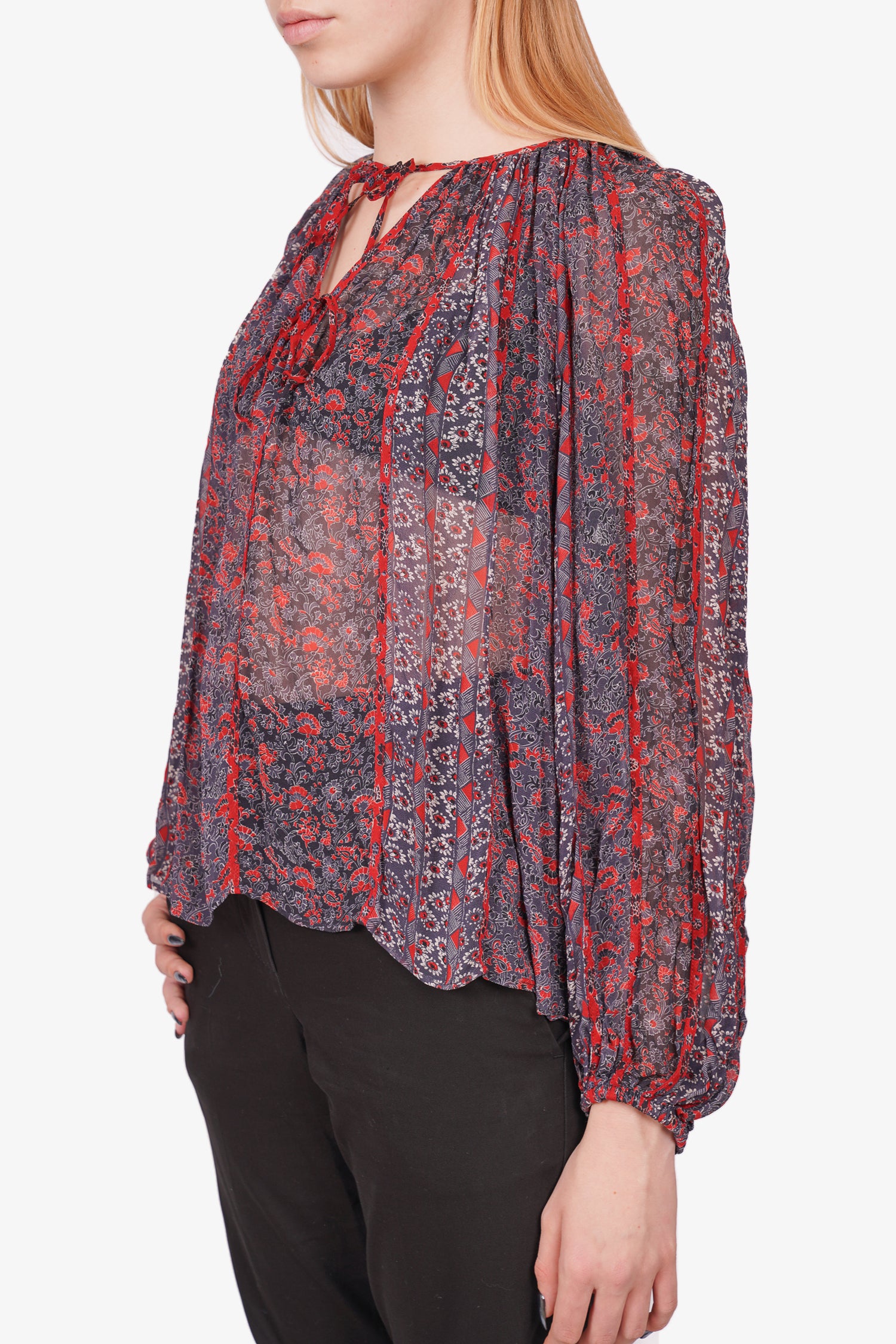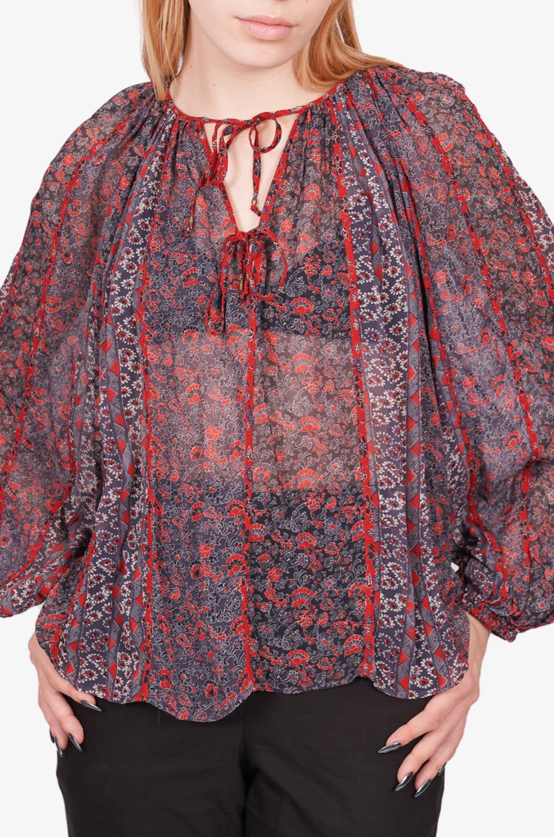 Refresh availabilityUlla Johnson Red/Grey Silk Patterned L/S Top. Front tie-up closure. Bishop sleeves. Tonal stitching.