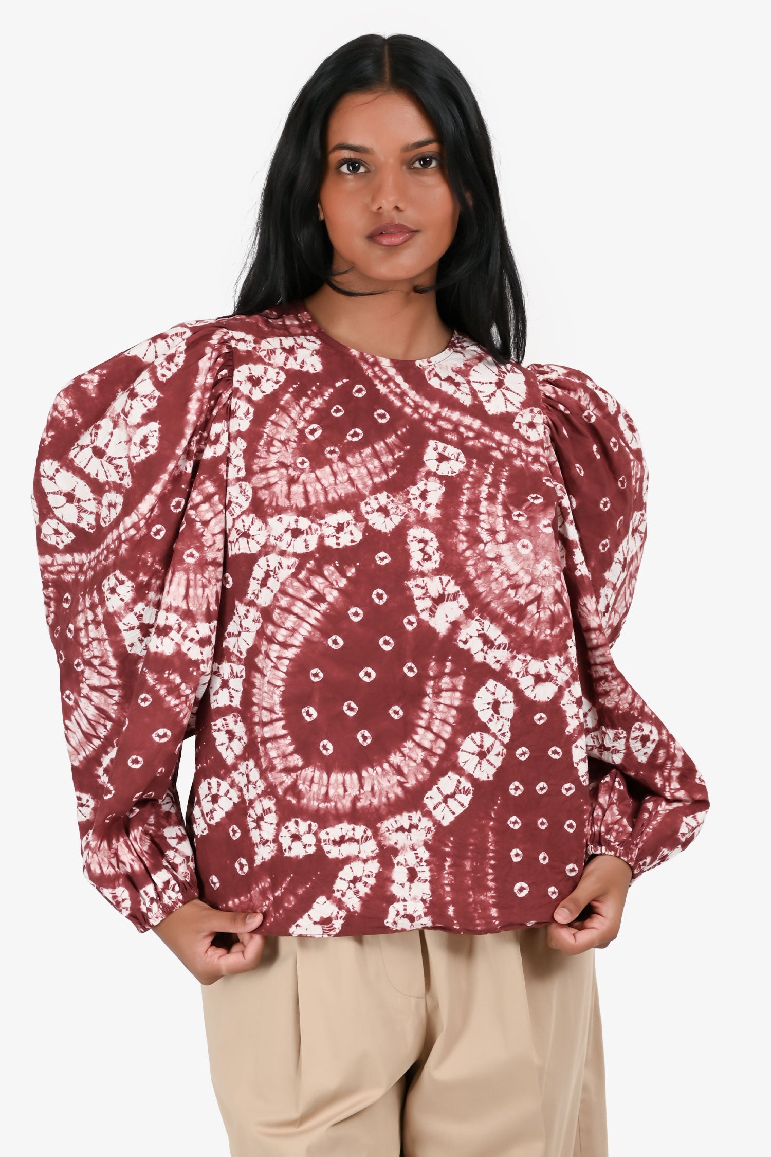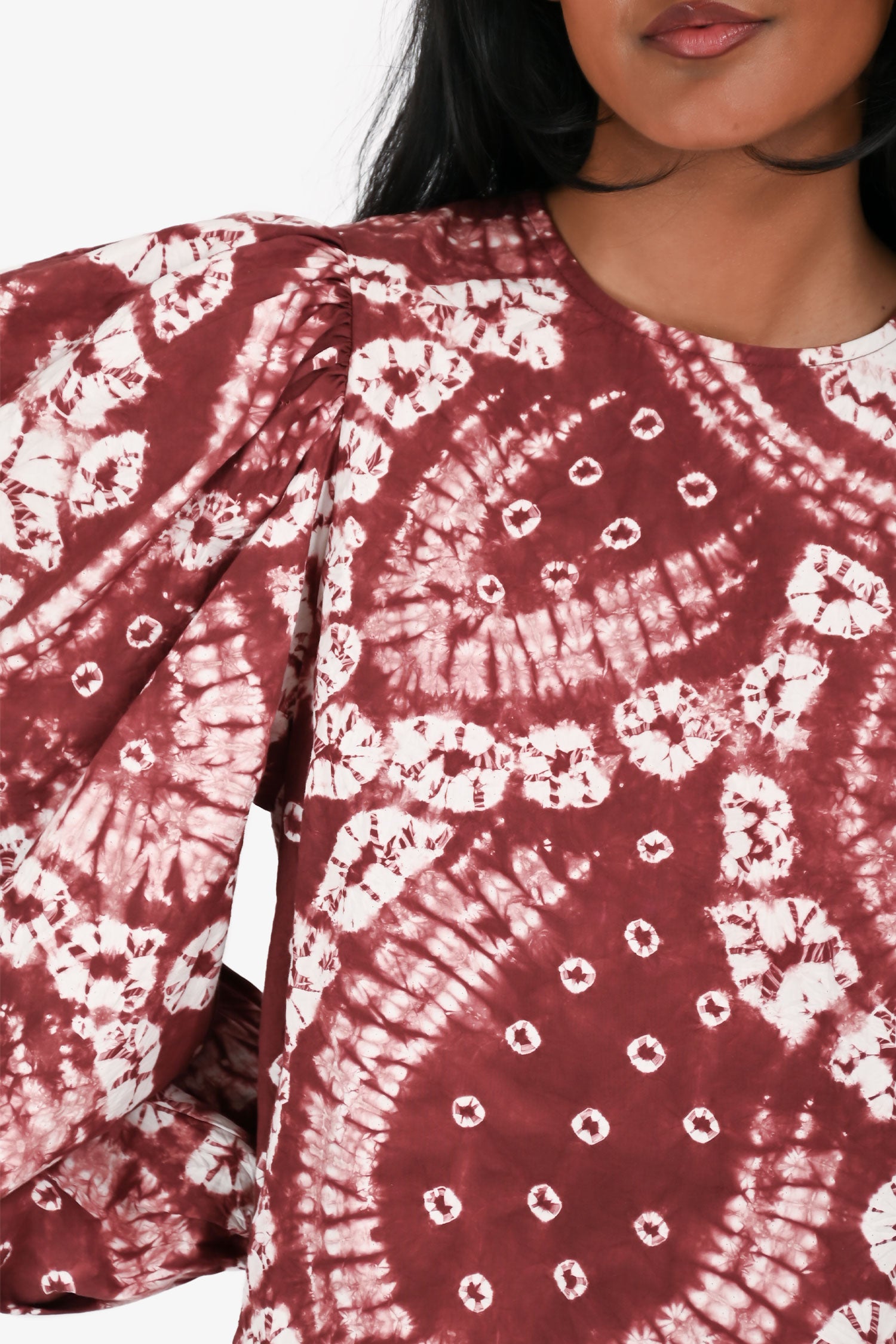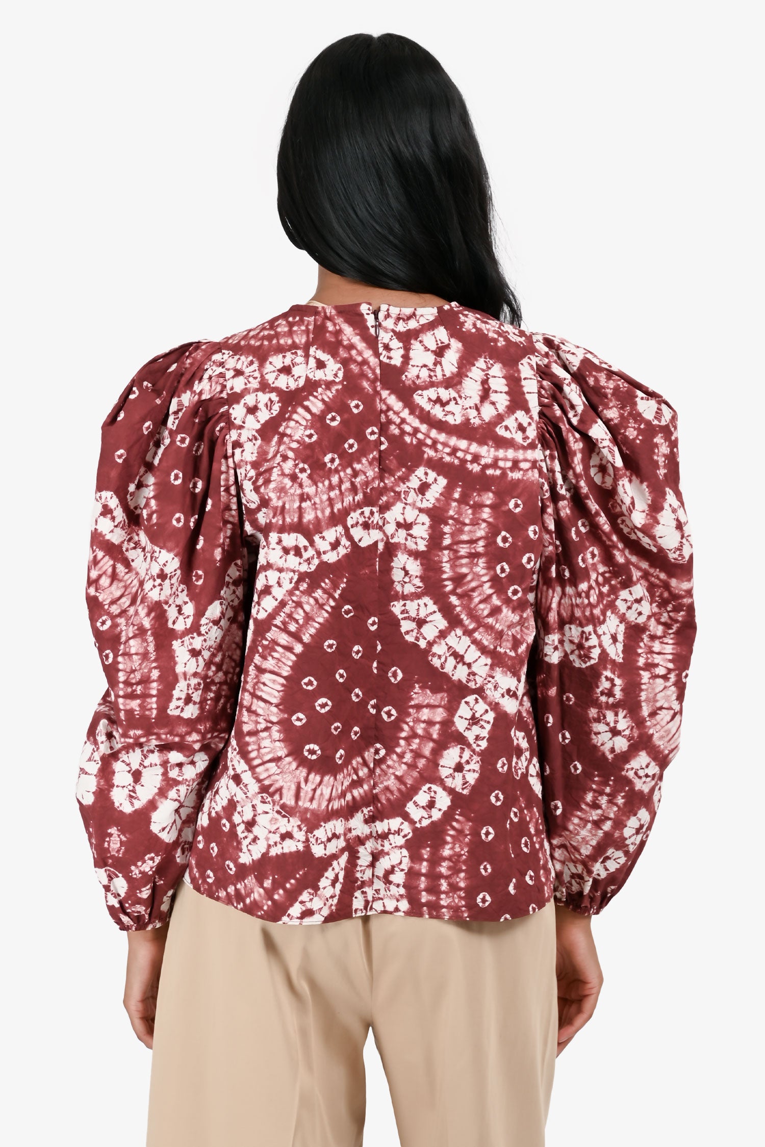 Refresh availabilityUlla Johnson Red/White Cotton Tie Dye Puff Sleeve Top. Rear zip and hook closure. Elasticized cuffs.