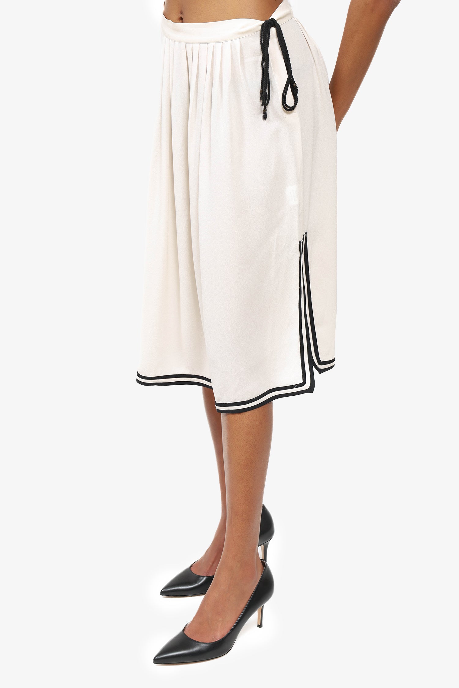 Refresh availabilityUlla Johnson White/Black Striped Midi Skirt. Side snap button with rope tie-up closure. Unlined. Tonal stitching. 2 side slits.