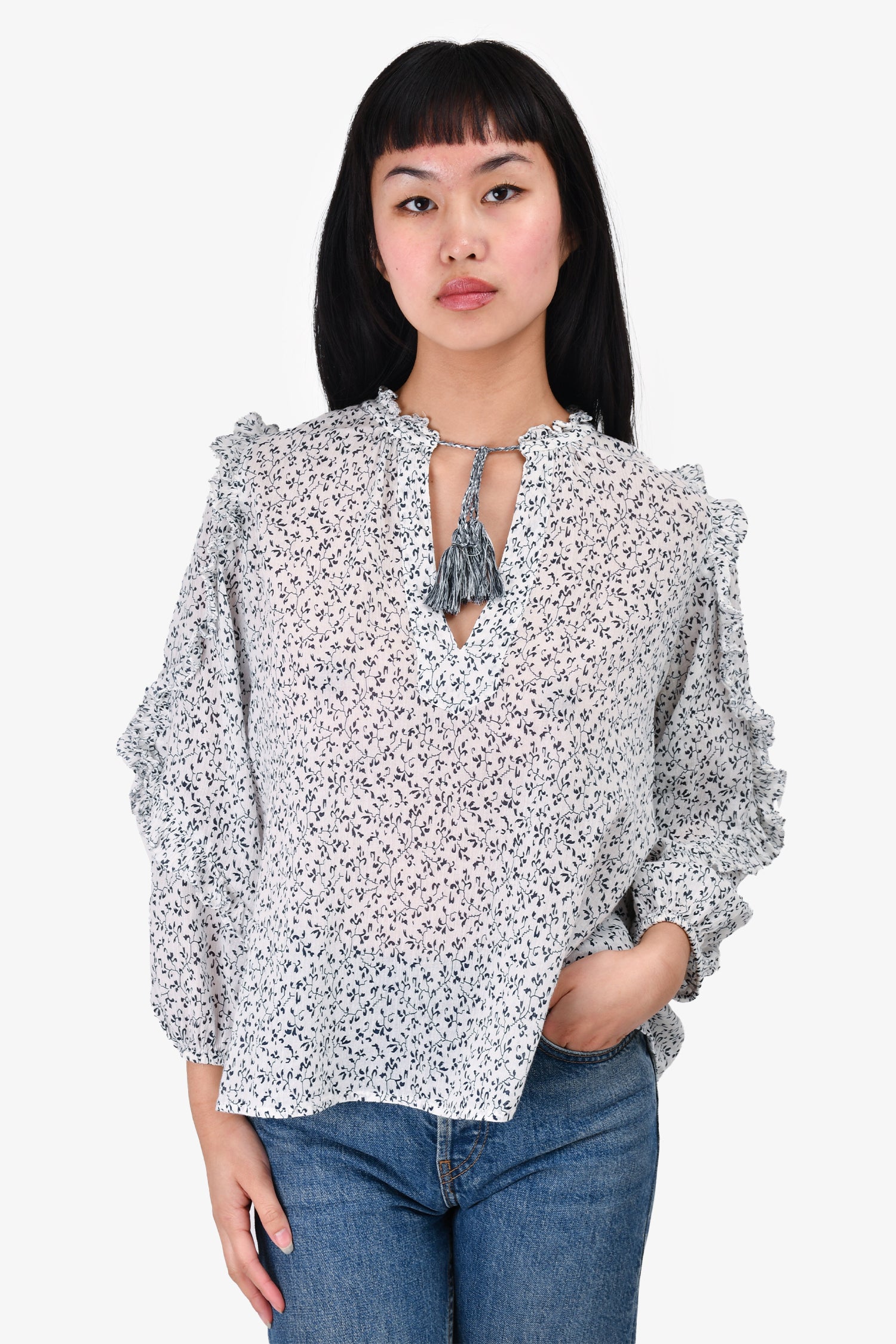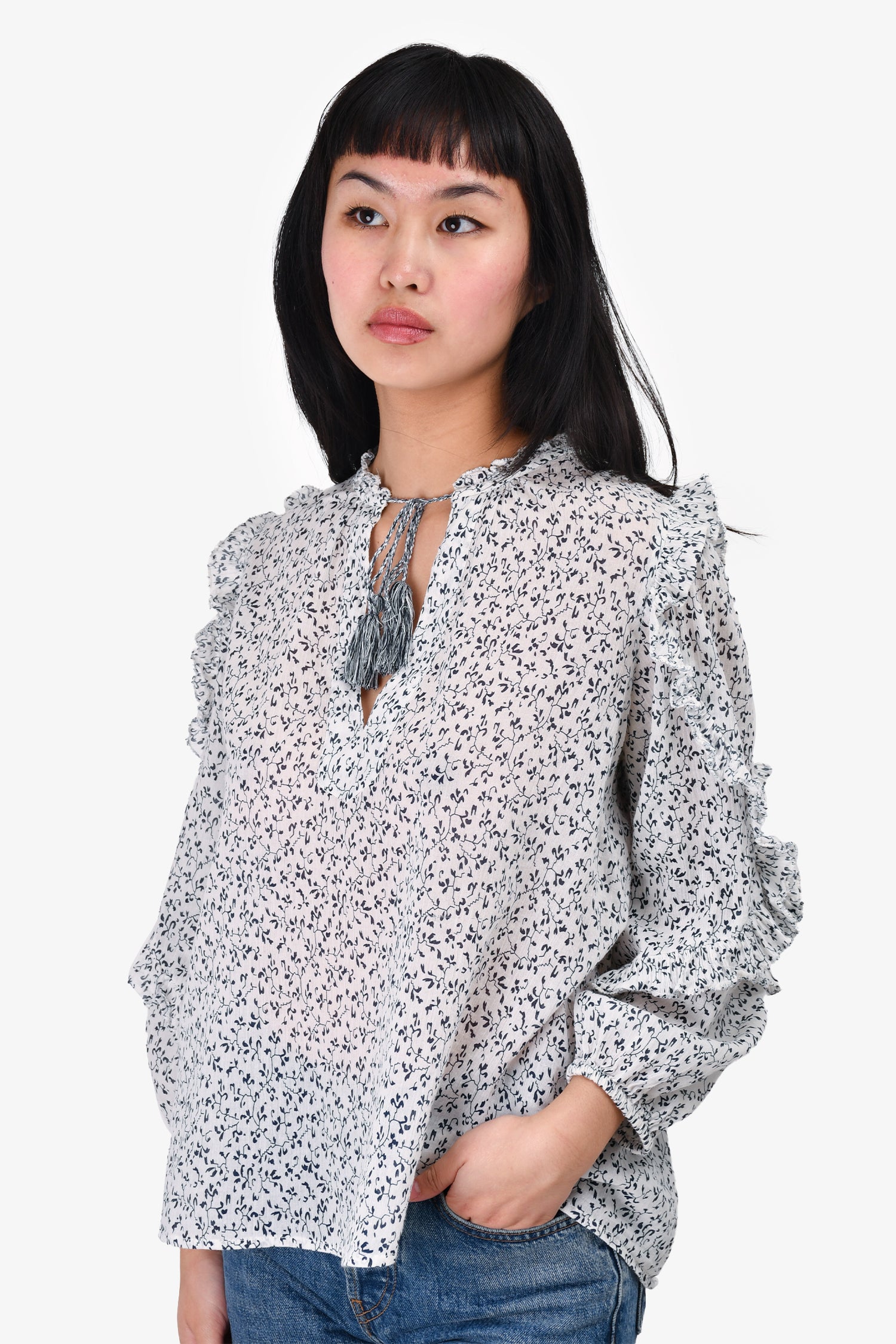 Refresh availabilityUlla Johnson White/Navy Foliage Ruffled Detailed Top. Pull-on. Neck tie closure. Elasticized cuffs. Tonal stitching.