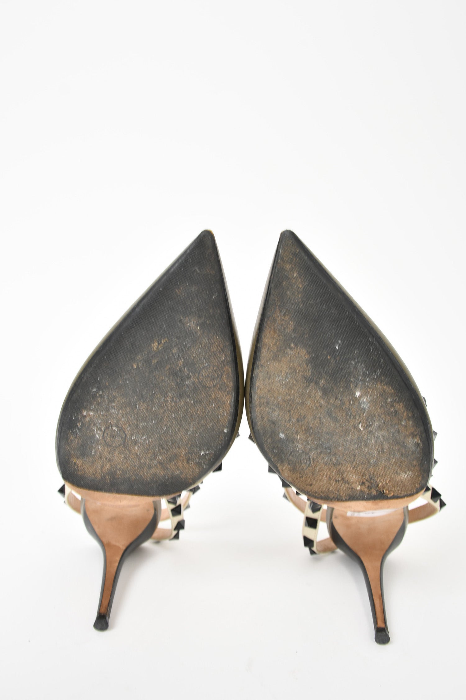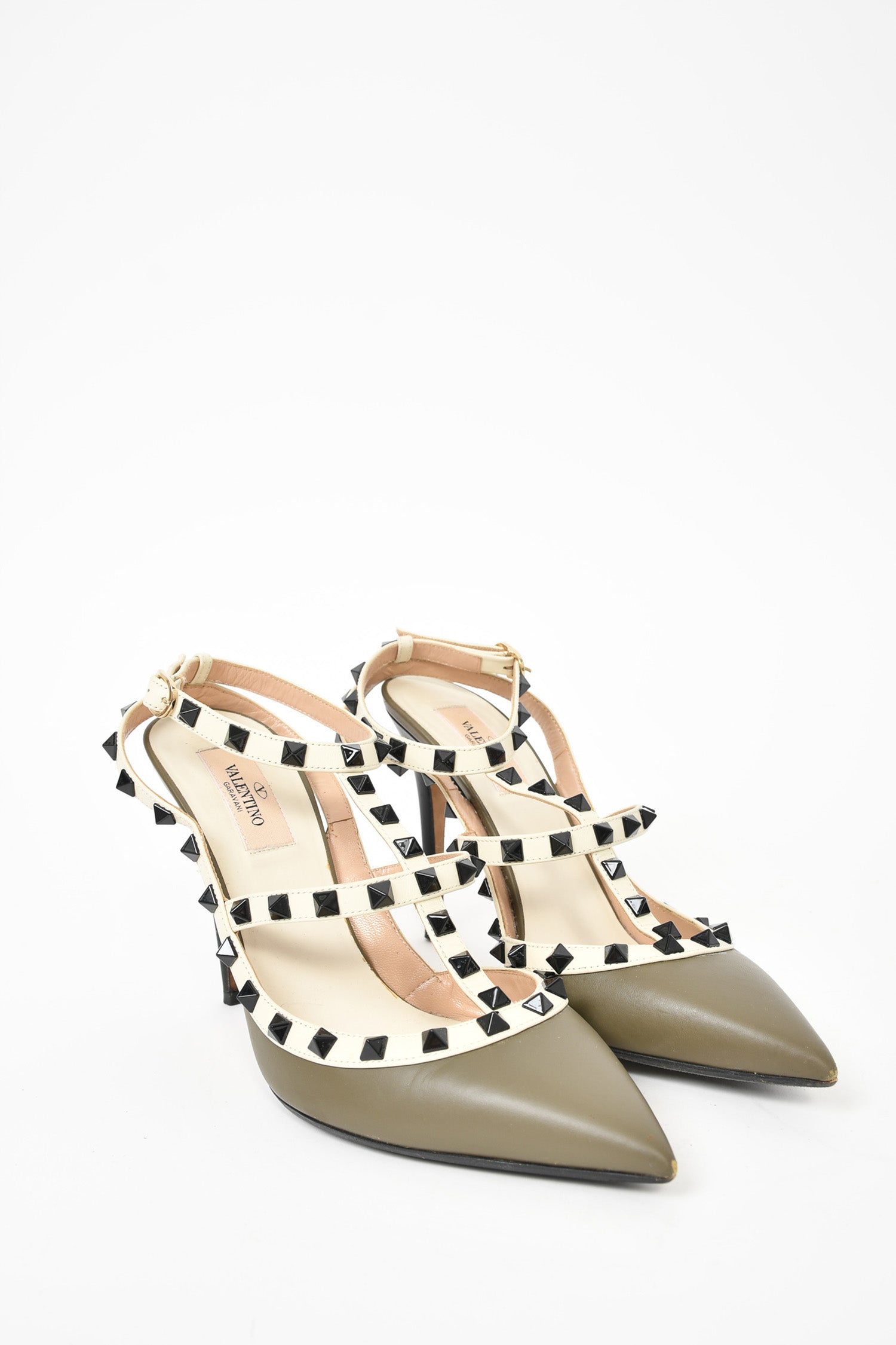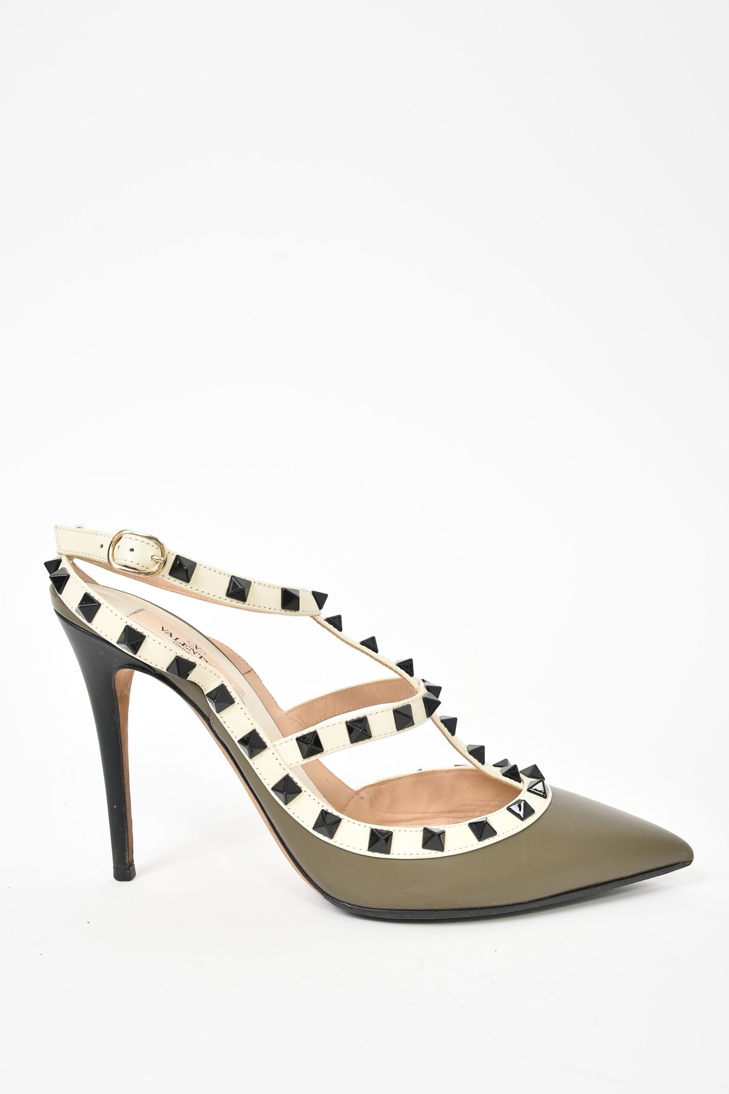 Refresh availabilityValentino Army Green/Cream Rockstud Heels. Pointed toe. Ankle strap with buckle closure. Silver-tone hardware. Tonal stitching.