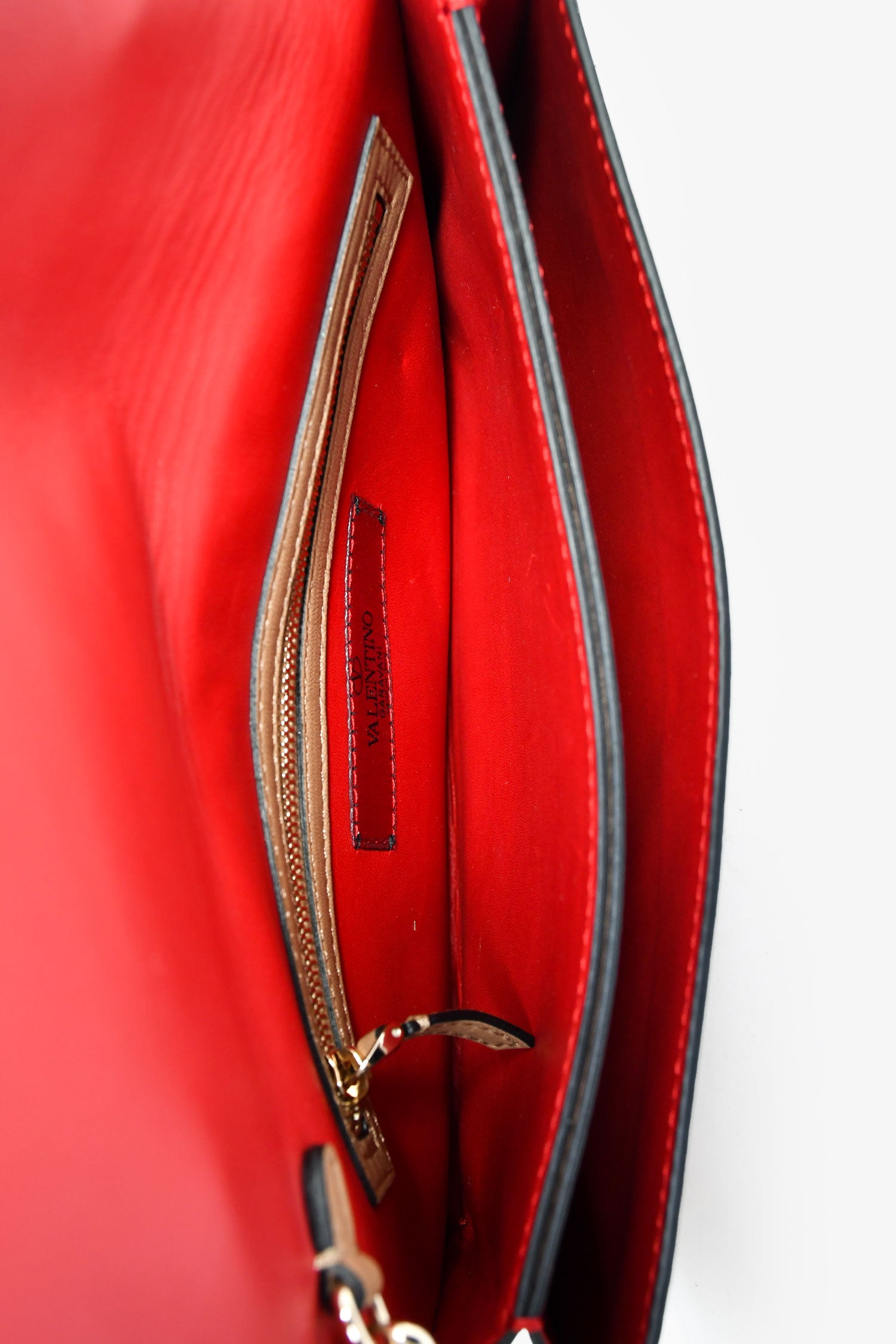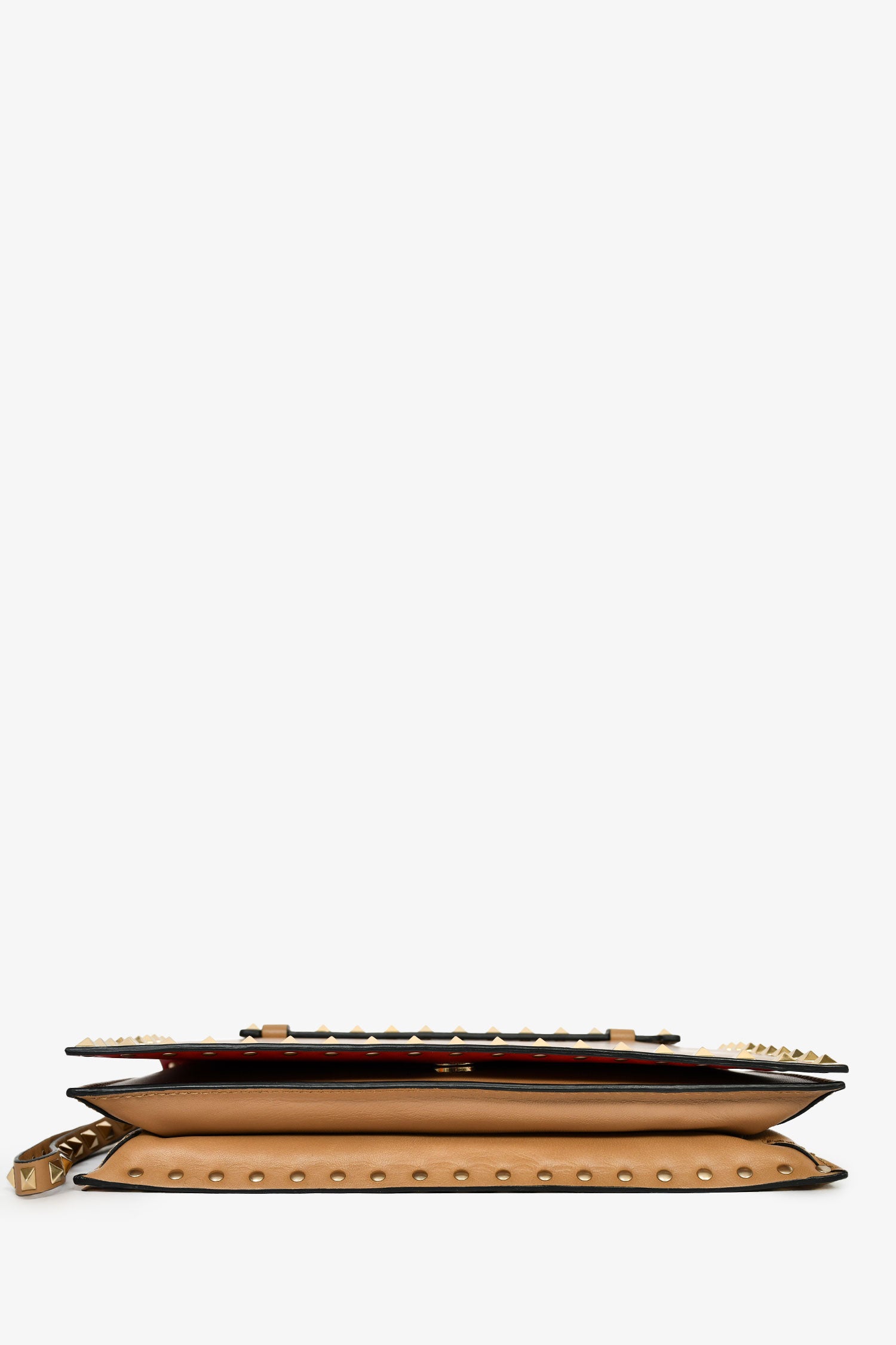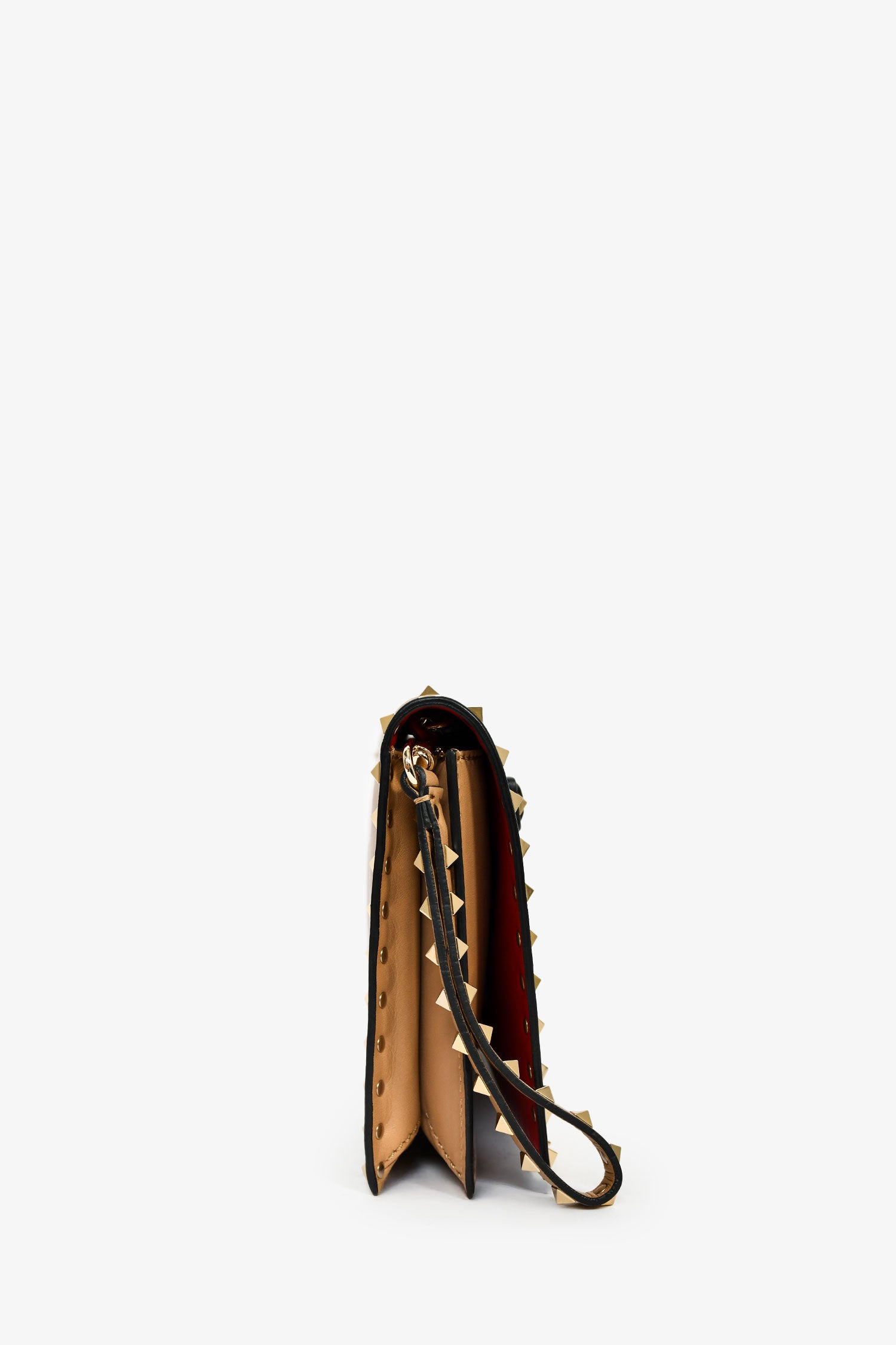 Refresh availabilityValentino Beige Leather Rockstud Clutch. Fold-over flap with a snap closure. 1 wristlet and 1 hand slot. 4 interior compartments: 1 zip and 3 slip. Gold-tone hardware. Tonal stitching.