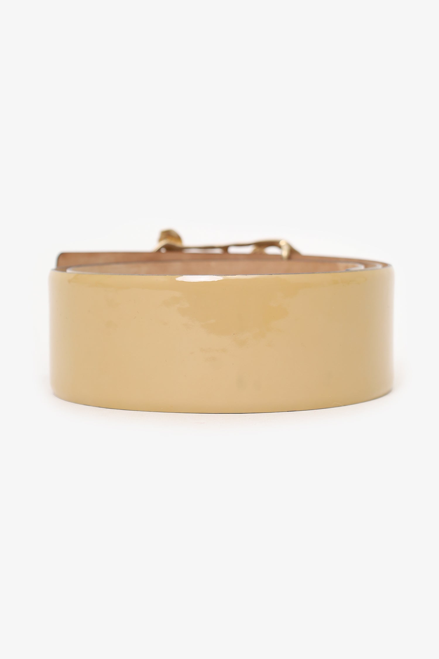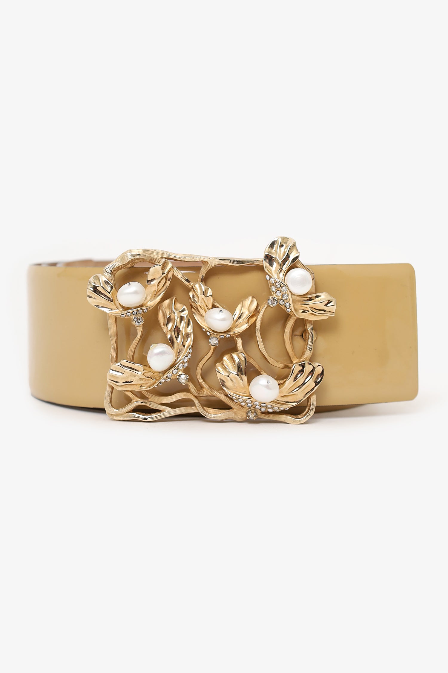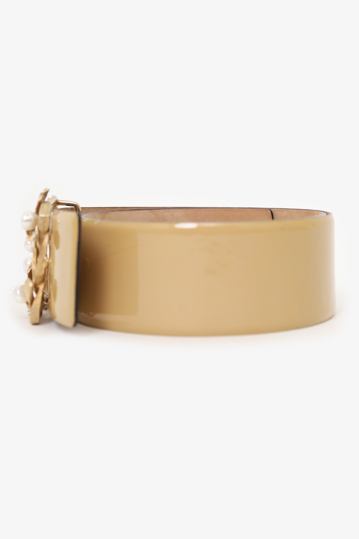 Refresh availabilityValentino Beige Patent Leather Pearl/Crystal Buckle Wide Belt. Adjustable pull-through push-pin closure. Tonal stitching. Gold-tone hardware.