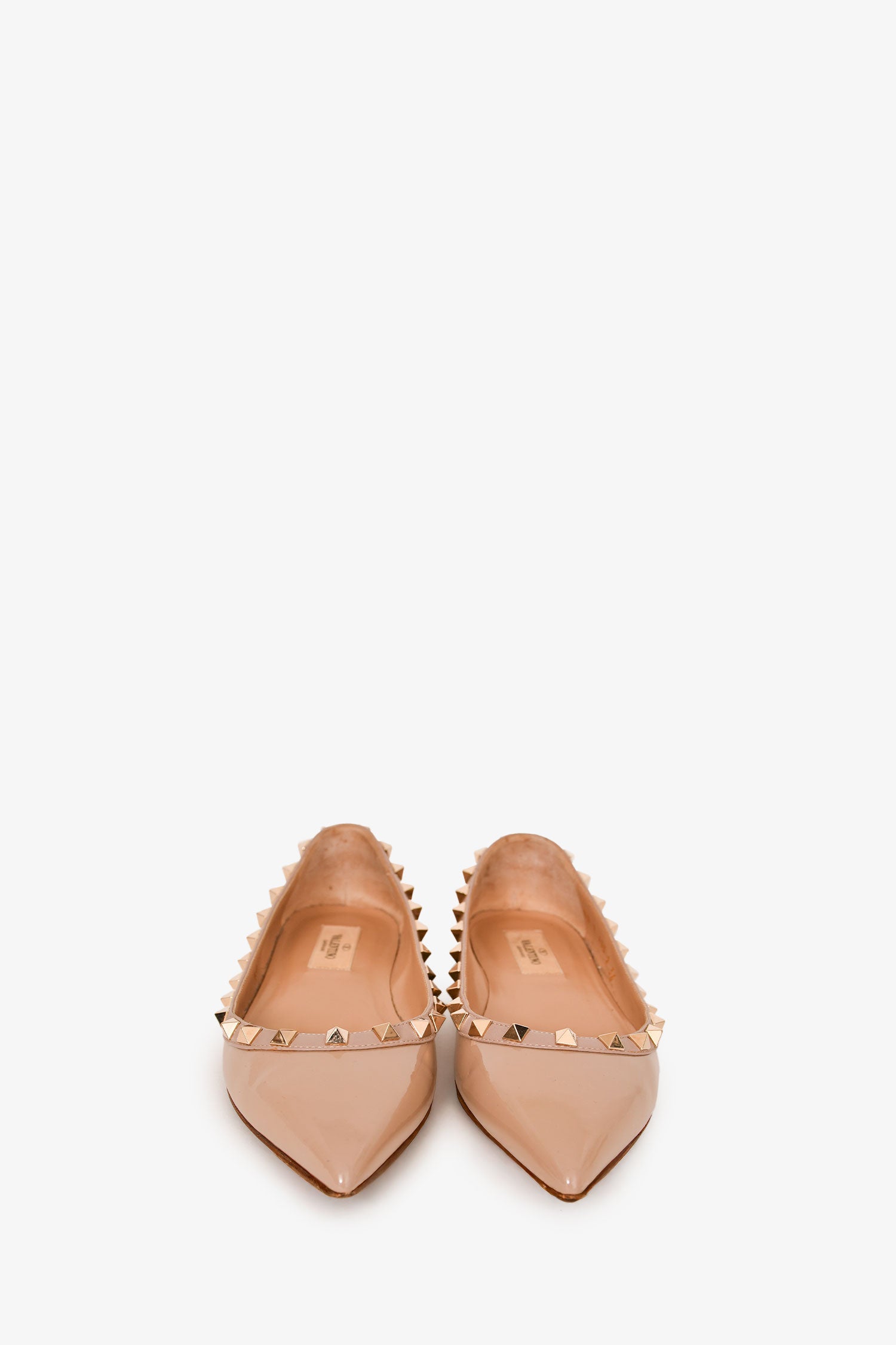 Refresh availabilityValentino Beige Patent Leather Rockstud Flats. Pointed toe front. Gold-tone hardware. Leather insole. Tonal stitching.