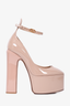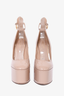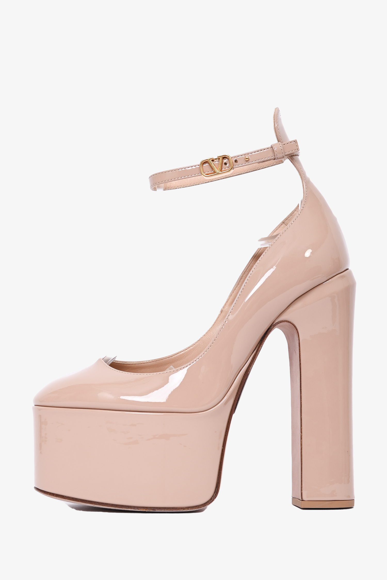 Valentino Beige Patent Platform Tan-Go Heels. Round toe. Ankle strap with buckle closure. Glossy finish. Tonal stitching.