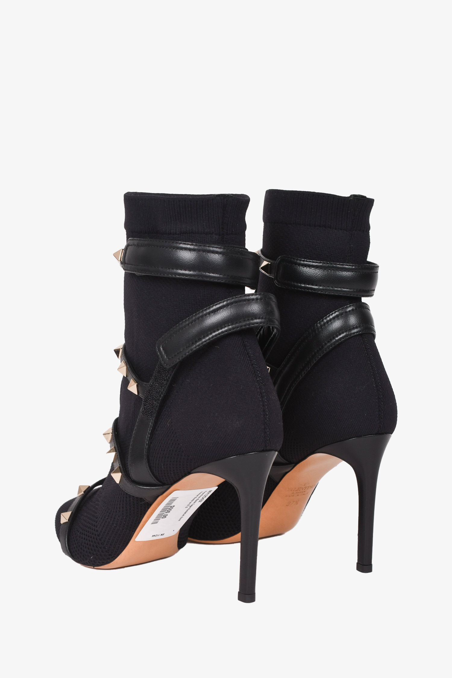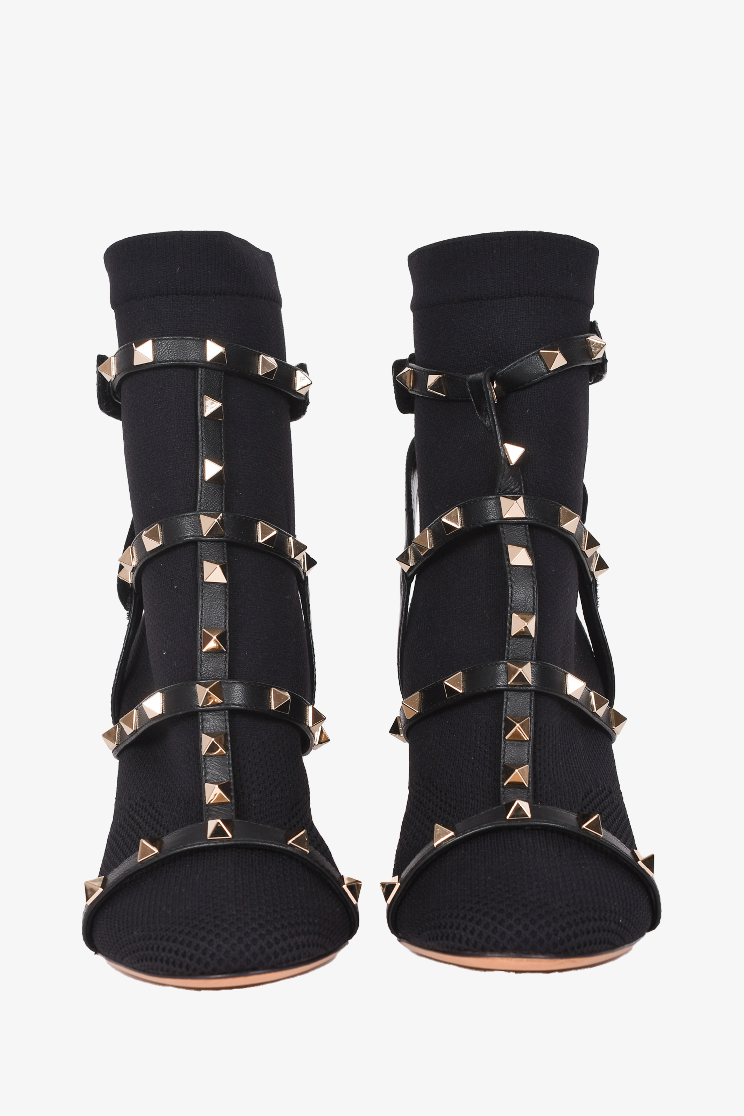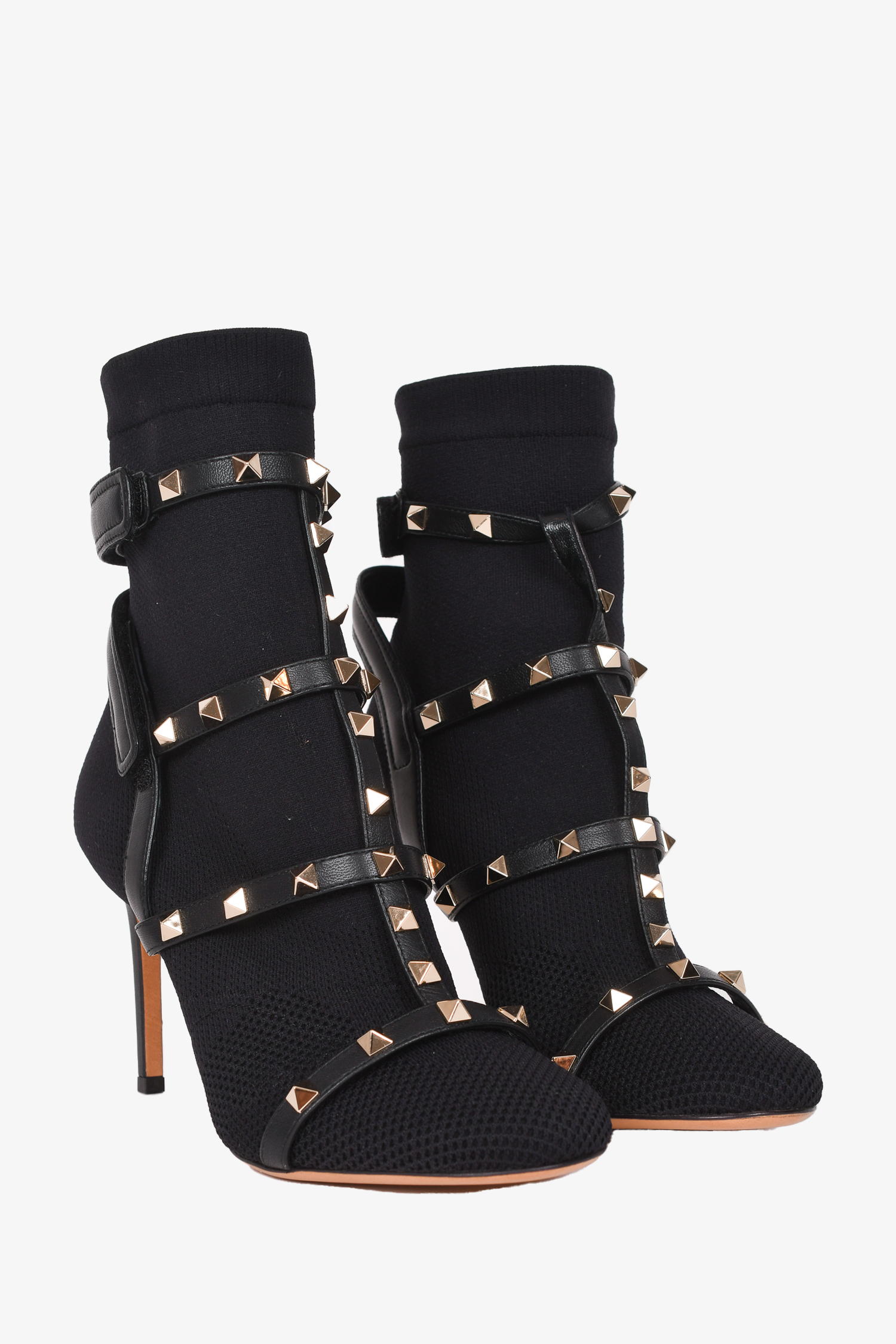 Refresh availabilityValentino Black Cage Rockstud Sock Heeled Boots. Round toe. Pull-on. Ankle strap with velcro closure. Gold-tone hardware. Tonal stitching.
