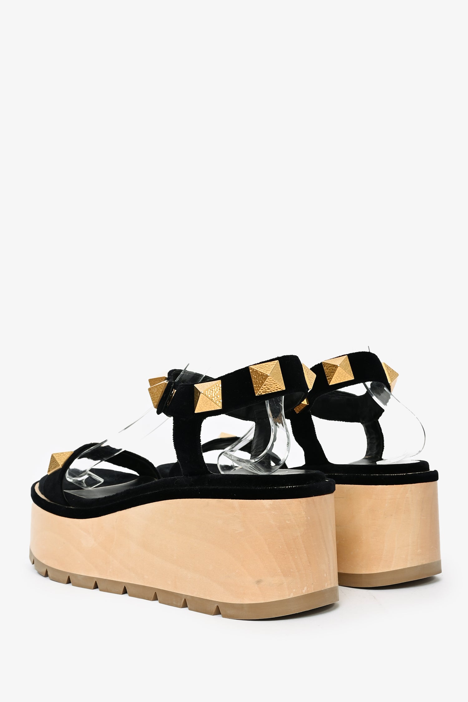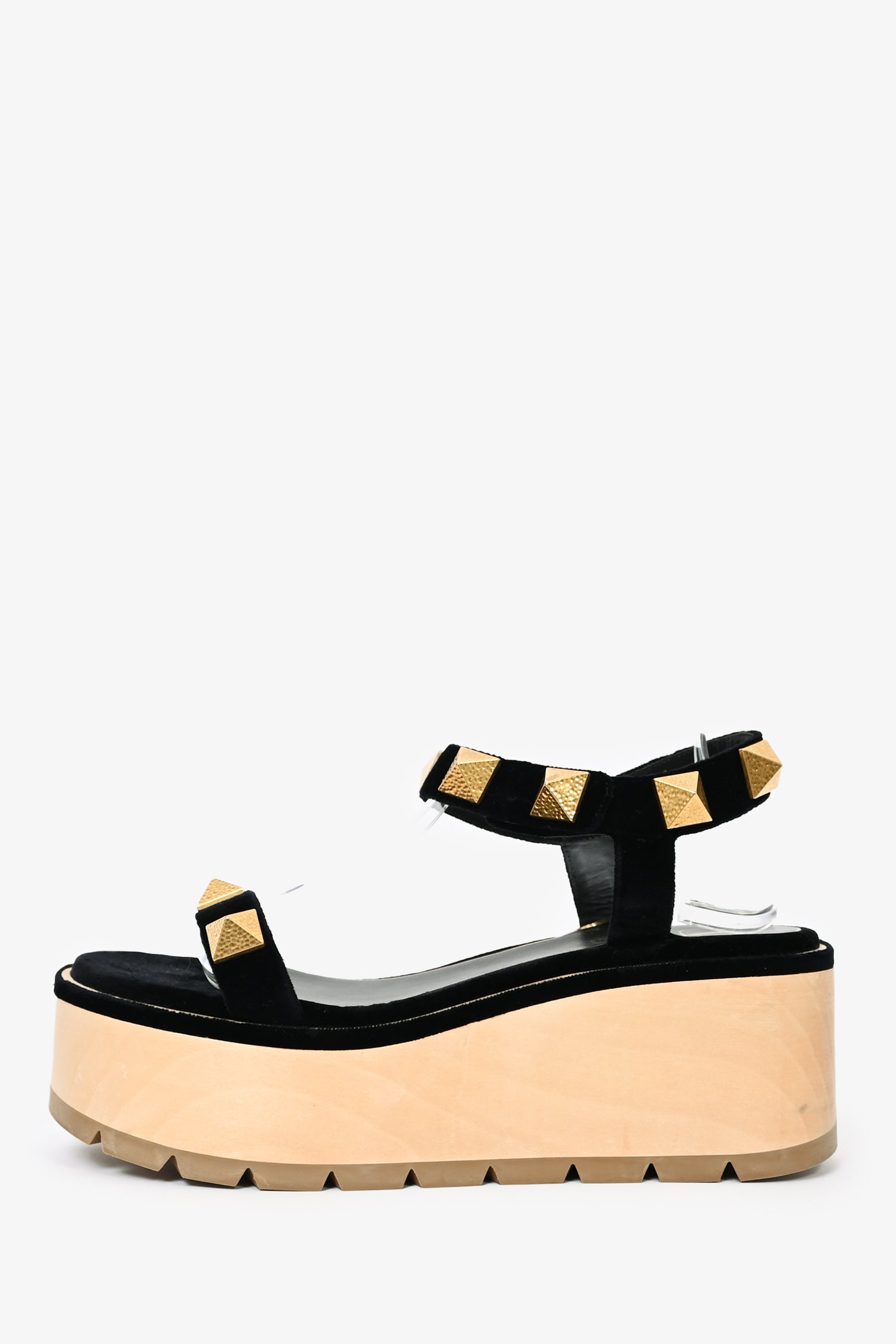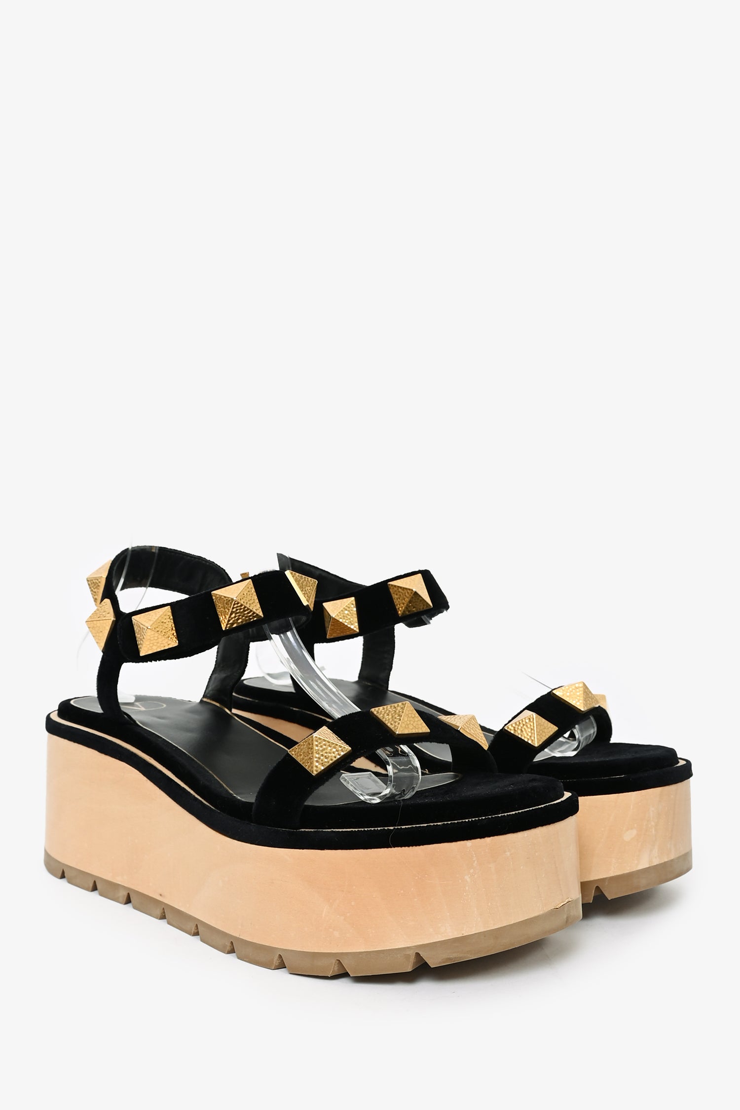 Refresh availabilityValentino Black/Gold Velvet 'Roman Stud' Platform Sandals. Open toe. Ankle strap with snap-button closure. Gold-tone hardware. Tonal stitching.