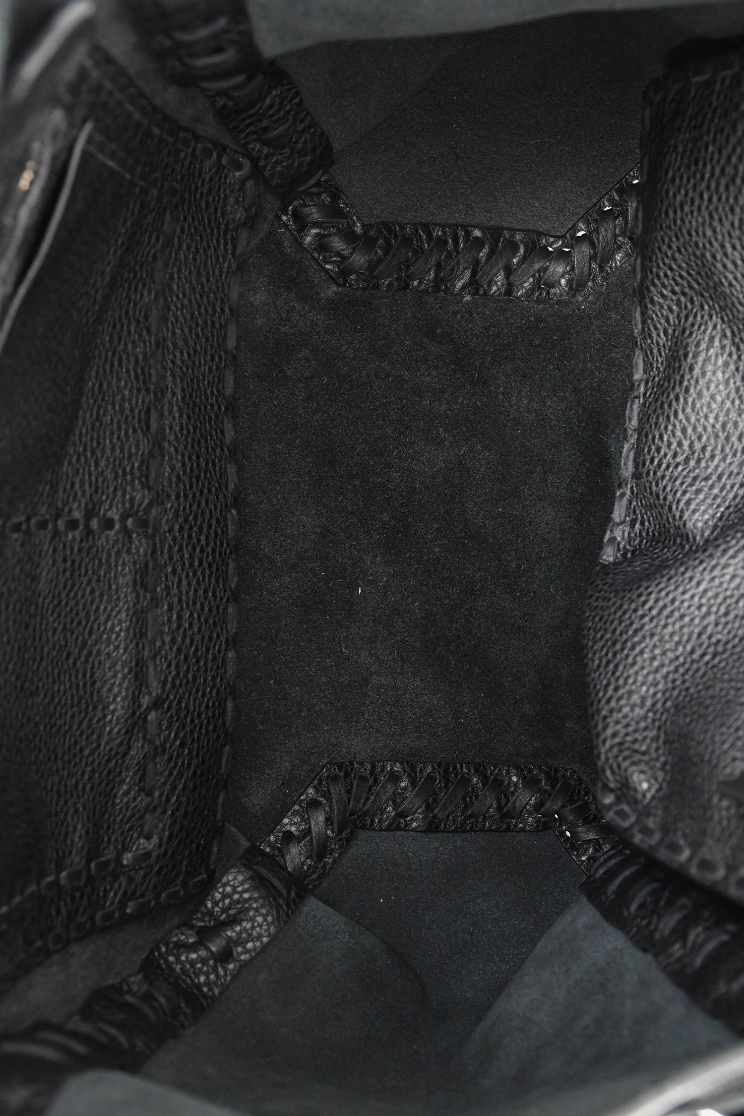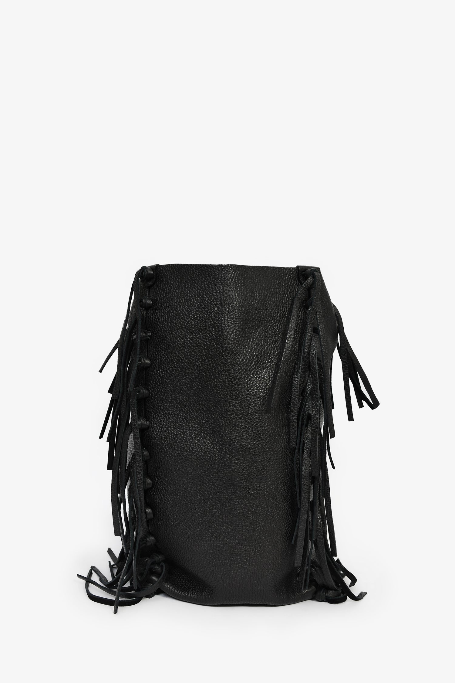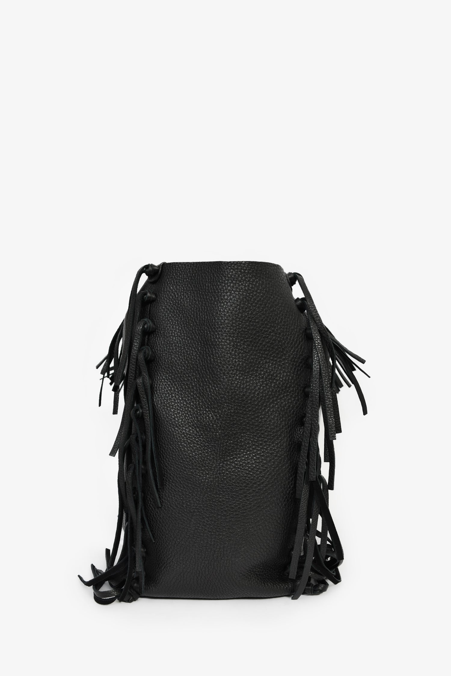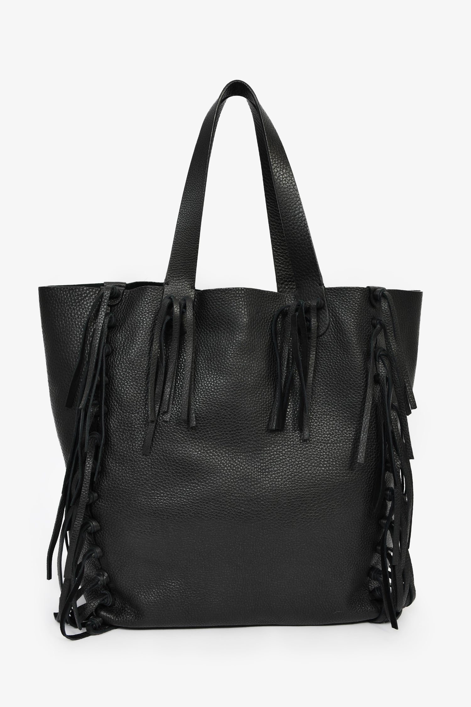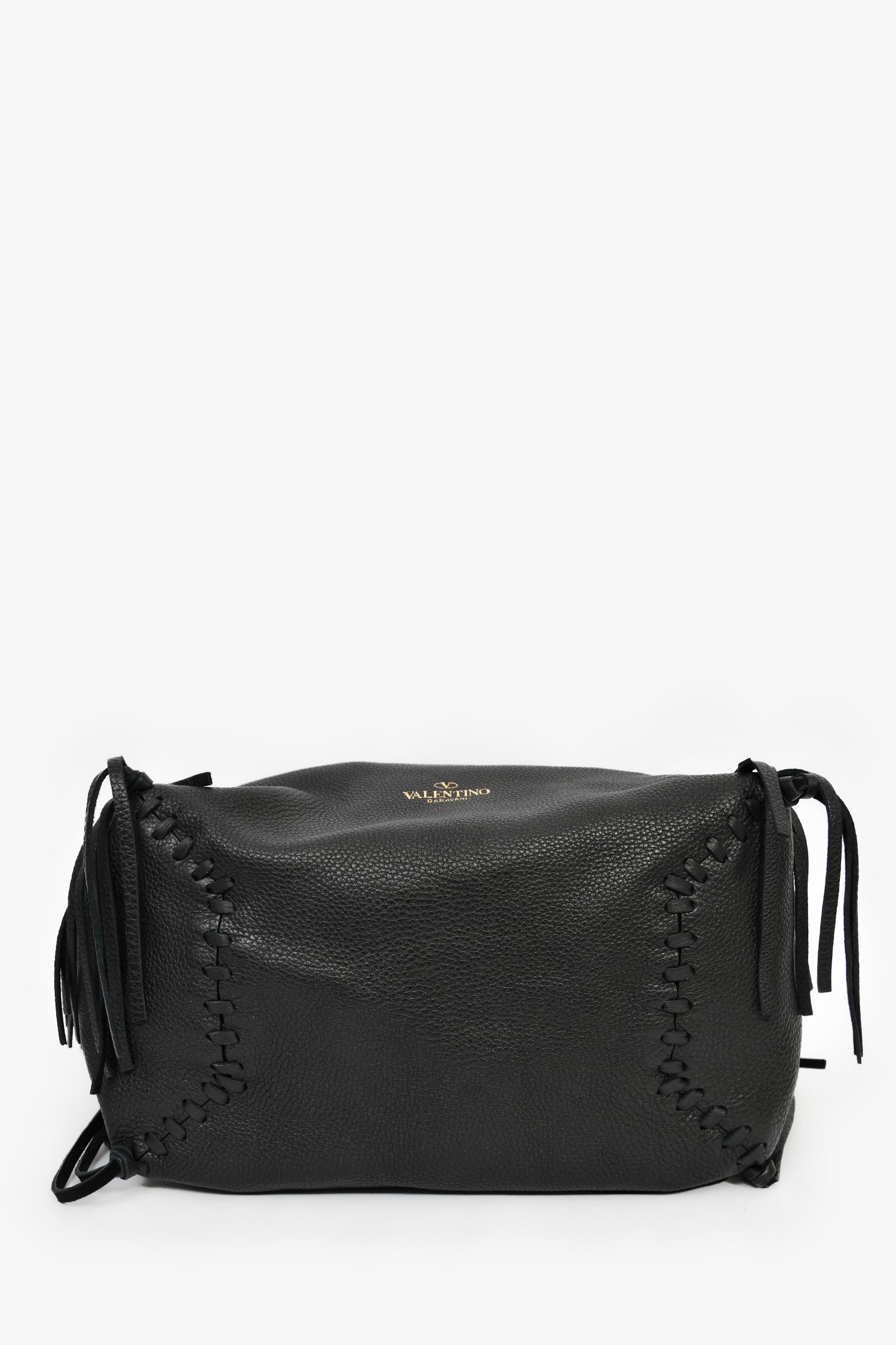 Refresh availabilityValentino Black Grained Leather Fringe Tote. Open interior. Dual flat handles. Suede-lined interior. 2 interior compartments, 2 zip and 2 slip pockets. Gold-tone hardware. Tonal stitching.