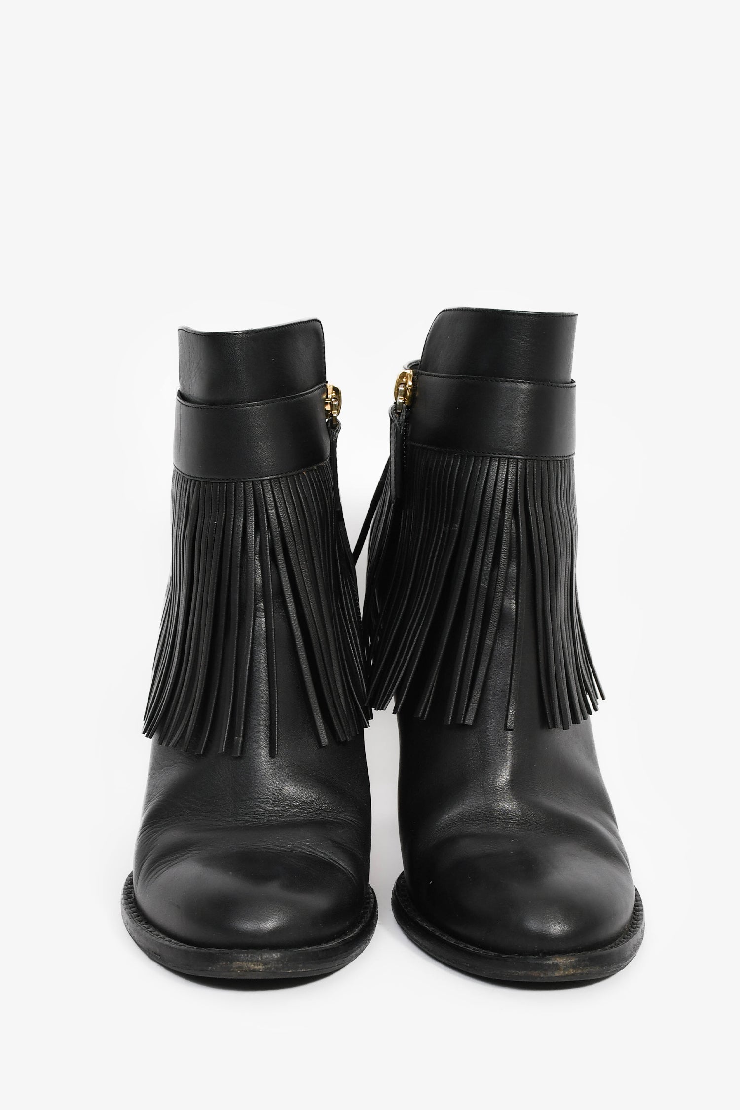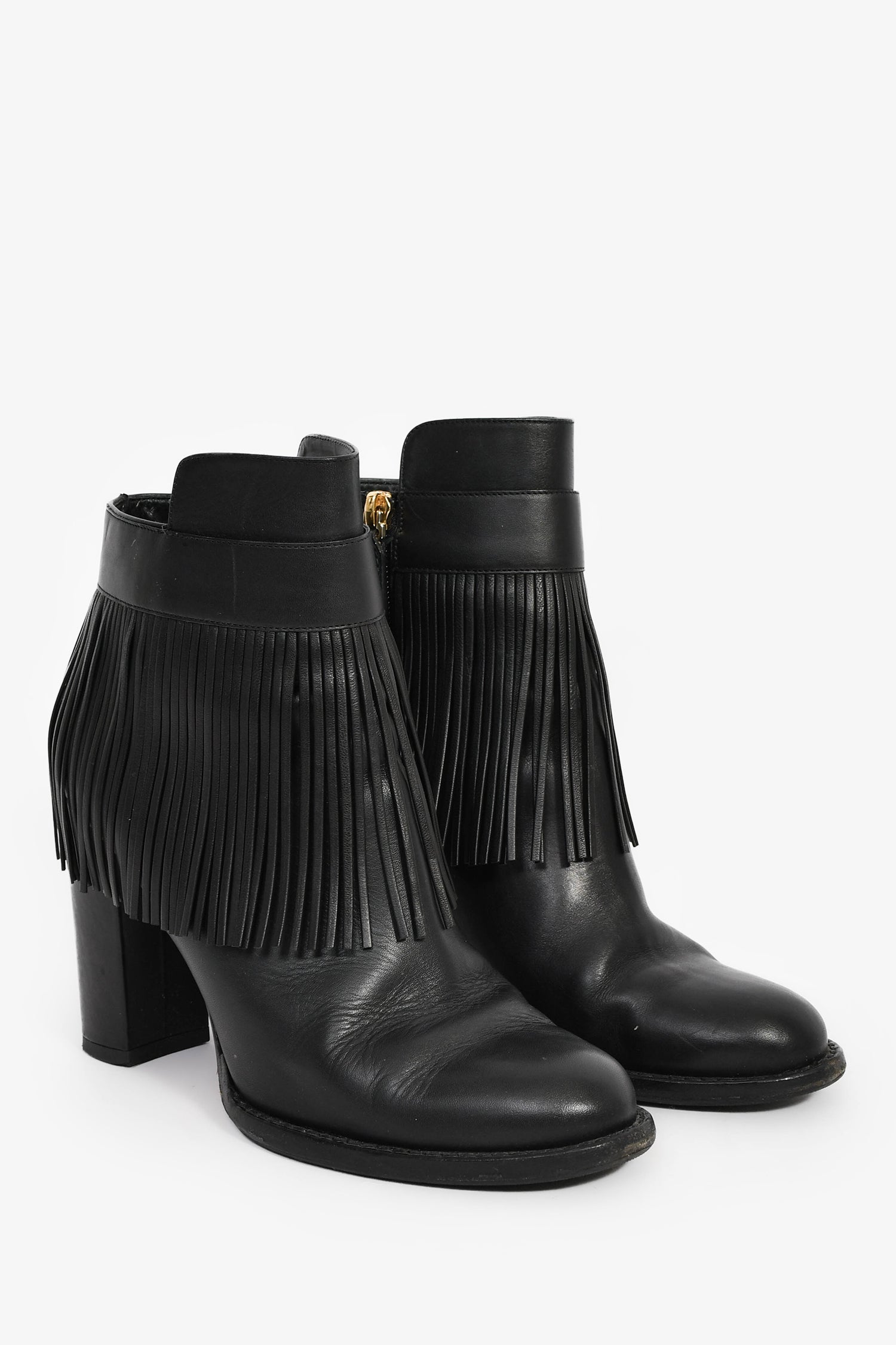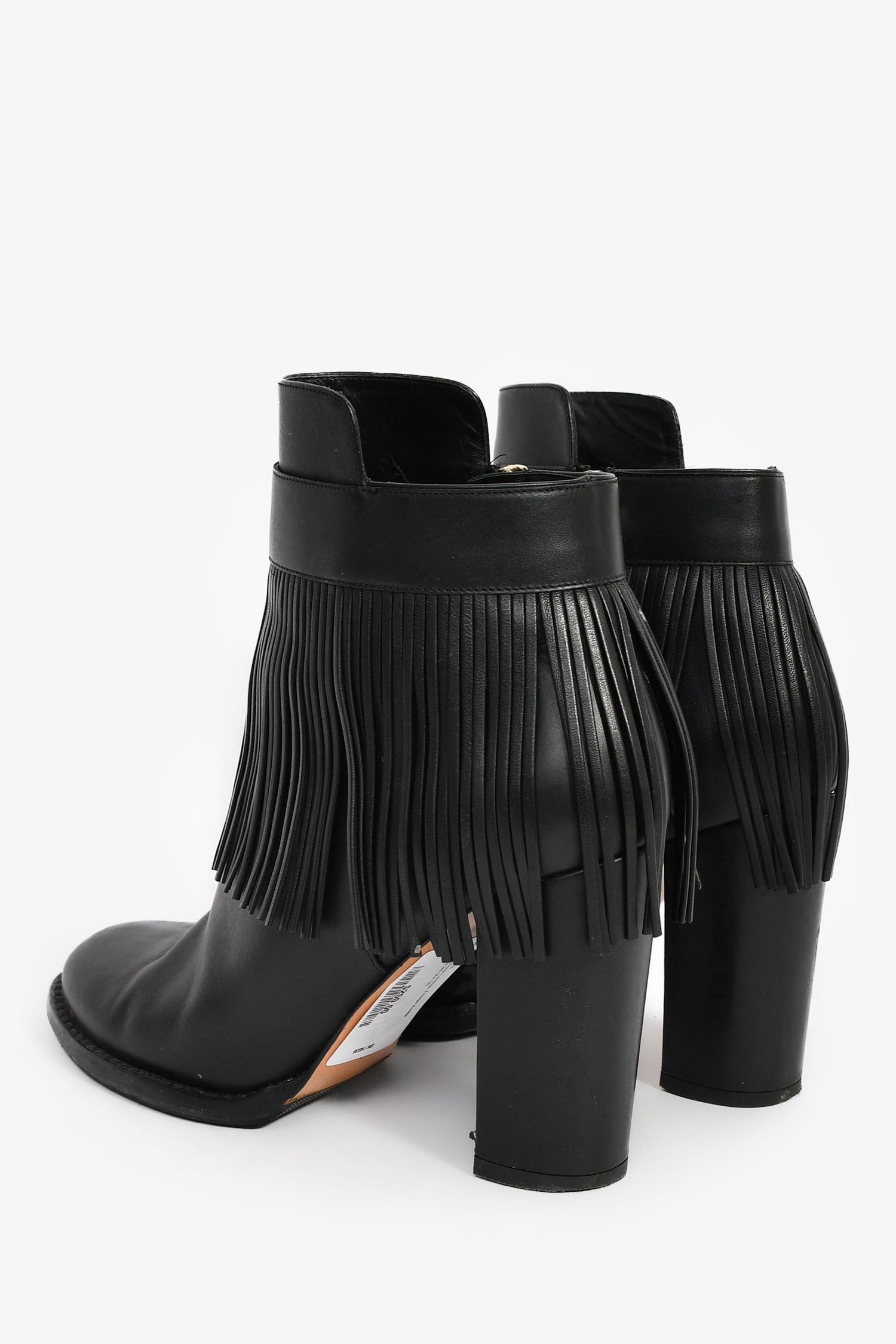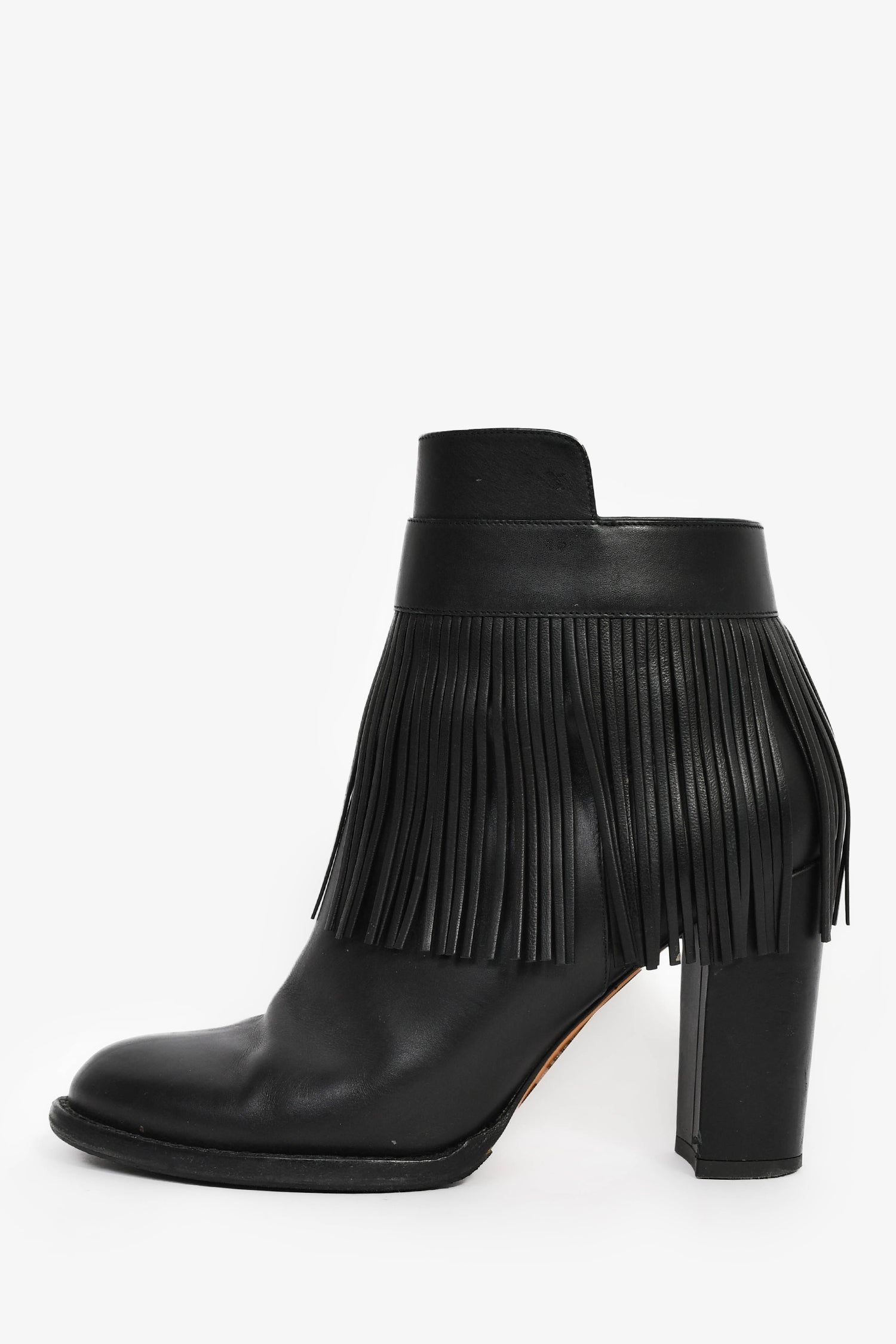 Refresh availabilityValentino Black Leather Fringe Ankle Boots. Slip-on. Almond toe. Side zip closure. Lined leather interior. Tonal stitching.