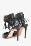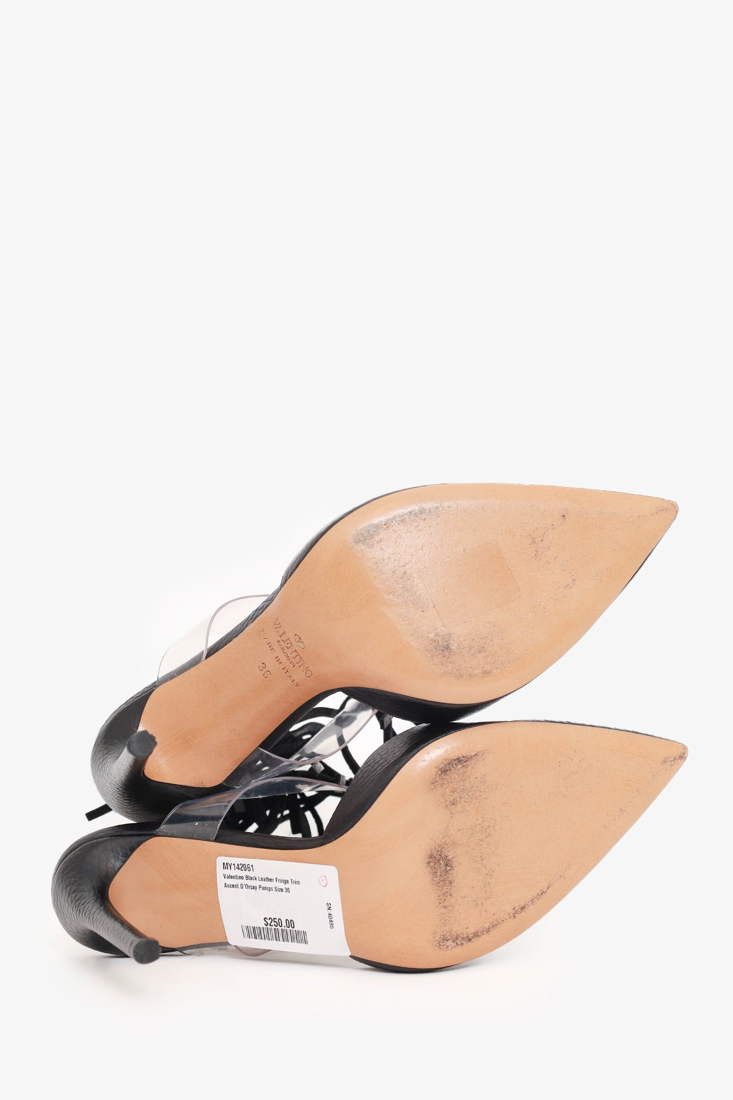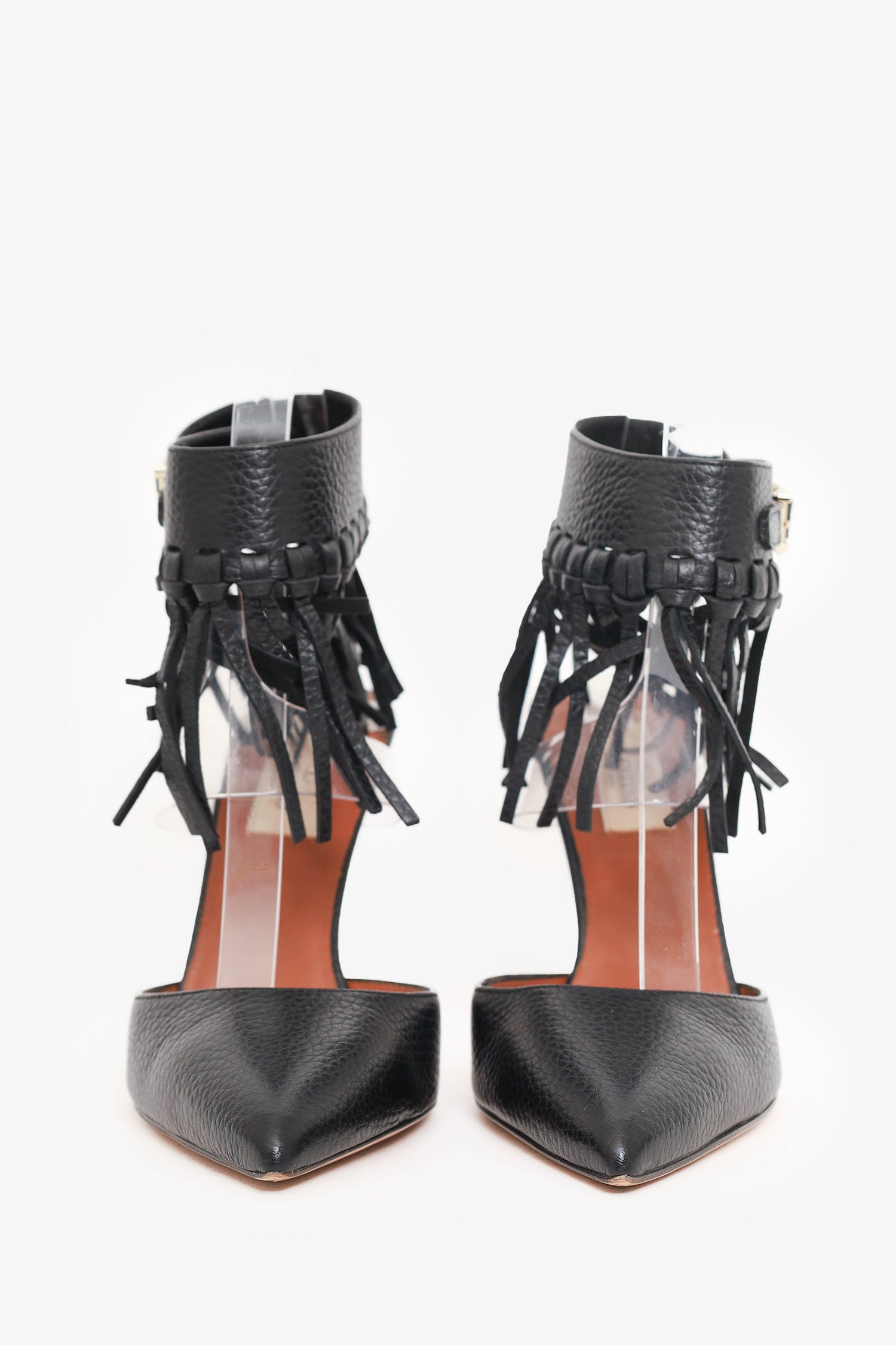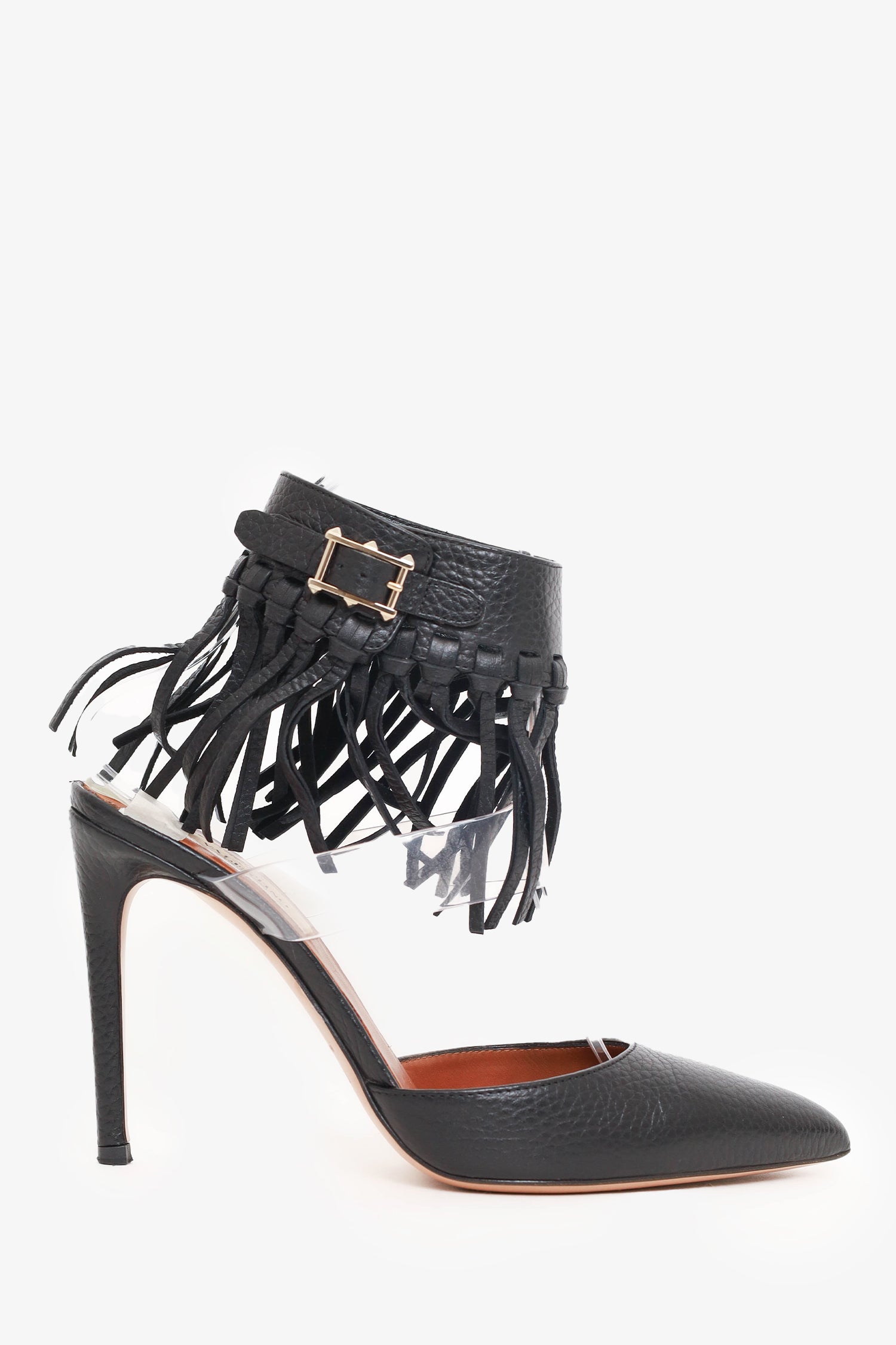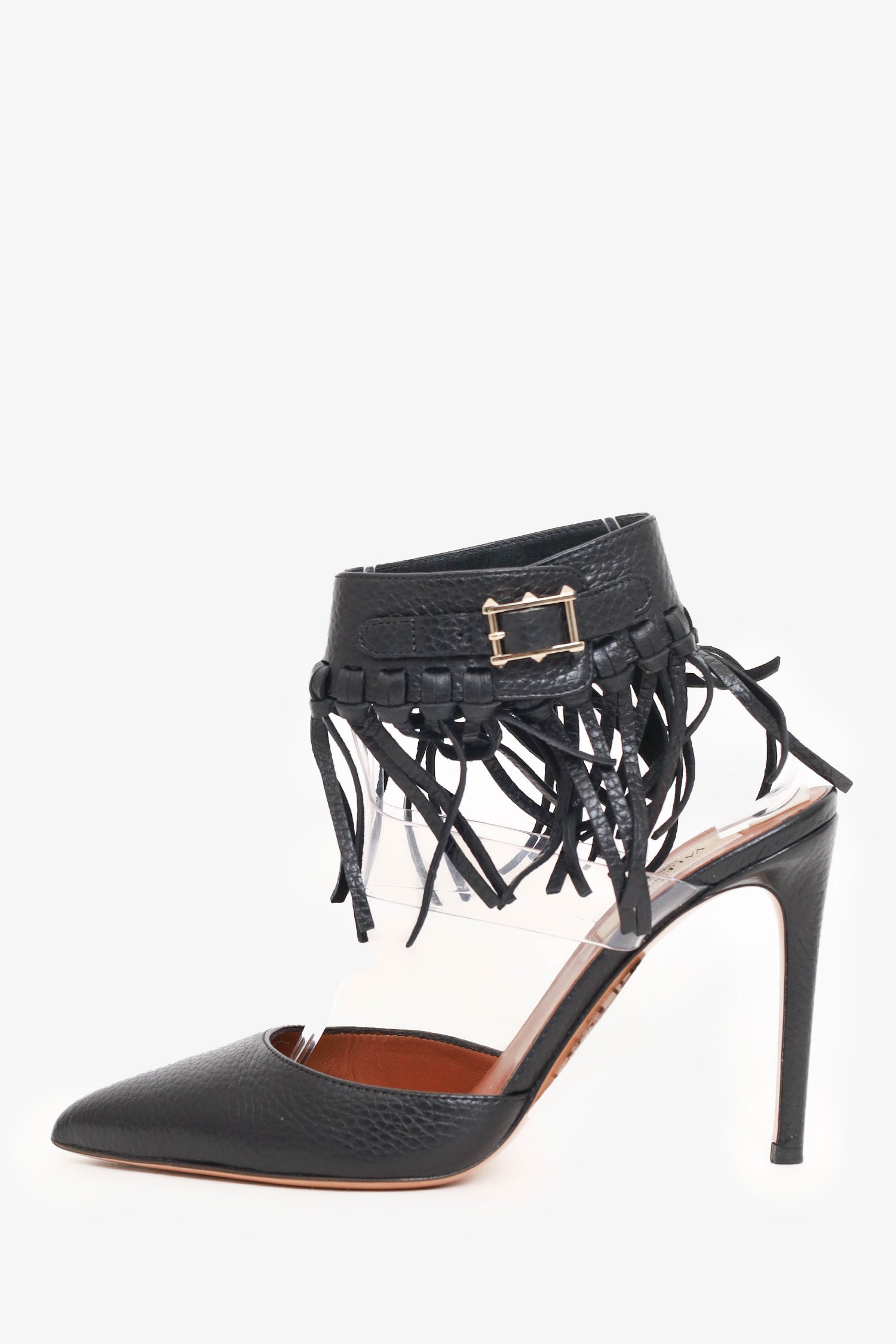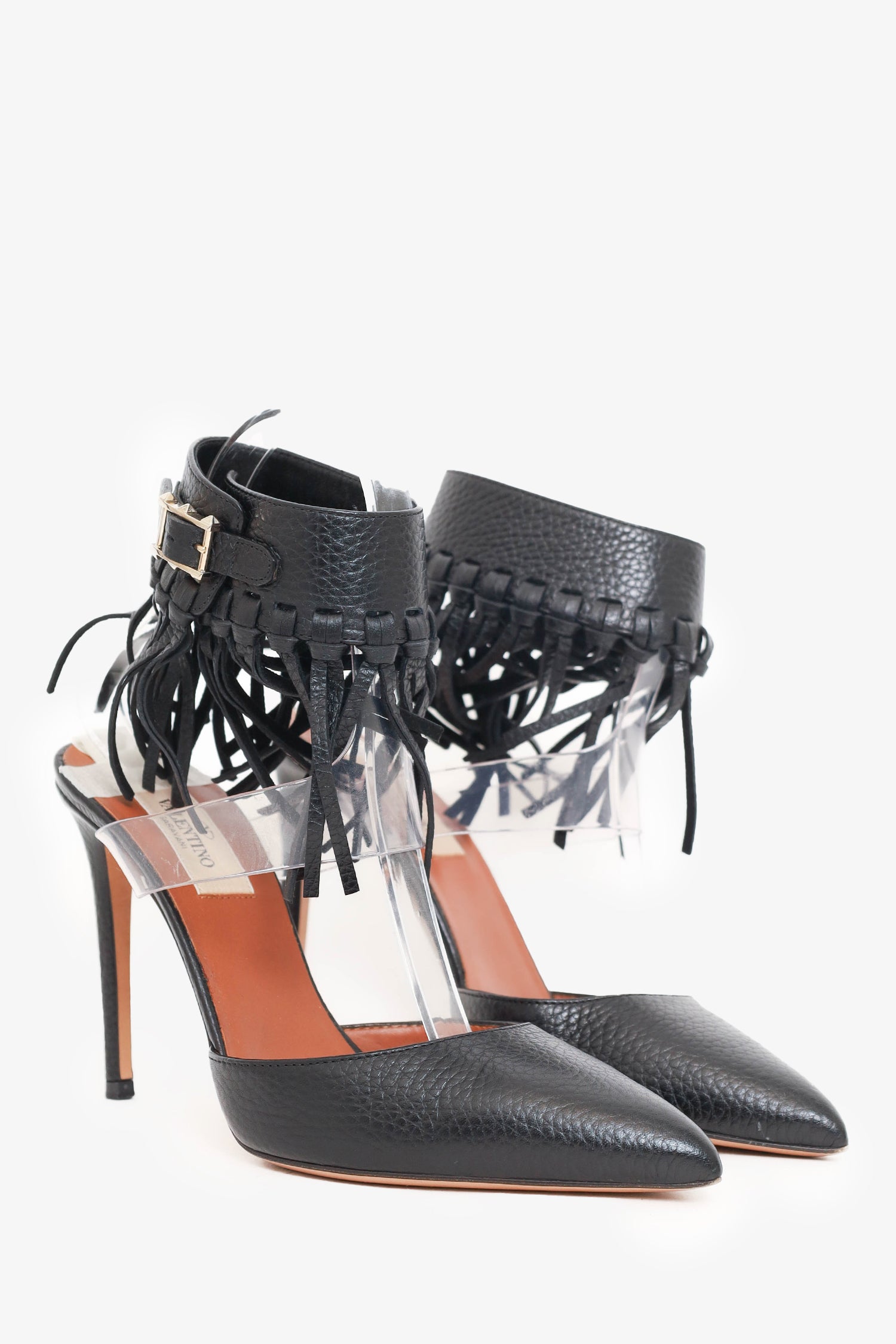 Refresh availabilityValentino Black Leather Fringe Trim Accent D'Orsay Pumps. Slip-on. Adjustable ankle strap with pull-through buckle closure. Pointed toe. Silver-tone hardware. Tonal stitching.
