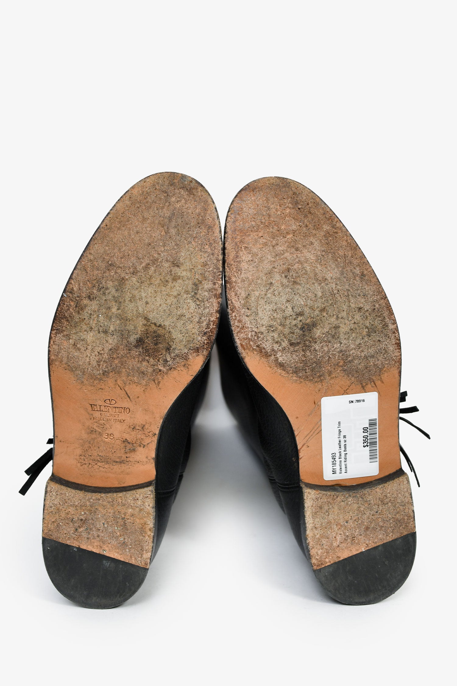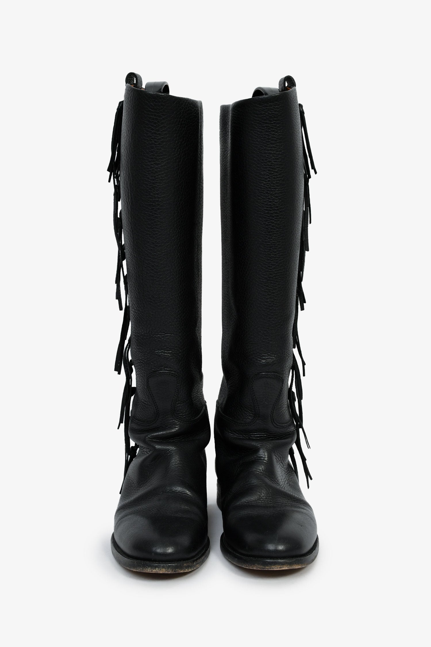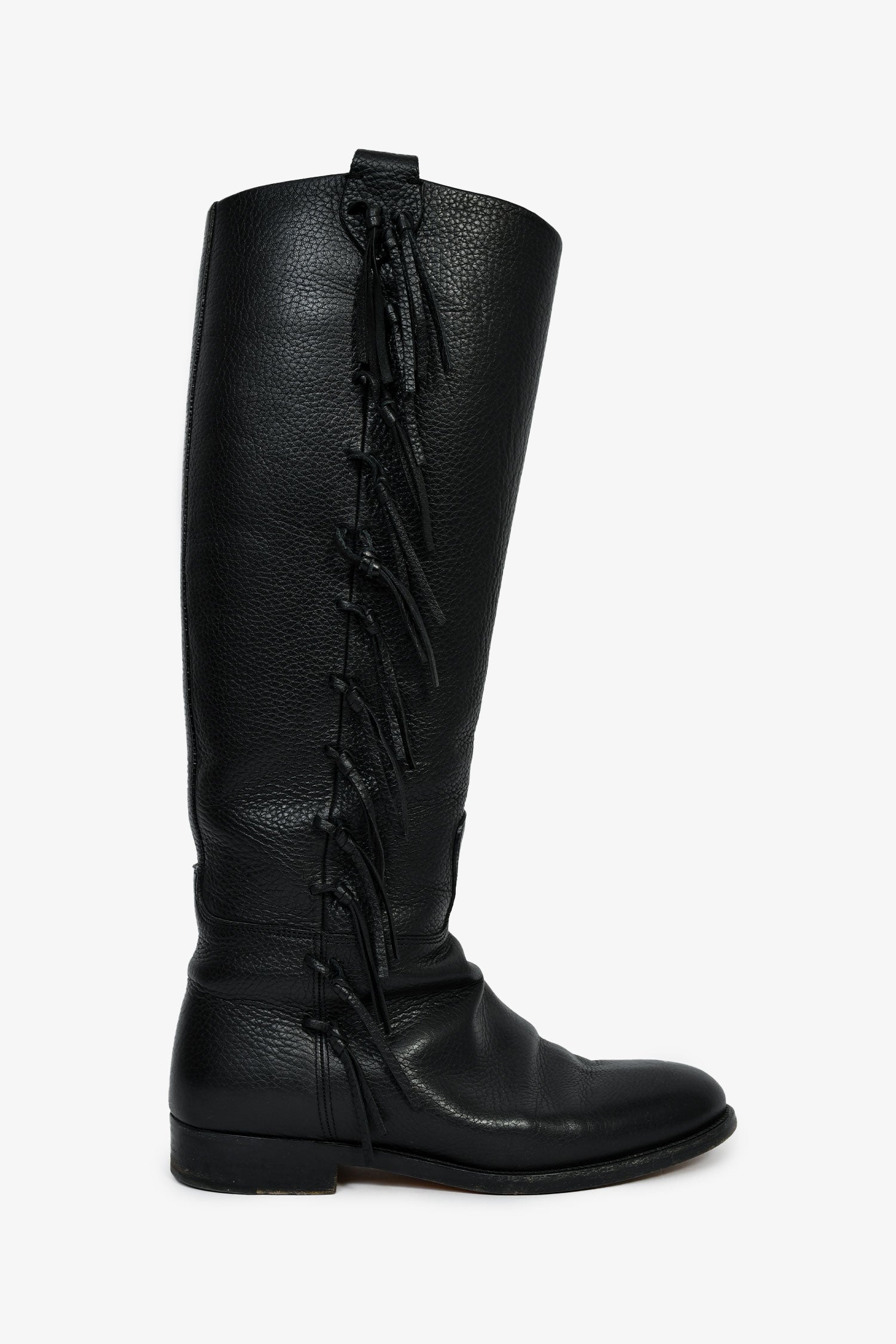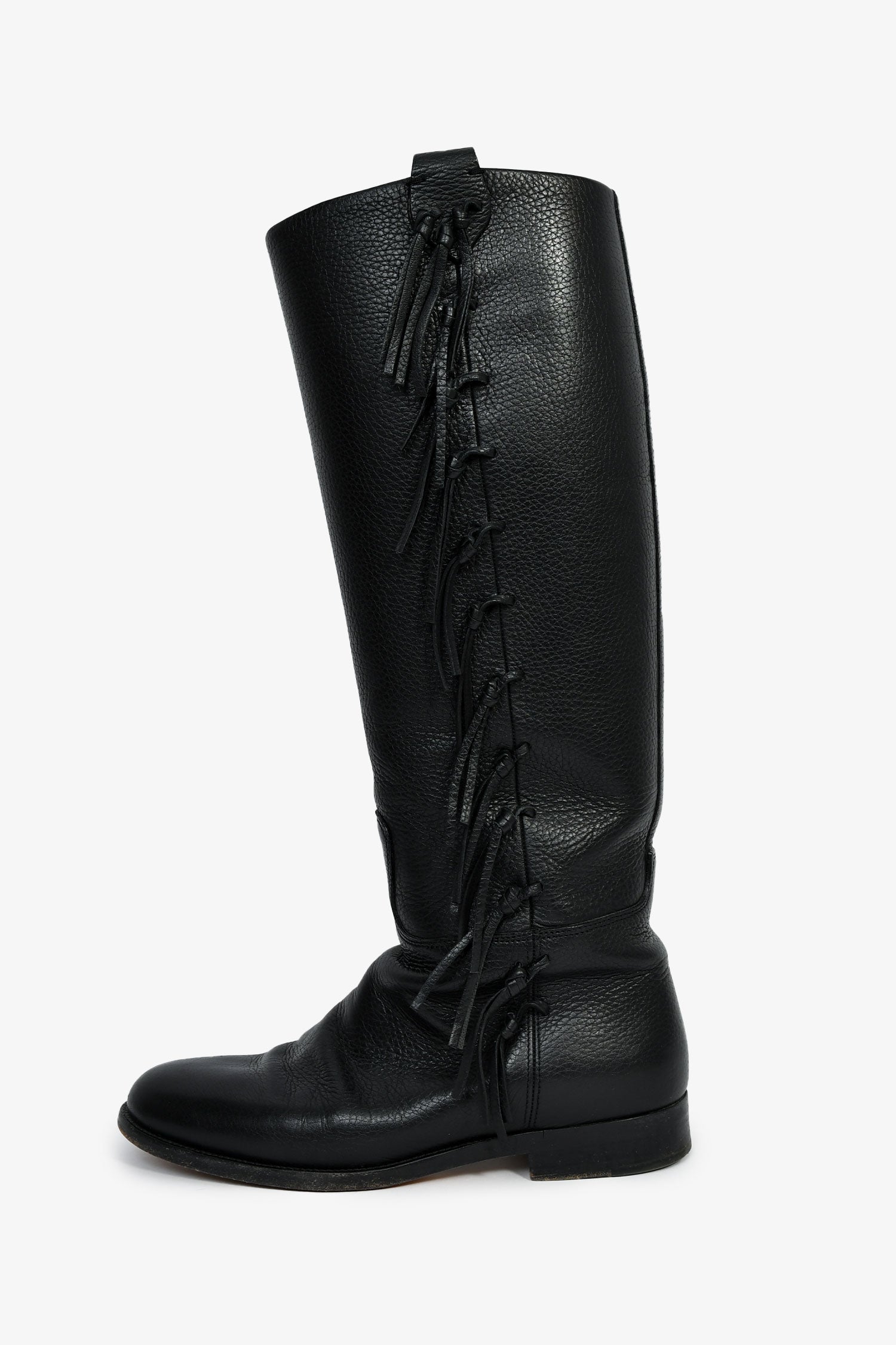 Refresh availabilityValentino Black Leather Fringe Trim Accent Riding Boots. Pull-on. Round toe. Tonal stitching.