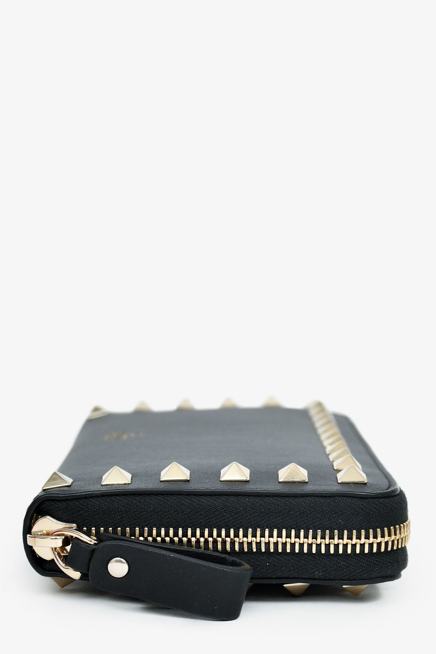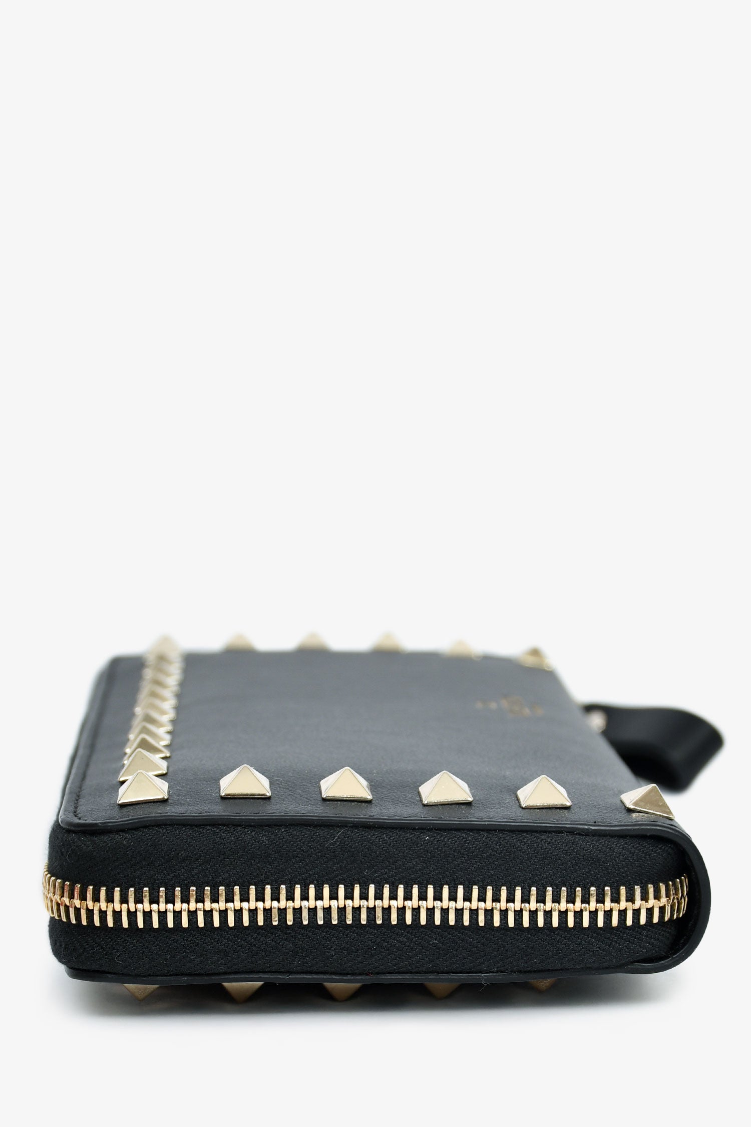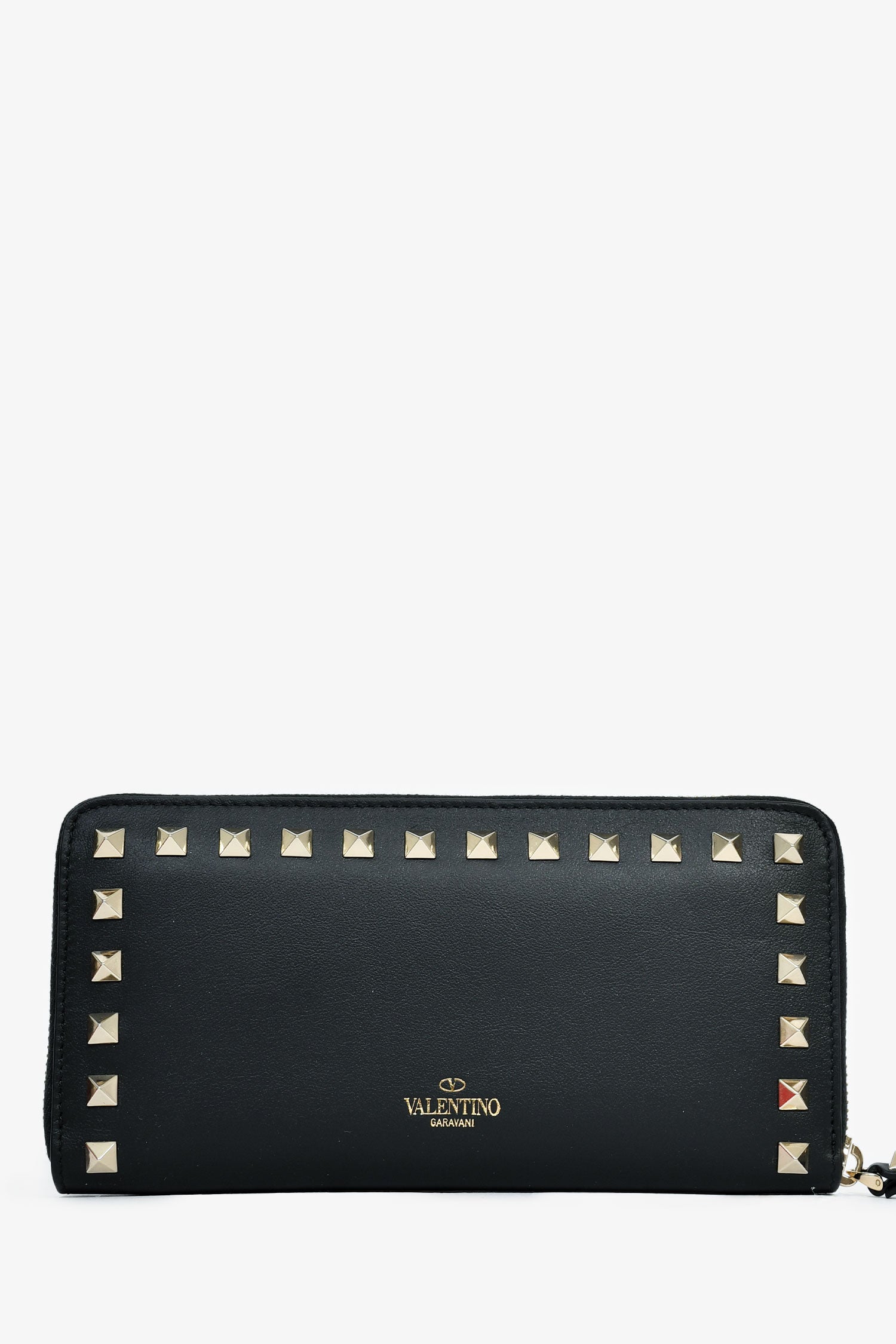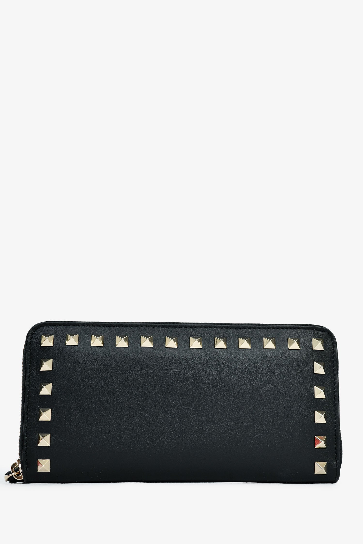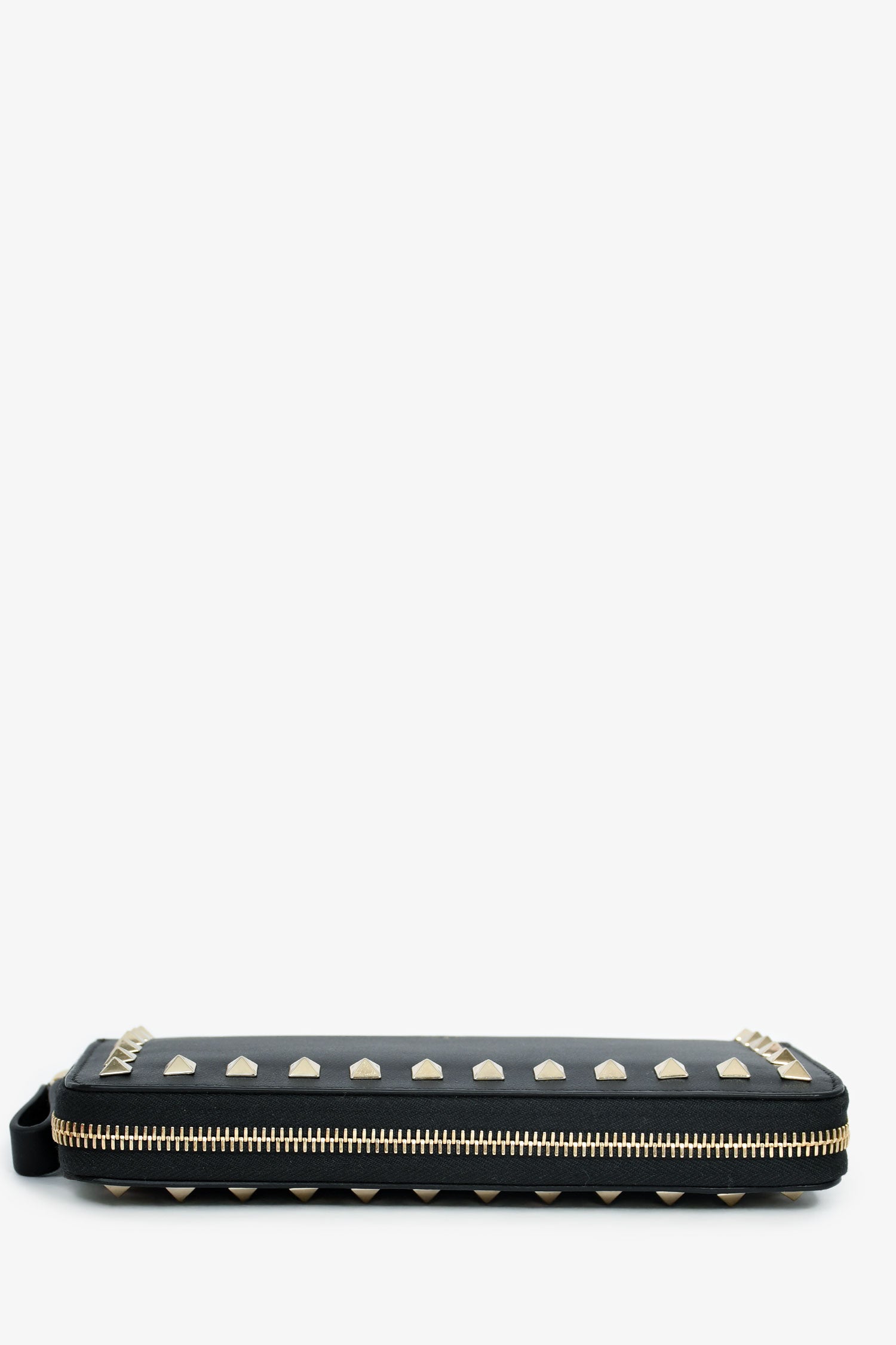 Refresh availabilityValentino Black Leather Gold Rockstud Long Zip Wallet. Top zip closure. Twelve card slots. Three billfold compartments. One zippered coin compartment. Gold-tone hardware.