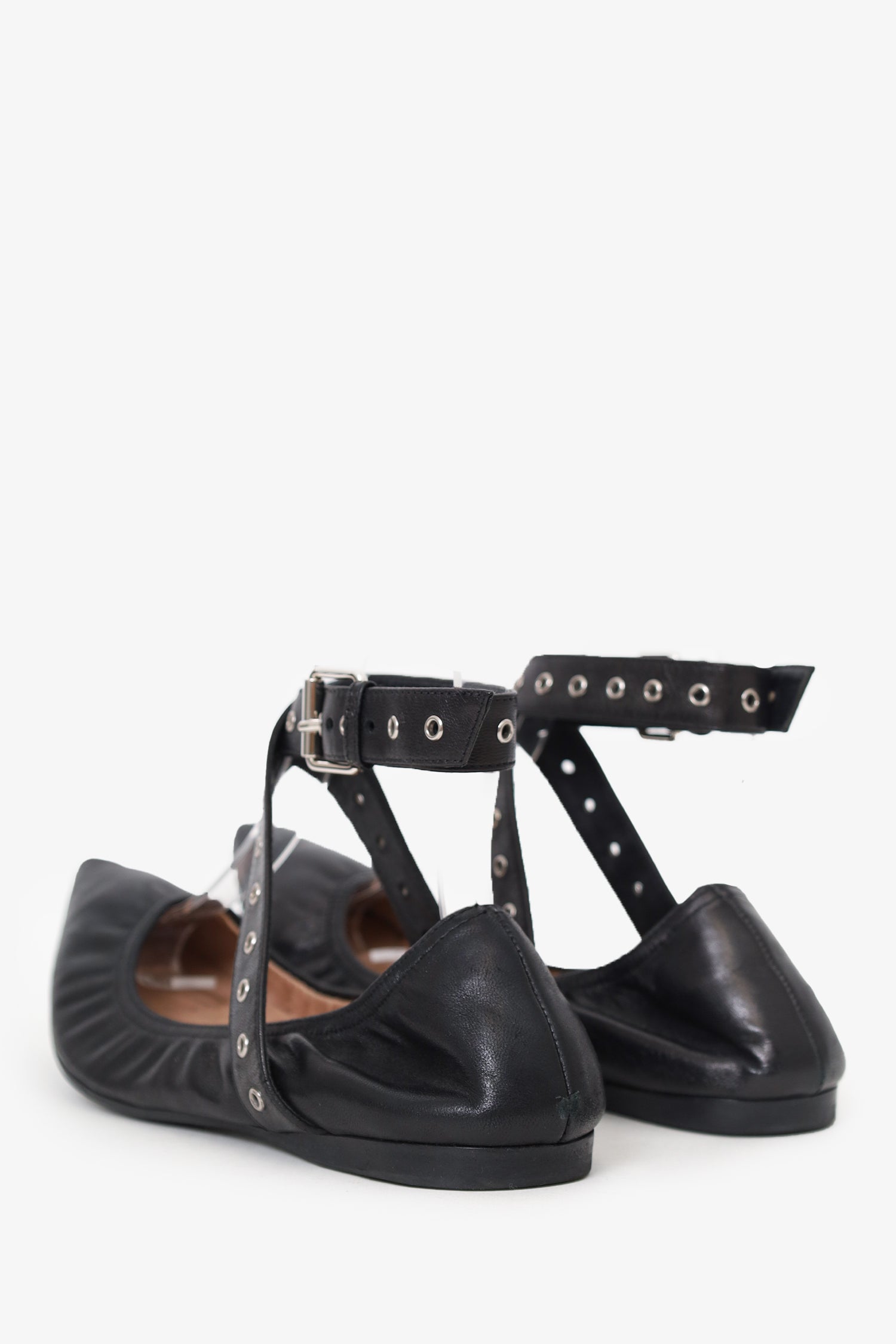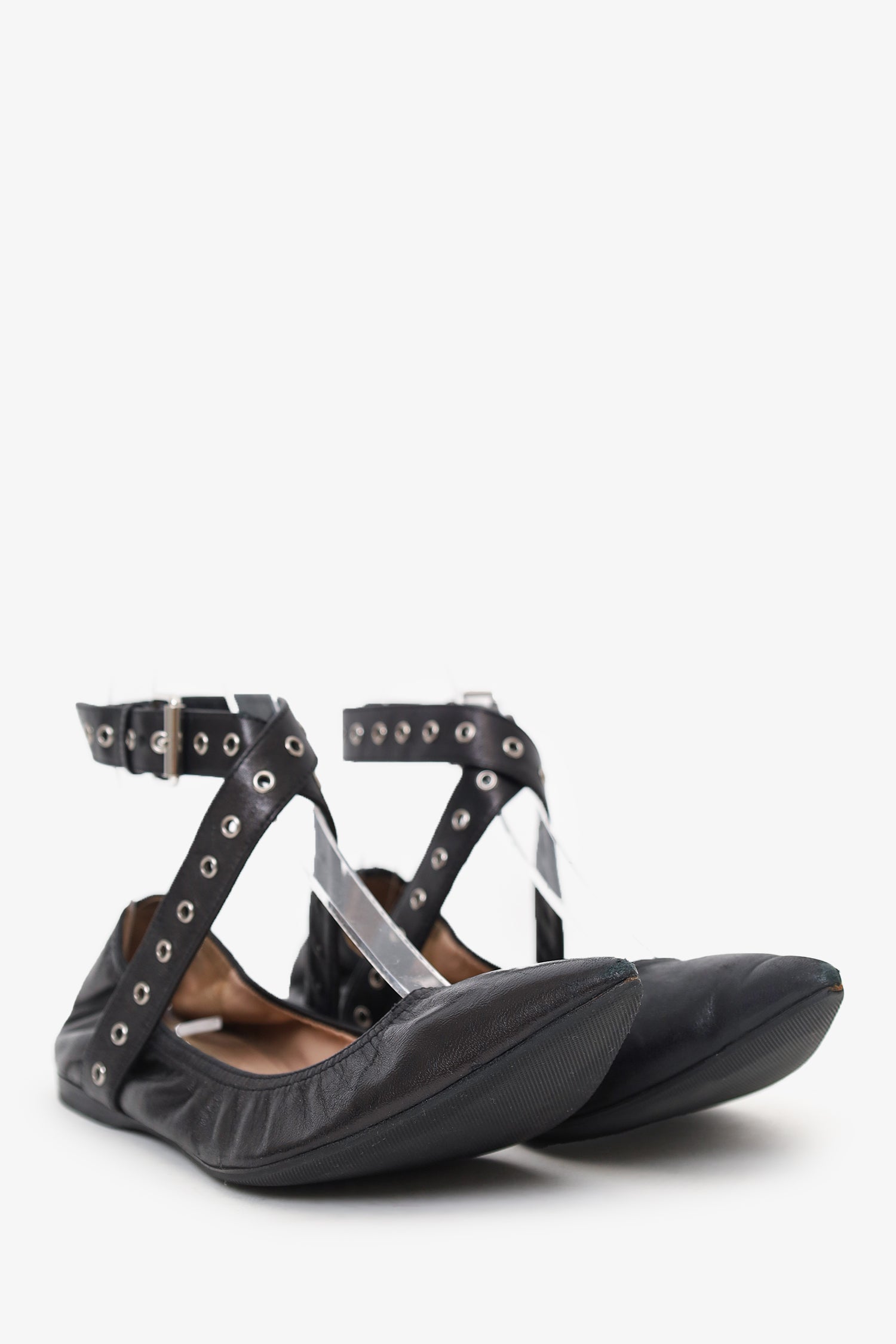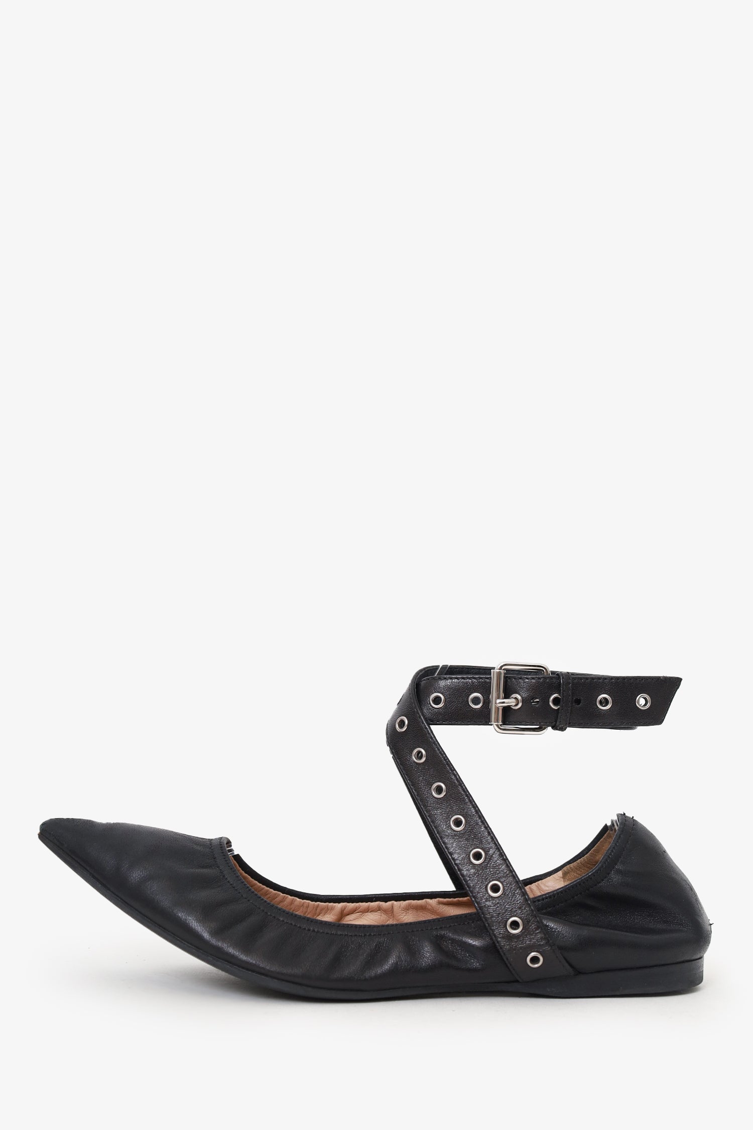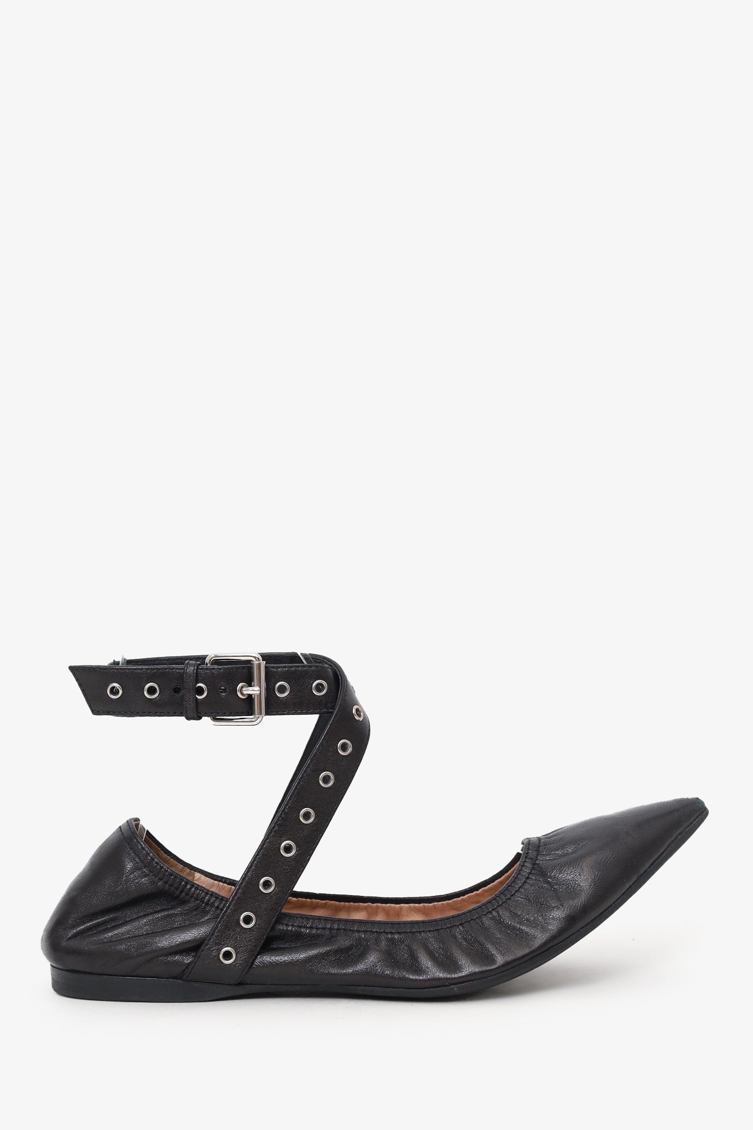Refresh availabilityValentino Black Leather Pointed Ankle Strap Flats. Pull-on. Pointed toe. Wrap-around adjustable buckle closure at ankle. Silver-tone hardware. Tonal stitching.