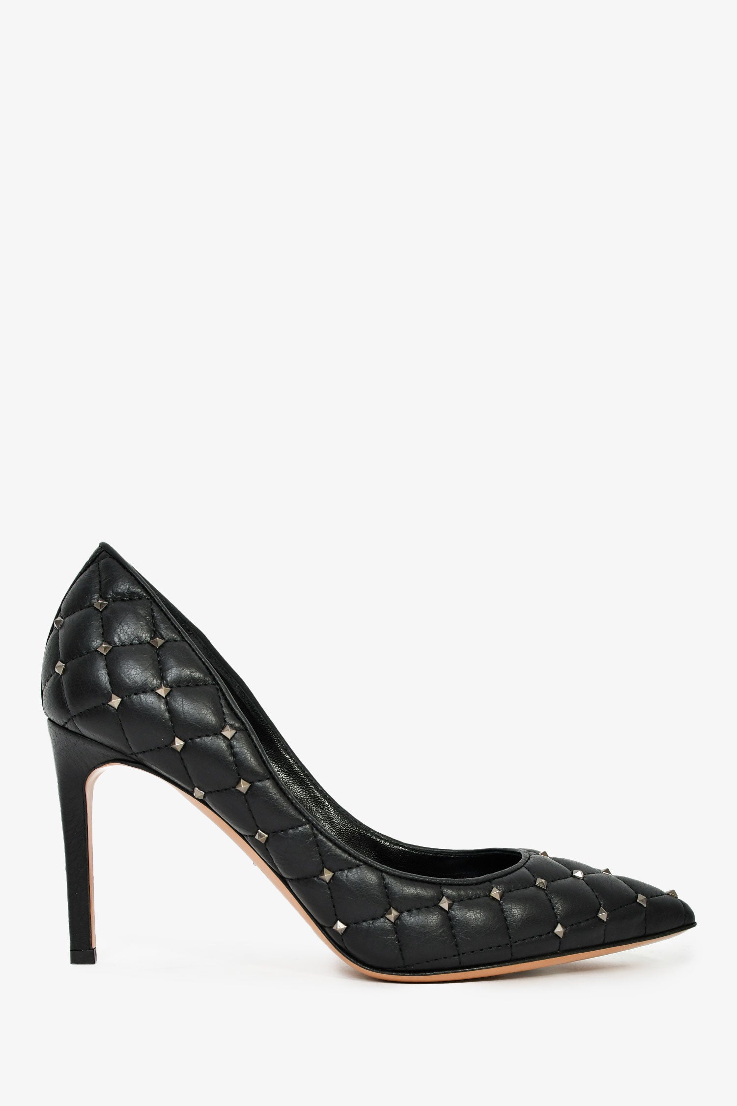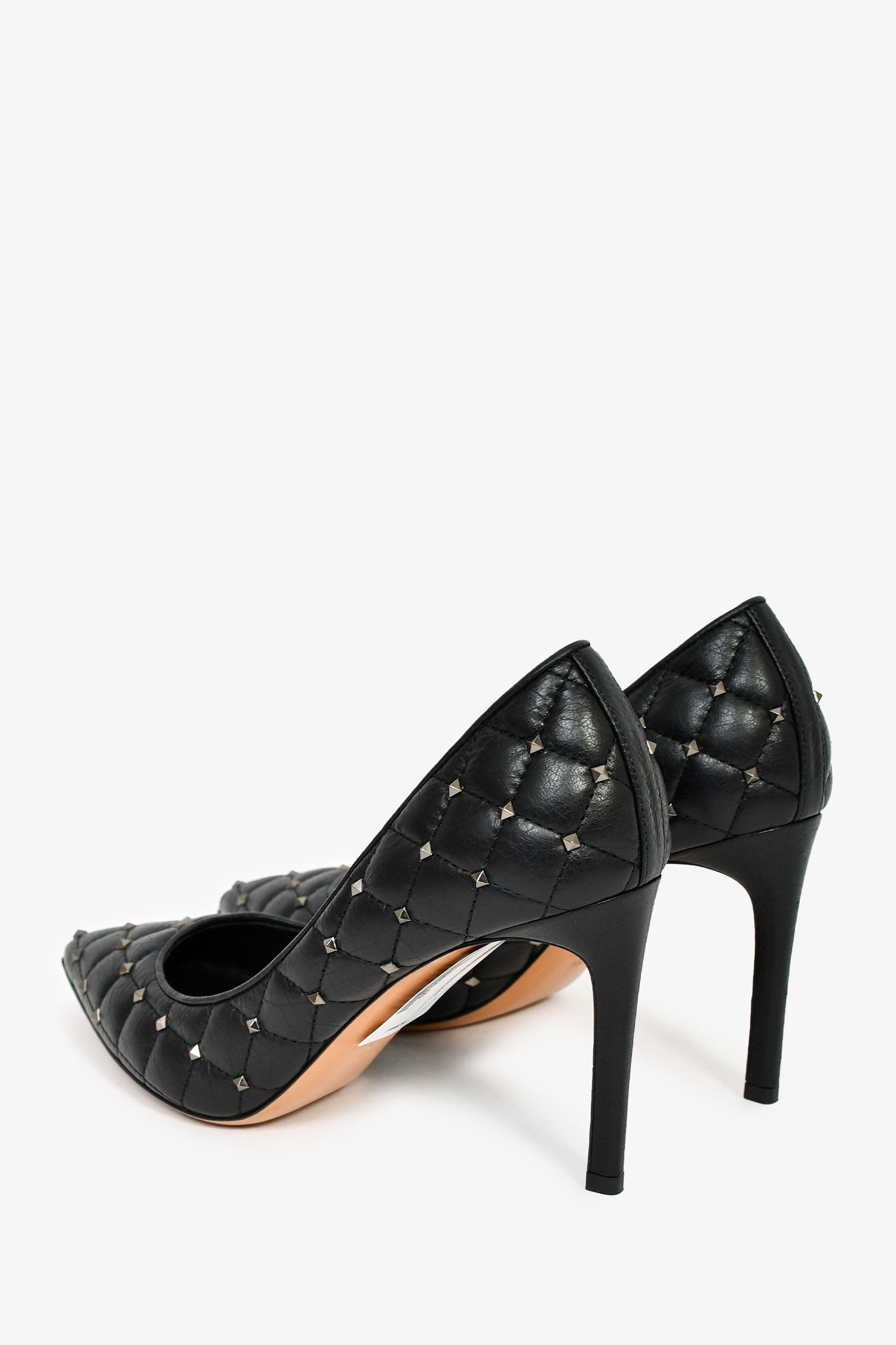 Refresh availabilityValentino Black Leather Quilted Pattern Spike Pumps. Pointed toes. Leather insoles. Gunmetal hardware. Tonal stitching.