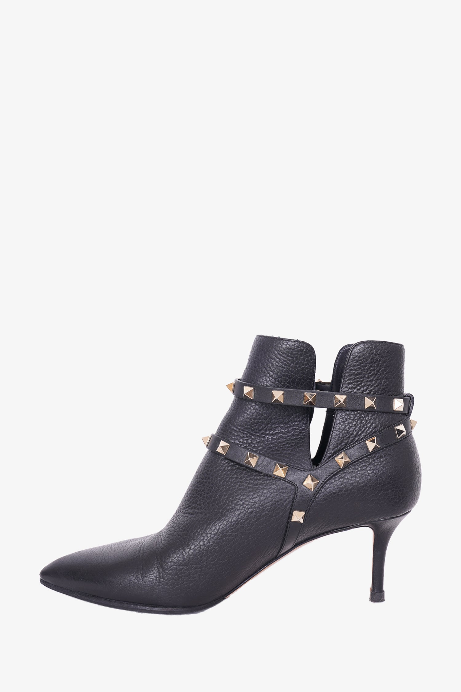 Refresh availabilityValentino Black Leather Rockstud Ankle Boots. Pointed toe. Slip-on. Gold-toned hardware. Tonal stitching.