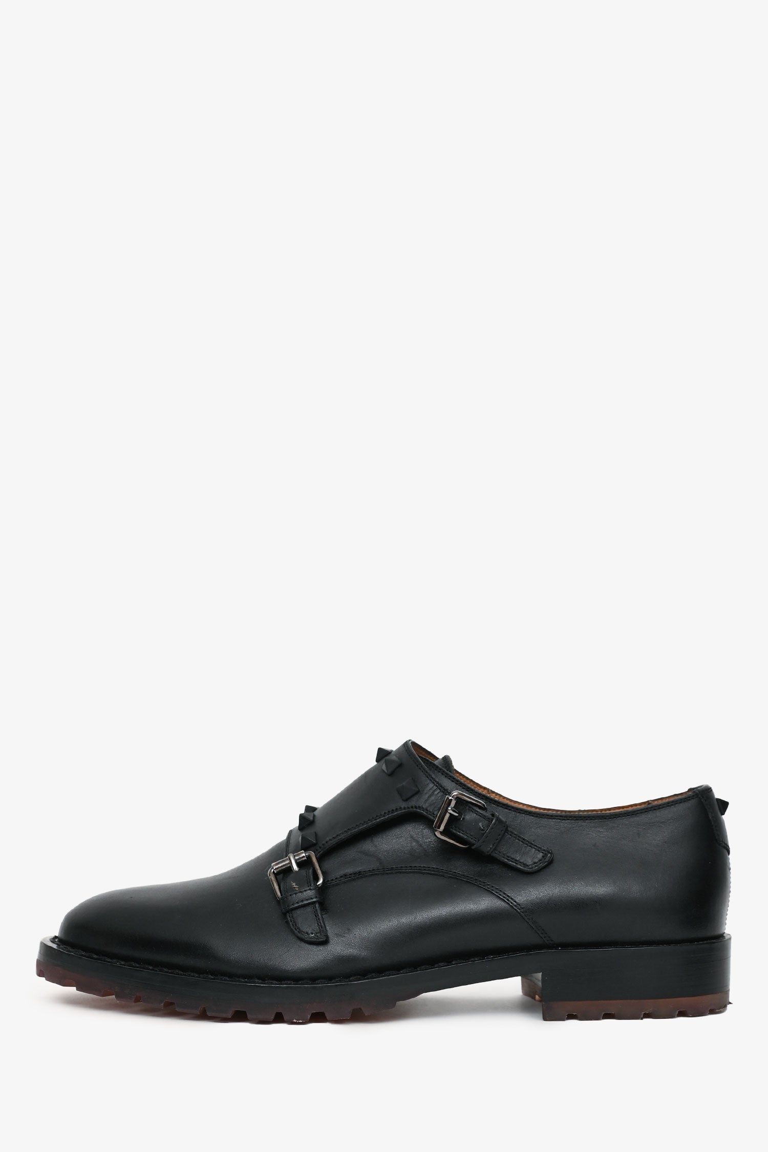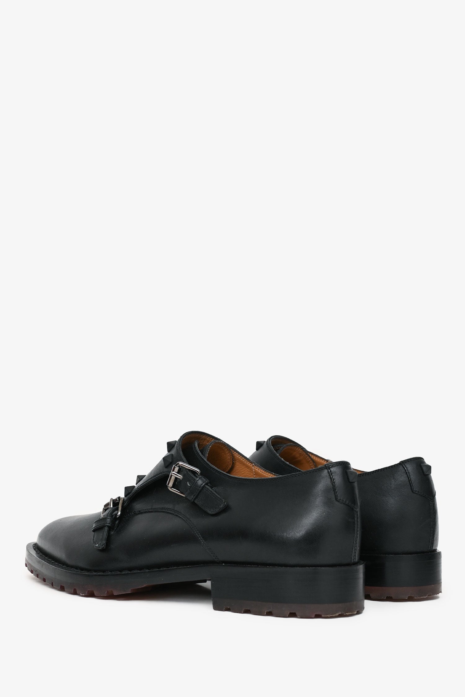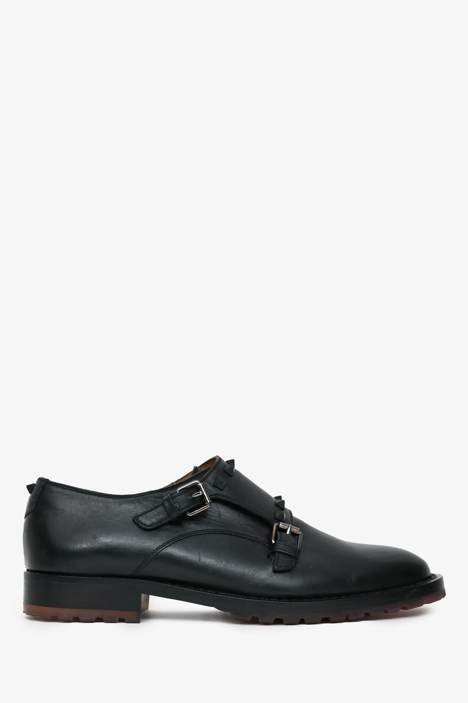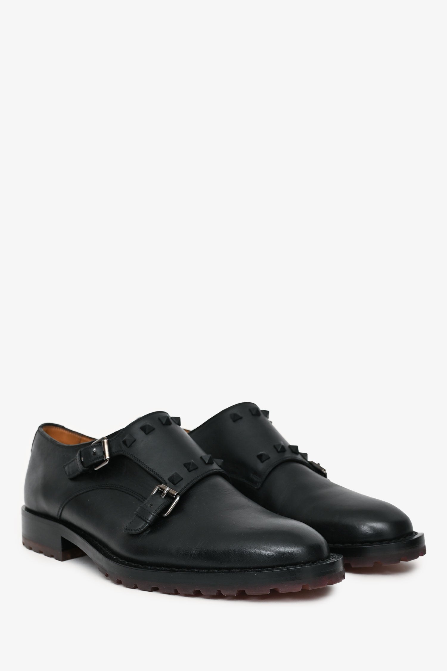 Refresh availabilityValentino Black Leather Rockstud Brogues. Dual adjustable strap closures. Tonal rockstud detailing on fold-over flap and back of heels. Chrome-tone hardware. Tonal stitching.