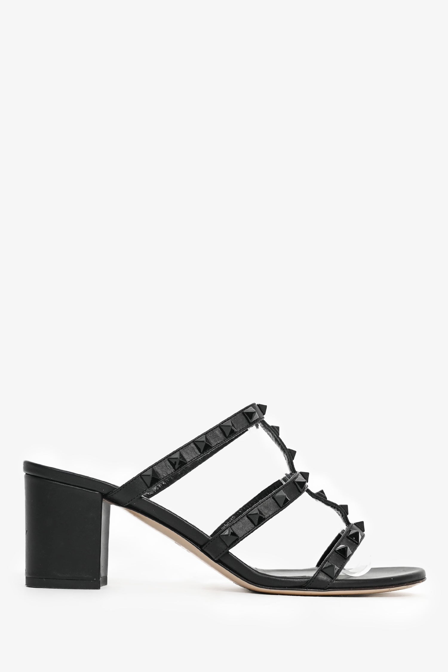 Refresh availabilityValentino Black Leather Rockstud Cage Block Sandals. Open toe. Slip-on. Tonal stitching.