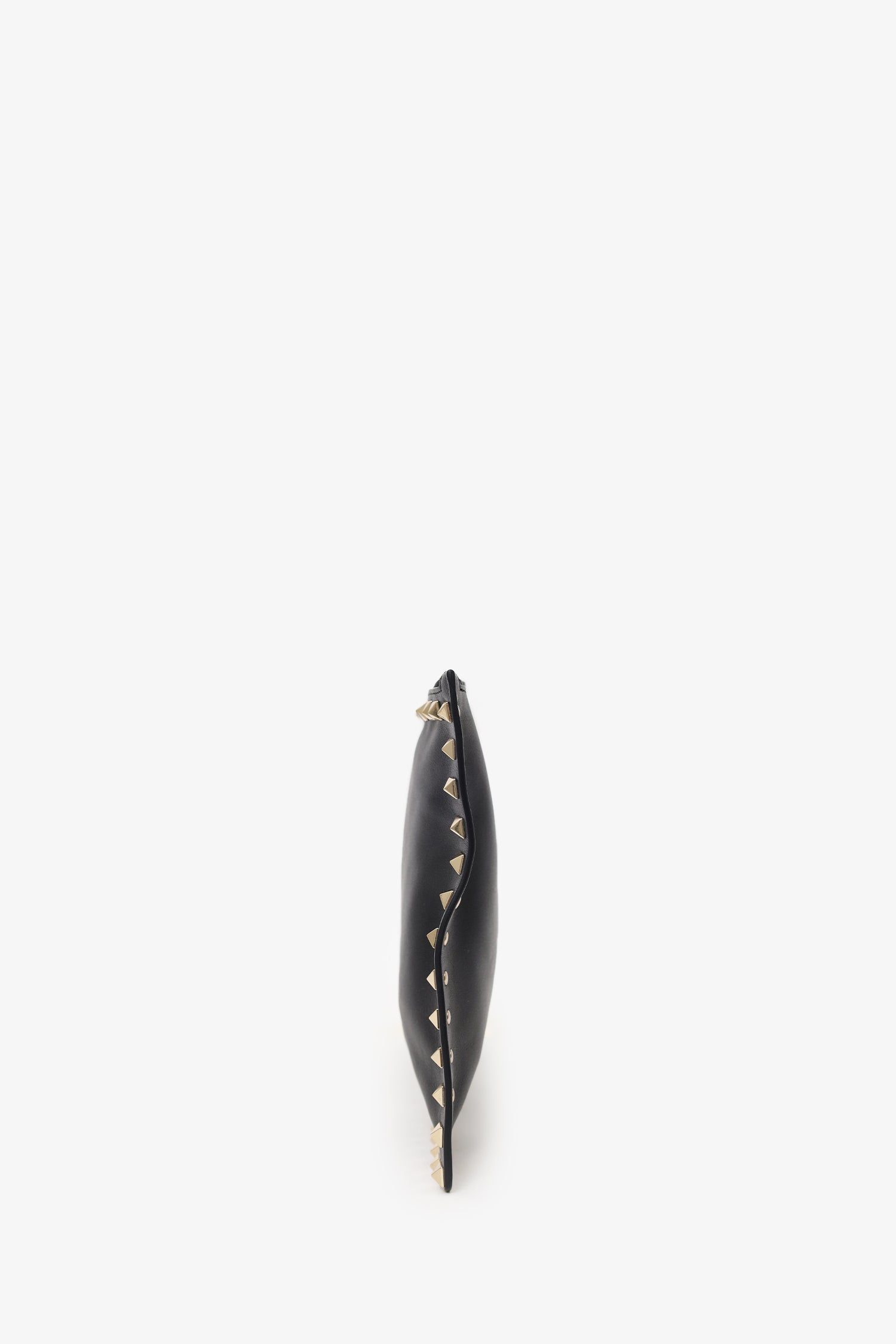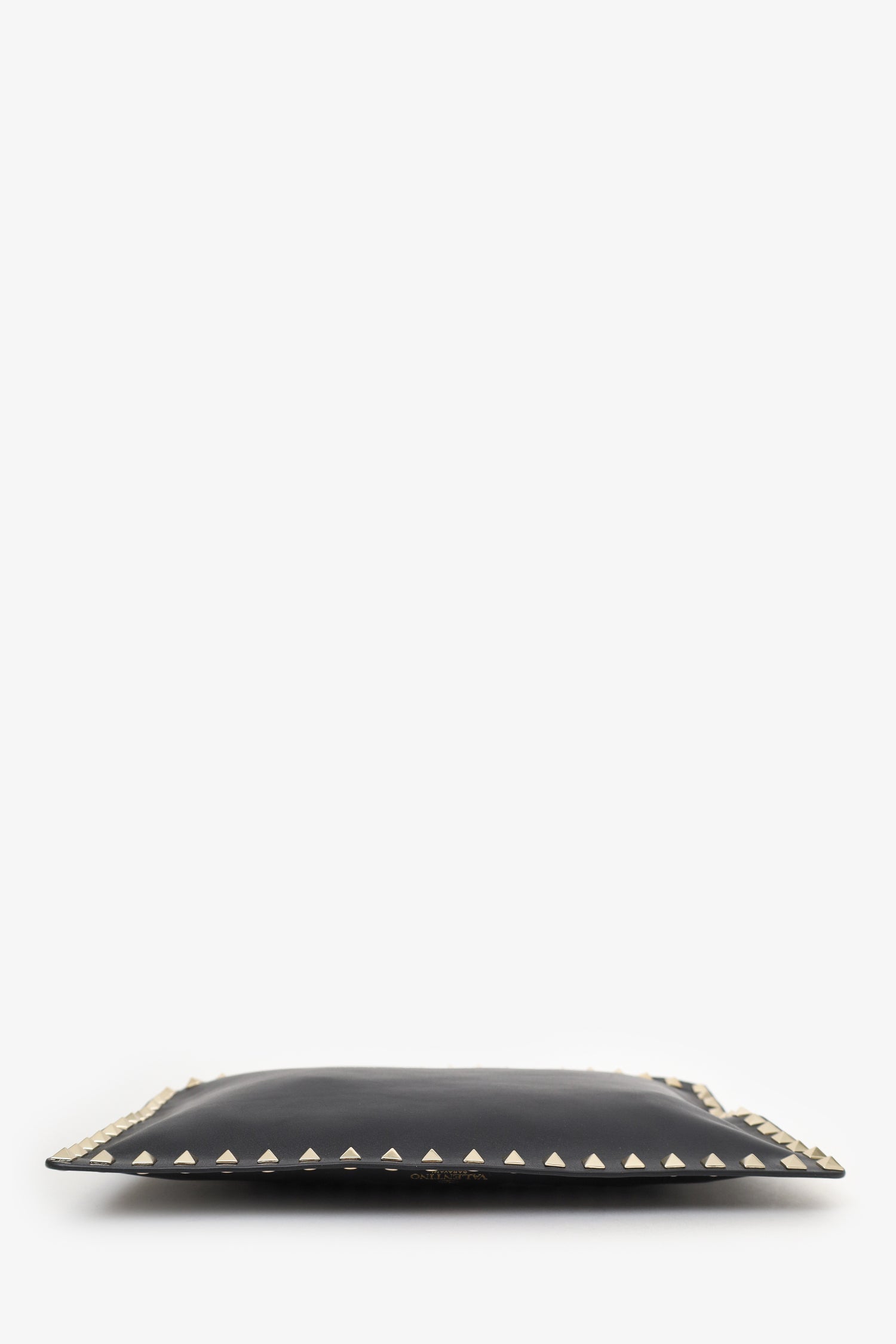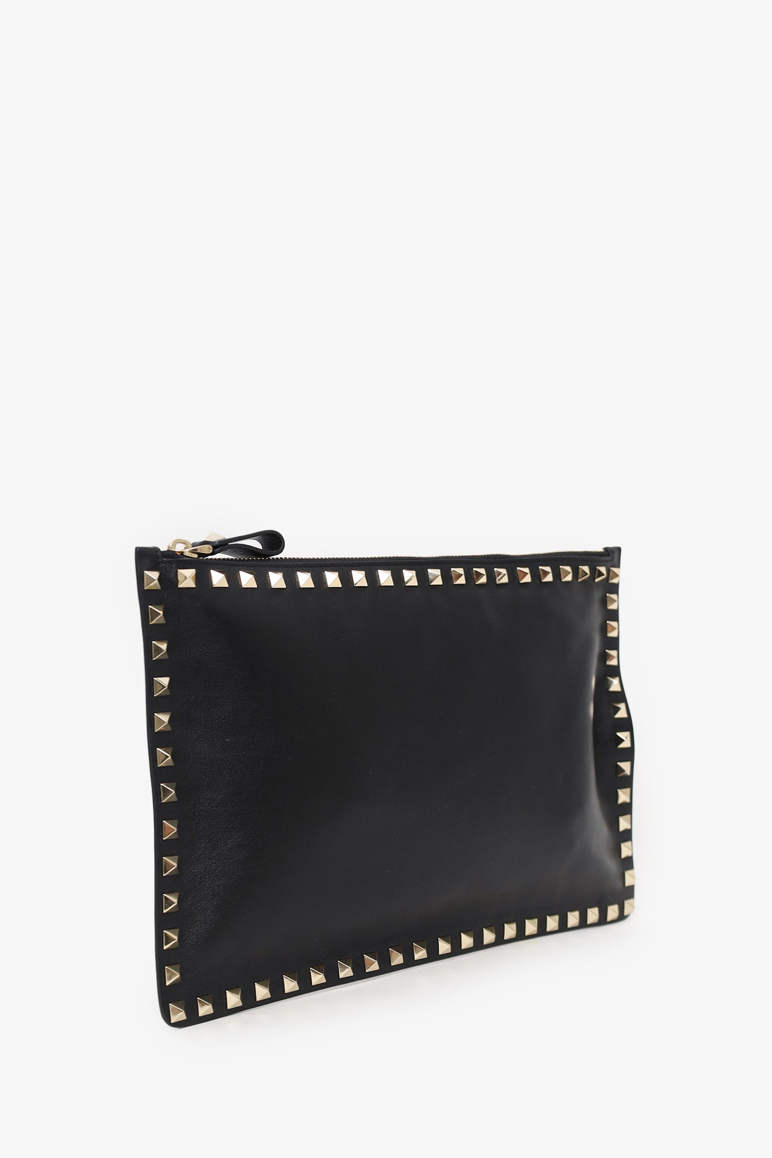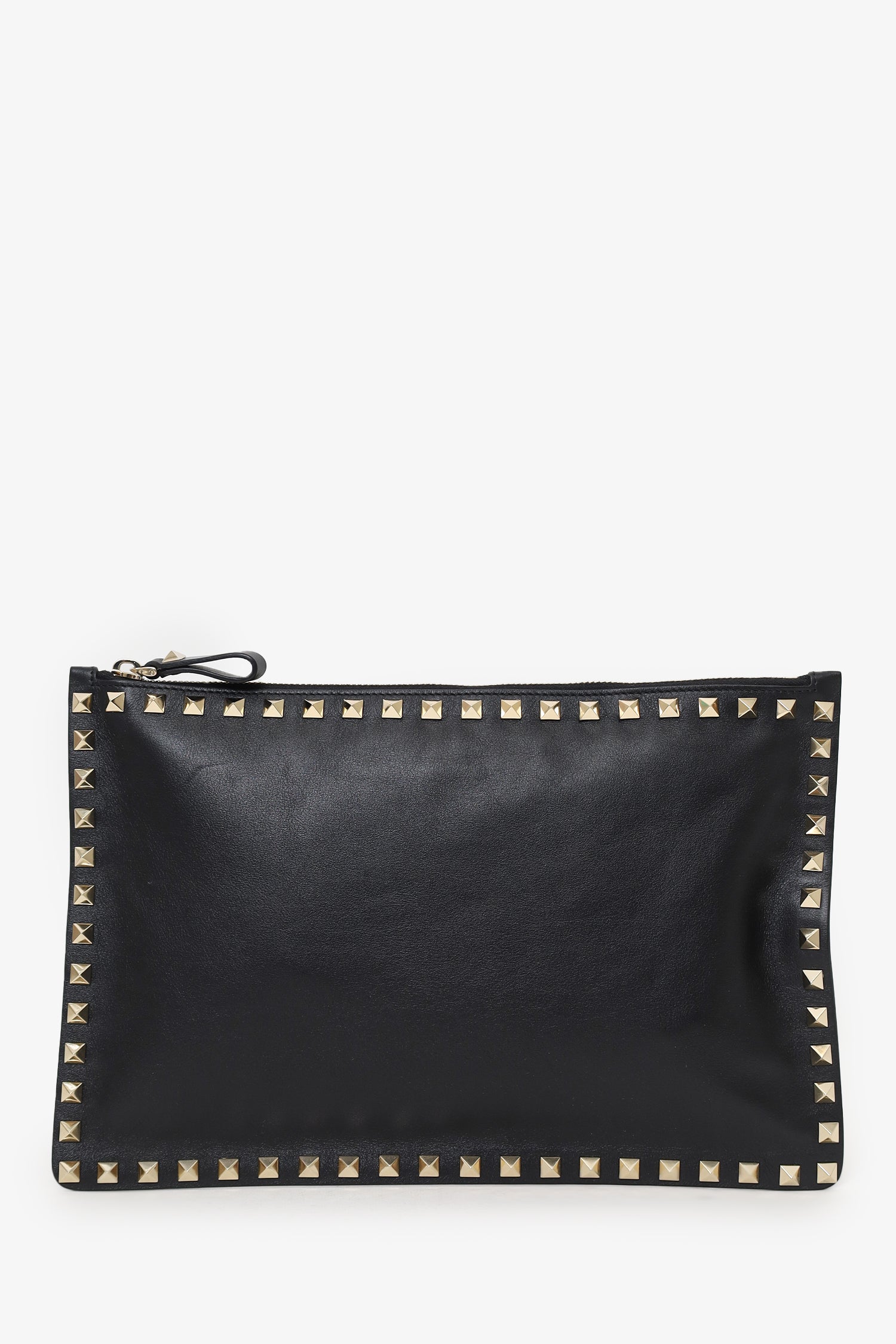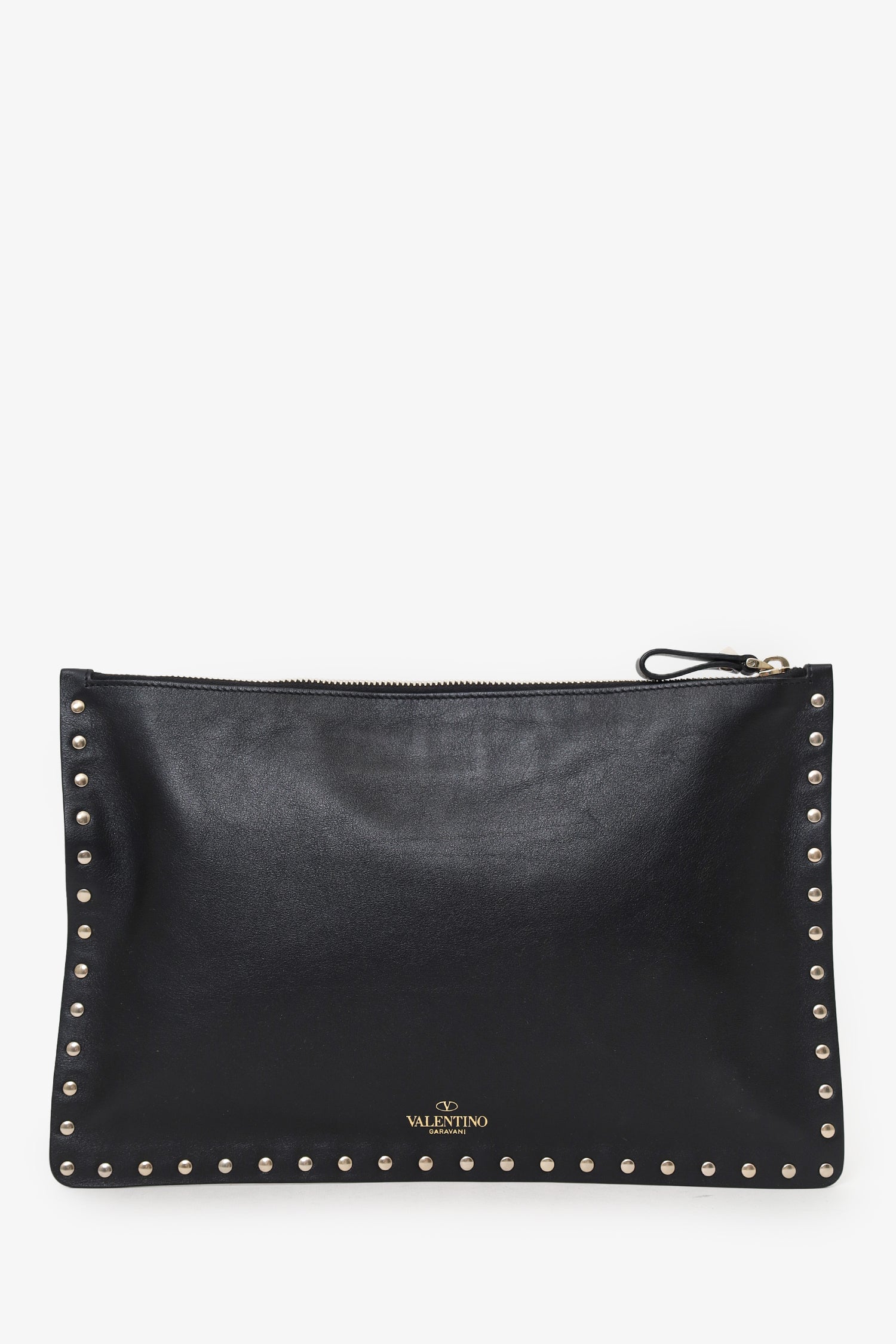 Refresh availabilityValentino Black Leather Rockstud Clutch. Top zip closure. Fabric-lined interior. Gold-tone hardware. Tonal stitching.