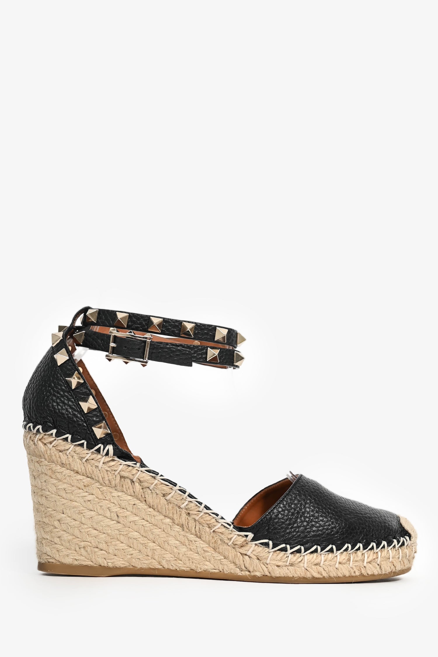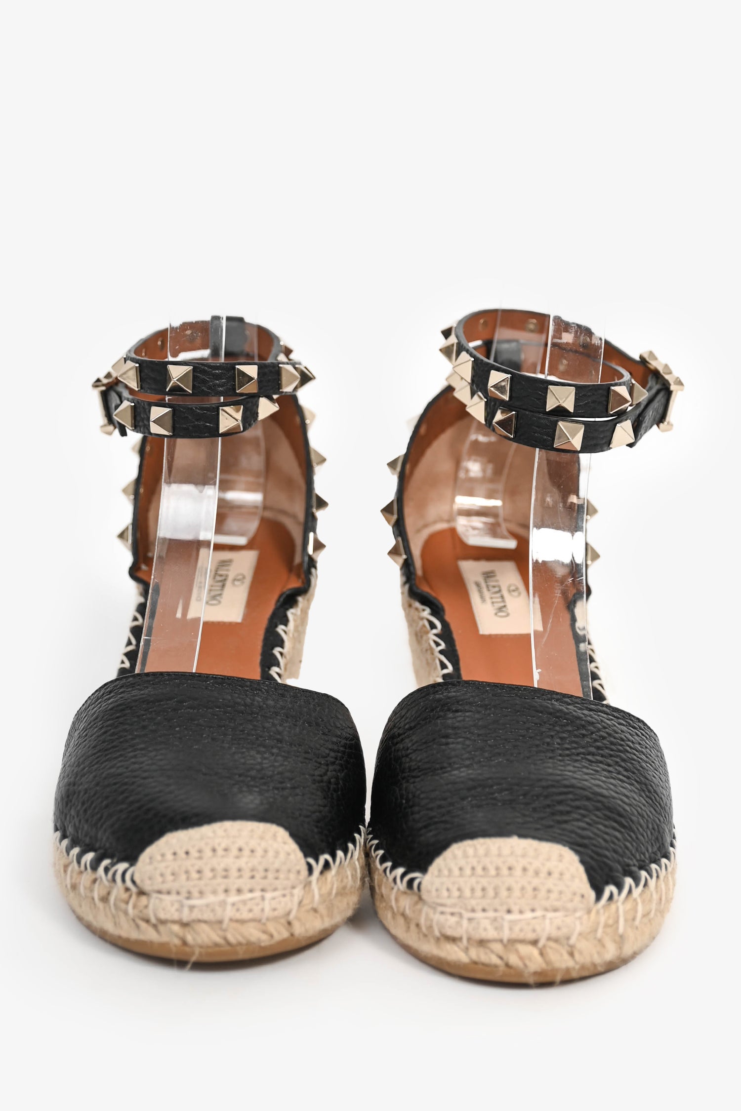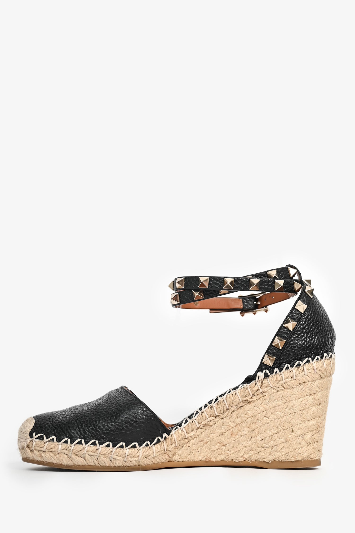 Refresh availabilityValentino Black Leather Rockstud Espadrille Wedges. Almond toe. Wrap-around side buckle closure. Gold-tone hardware. Tonal stitching.