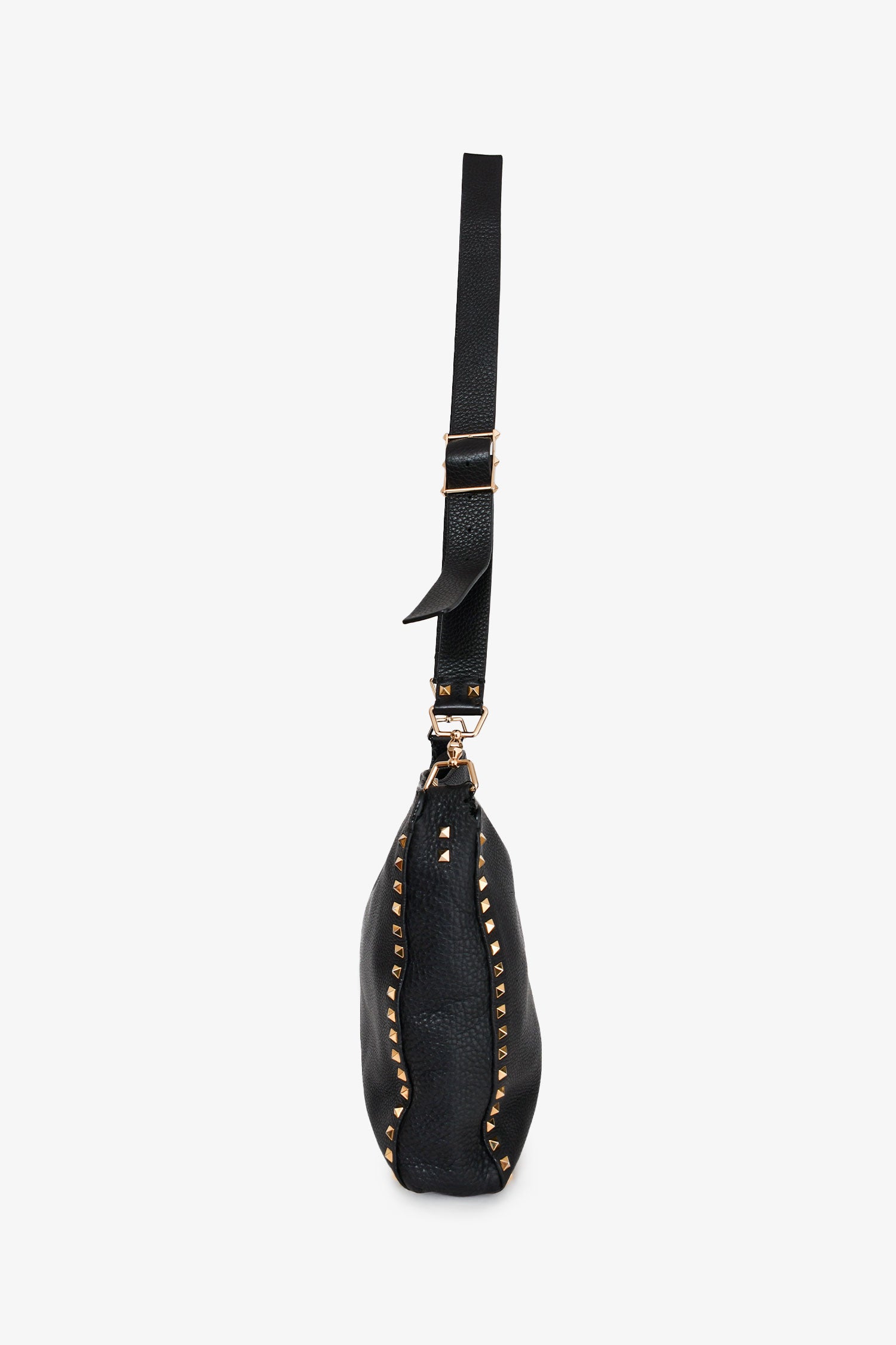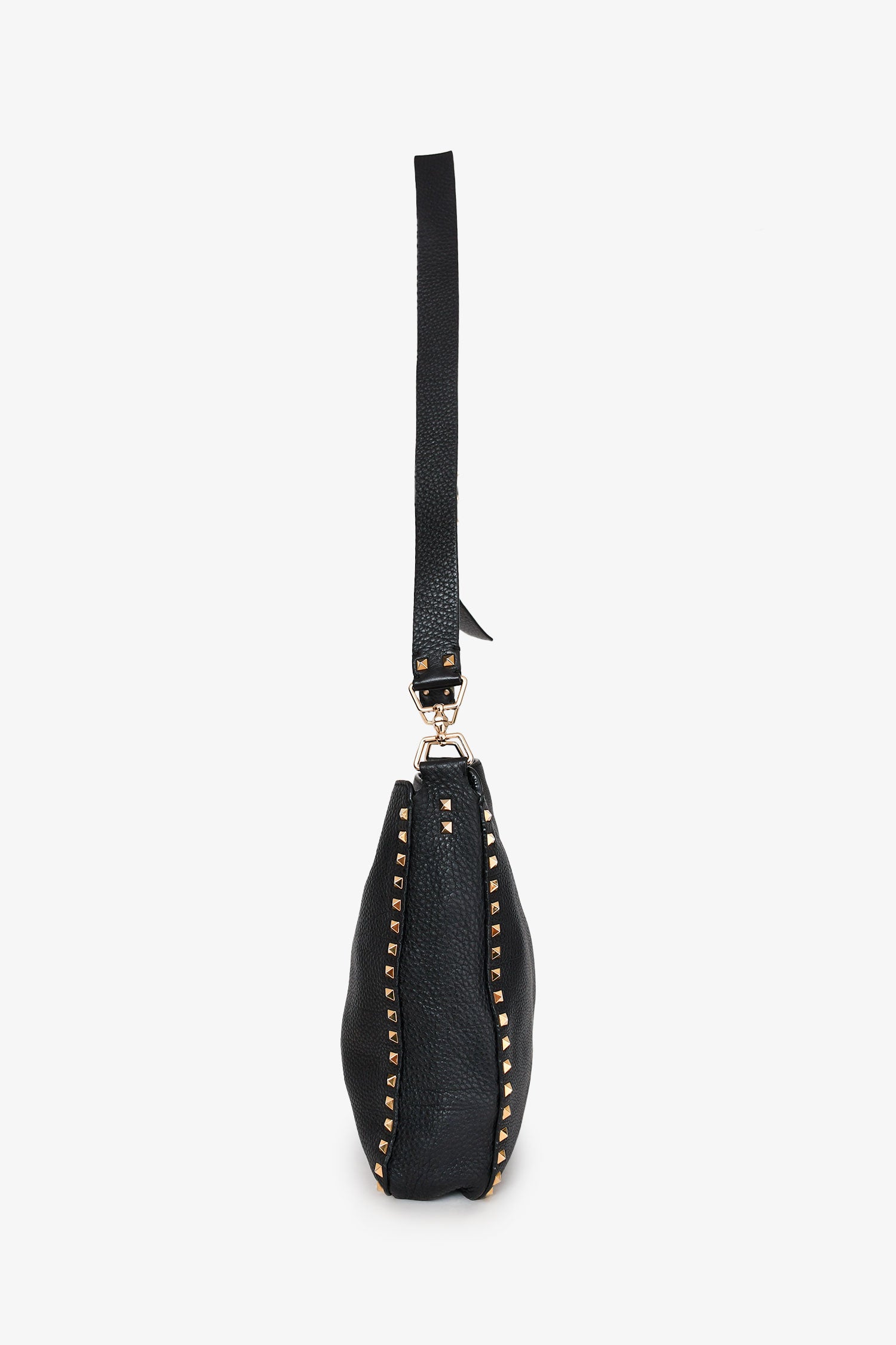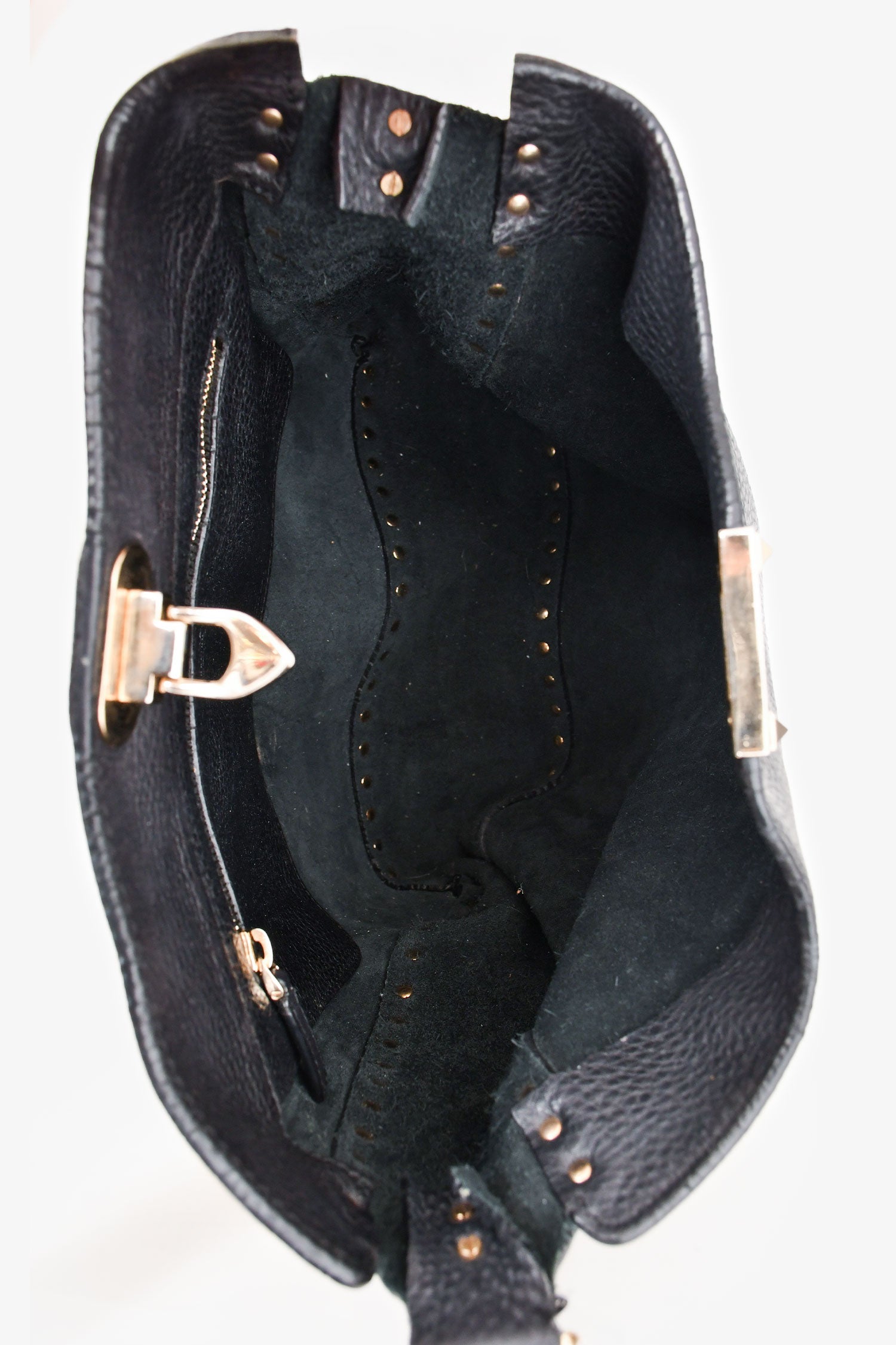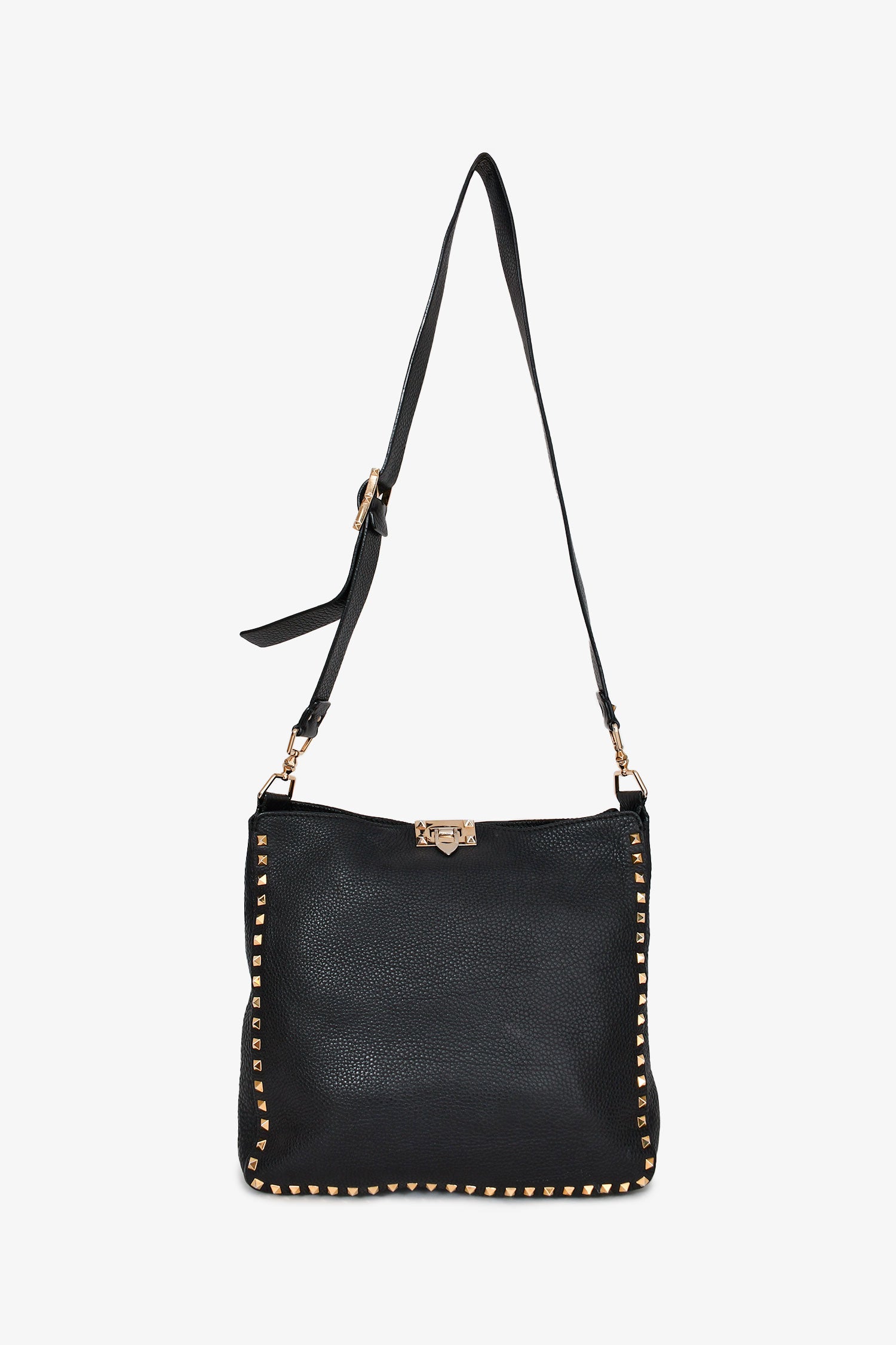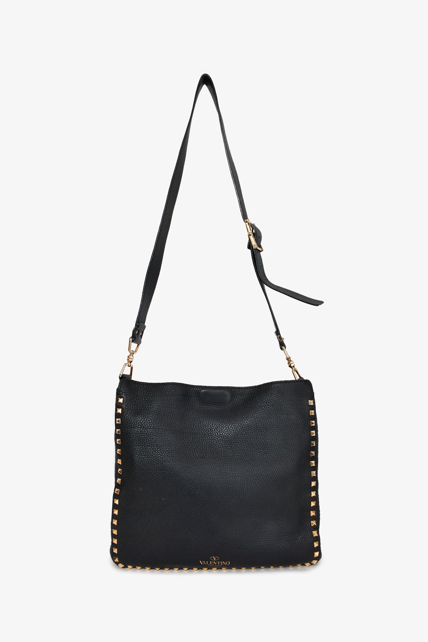 Refresh availabilityValentino Black Leather Rockstud Messenger Bag. Gold-tone hardware. Pull-through flip lock closure. Rockstud detailing. Adjustable shoulder strap. Suede lined interior with a leather zipped compartment. Tonal stitching.