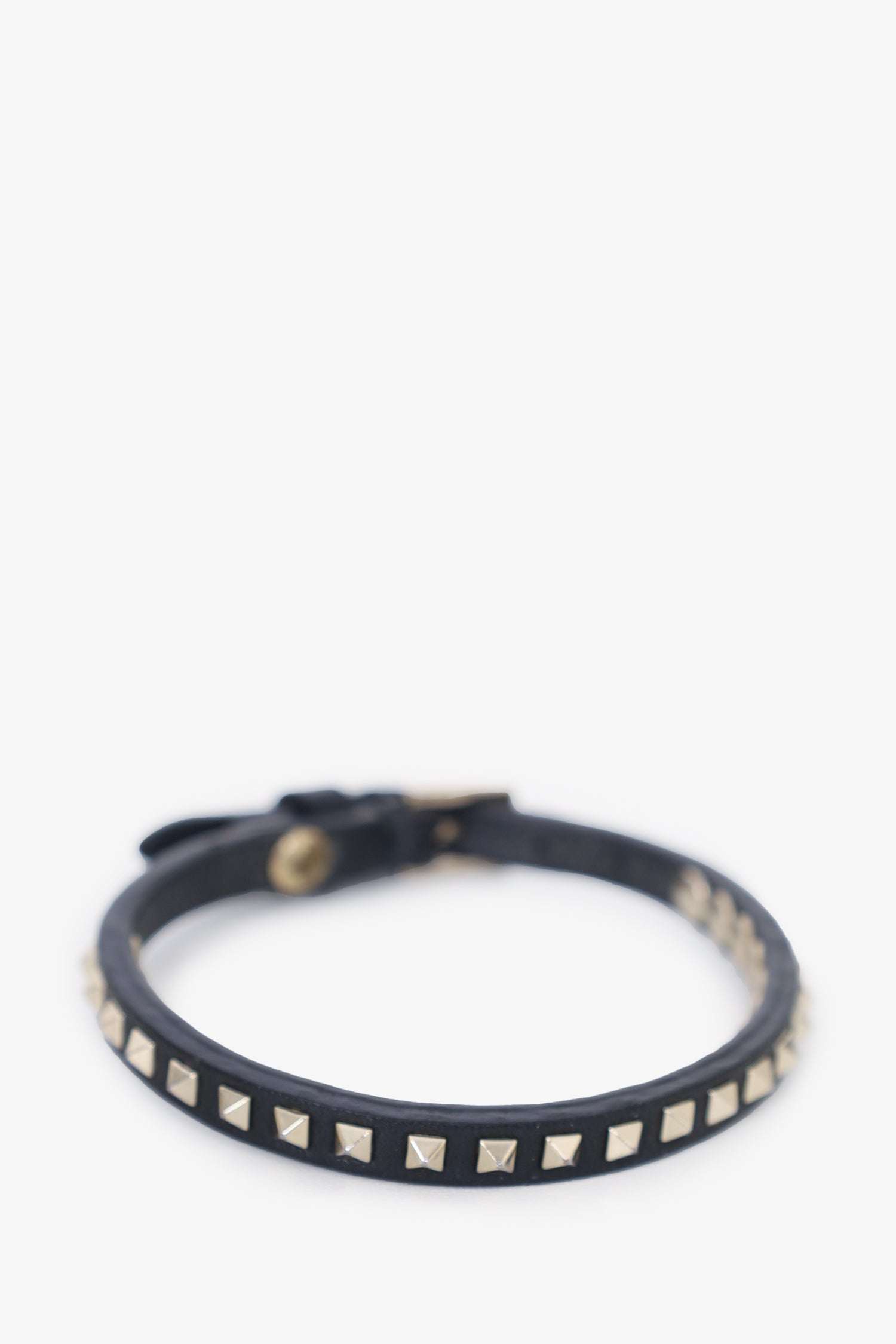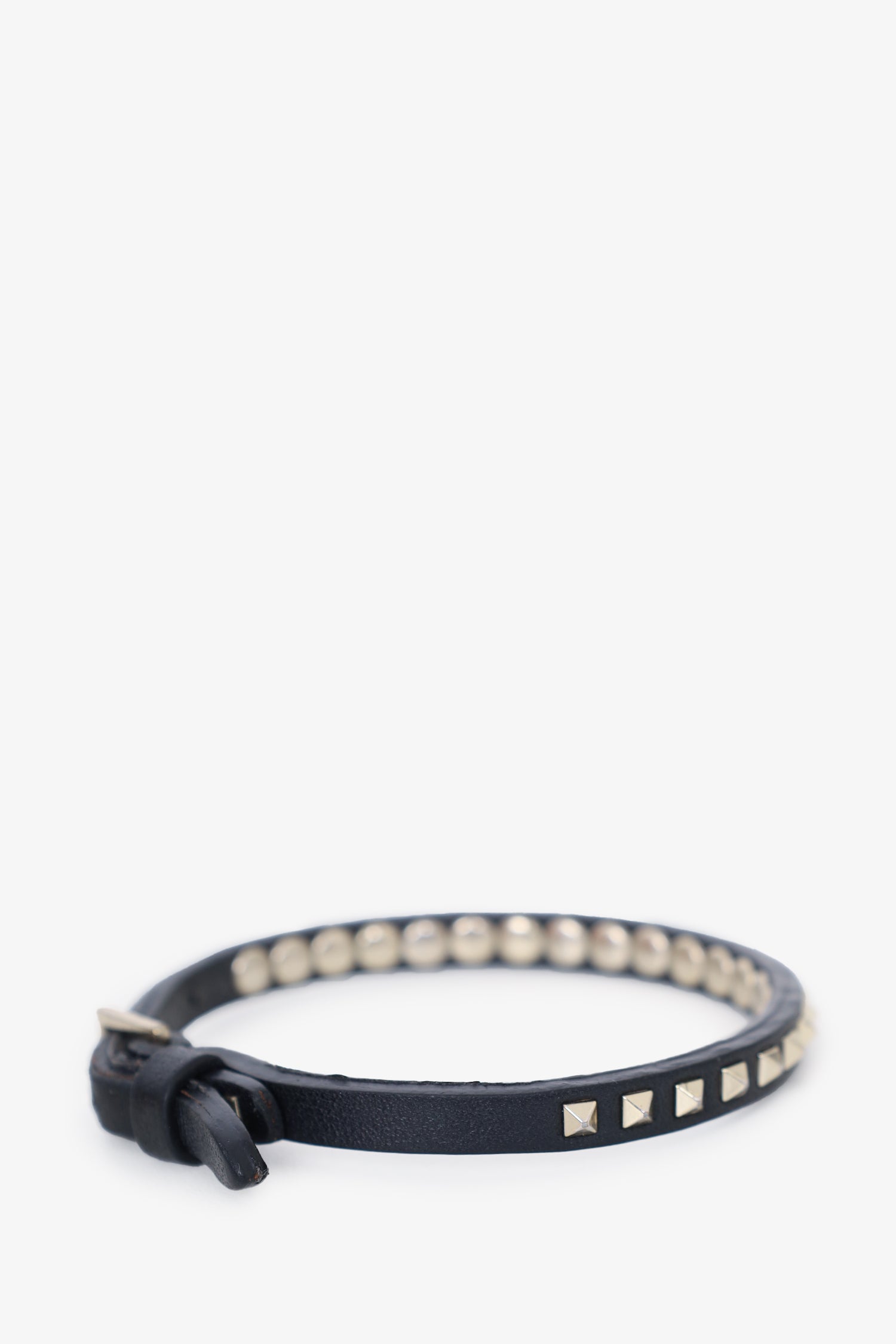 Valentino Black Leather Rockstud Narrow Bracelet. Strap with buckle closure. Silver-tone hardware. Tonal stitching.
