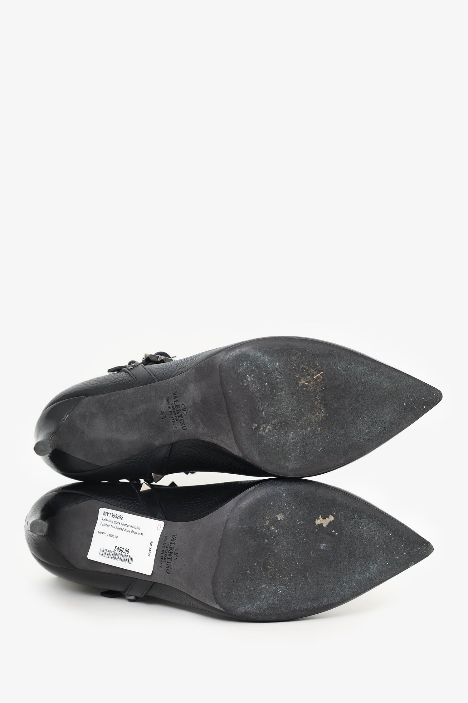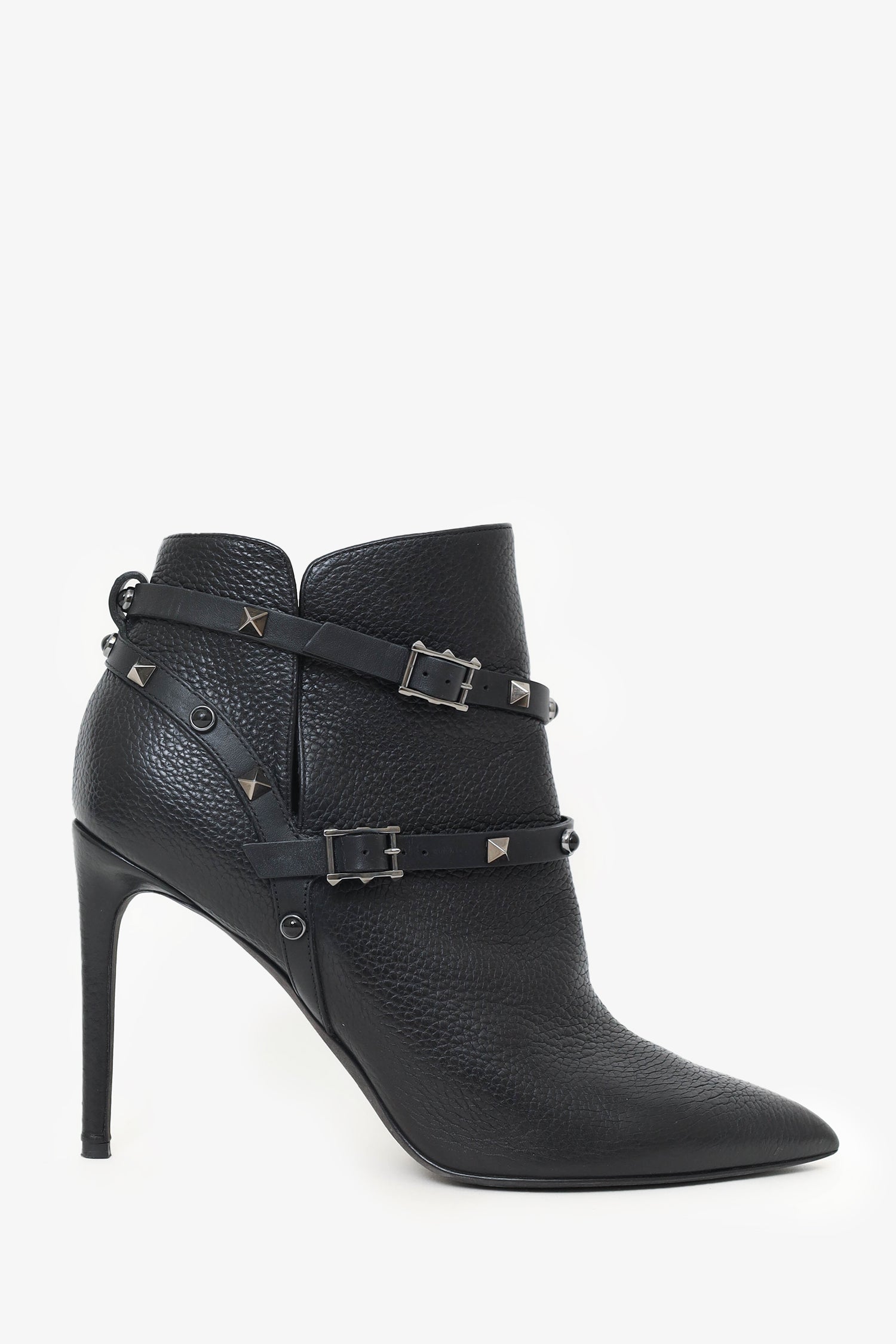 Refresh availabilityValentino Black Leather Rockstud Pointed Toe Heeled Ankle Boots. Adjustable ankle strap. Side split detailing. Pointed toe. Gun mental-tone hardware. Tonal stitching.