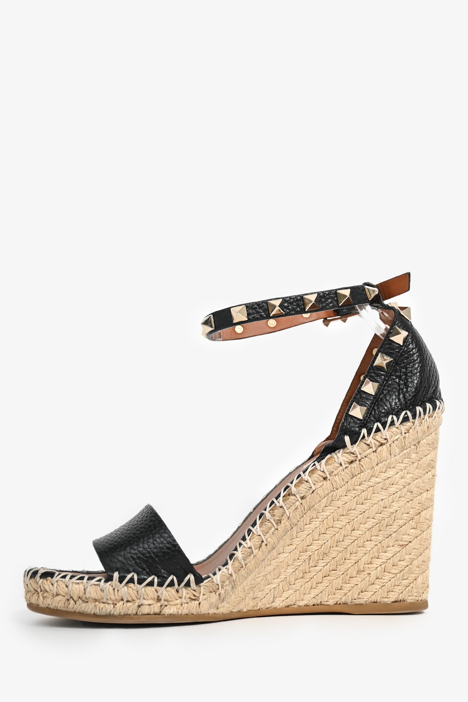 Refresh availabilityValentino Black Leather Rockstud Sandal Wedges. Leather insole. Gold-tone hardware. Rounded toe. Ankle strap with a pin buckle. Tonal stitching.