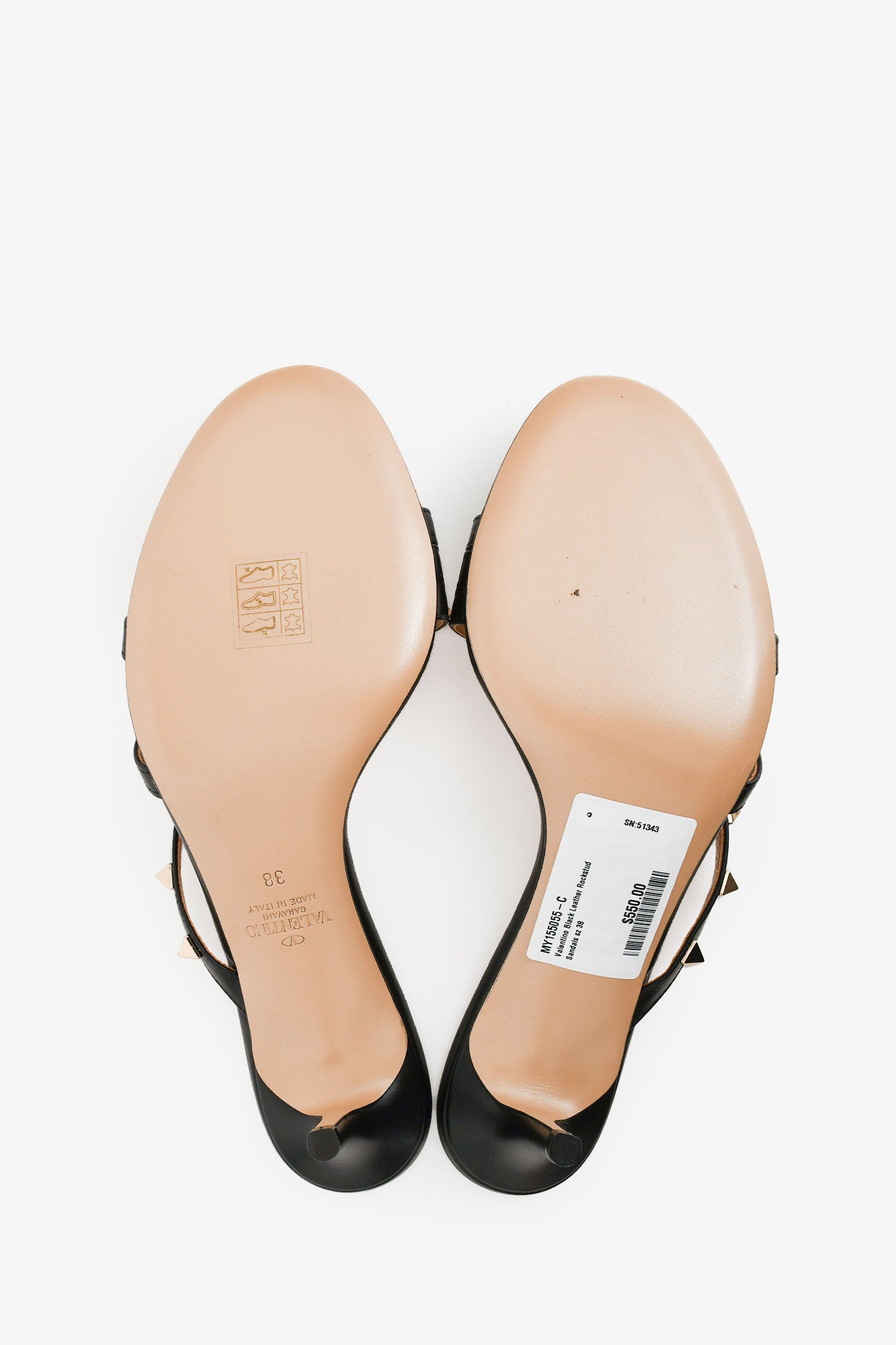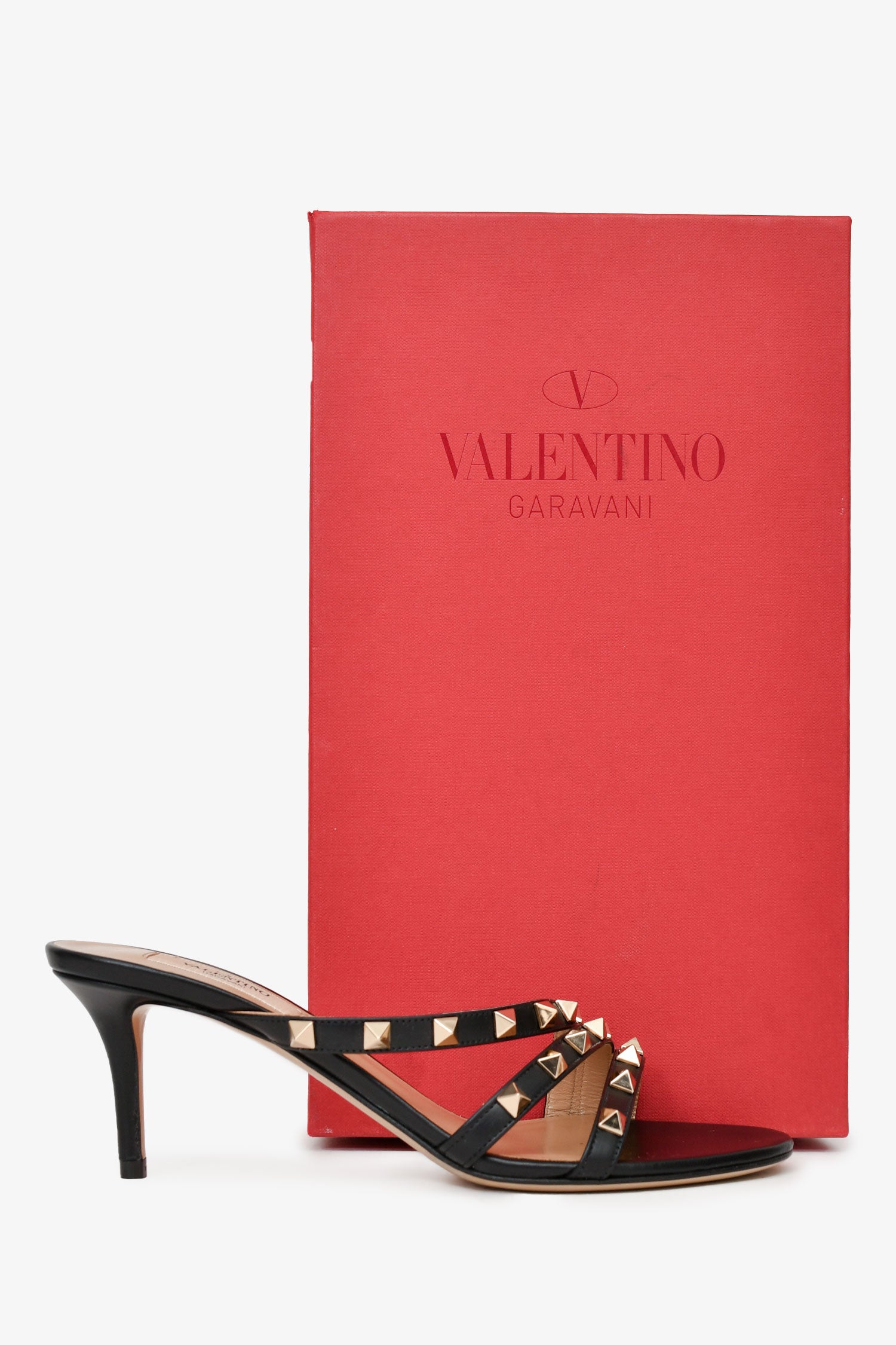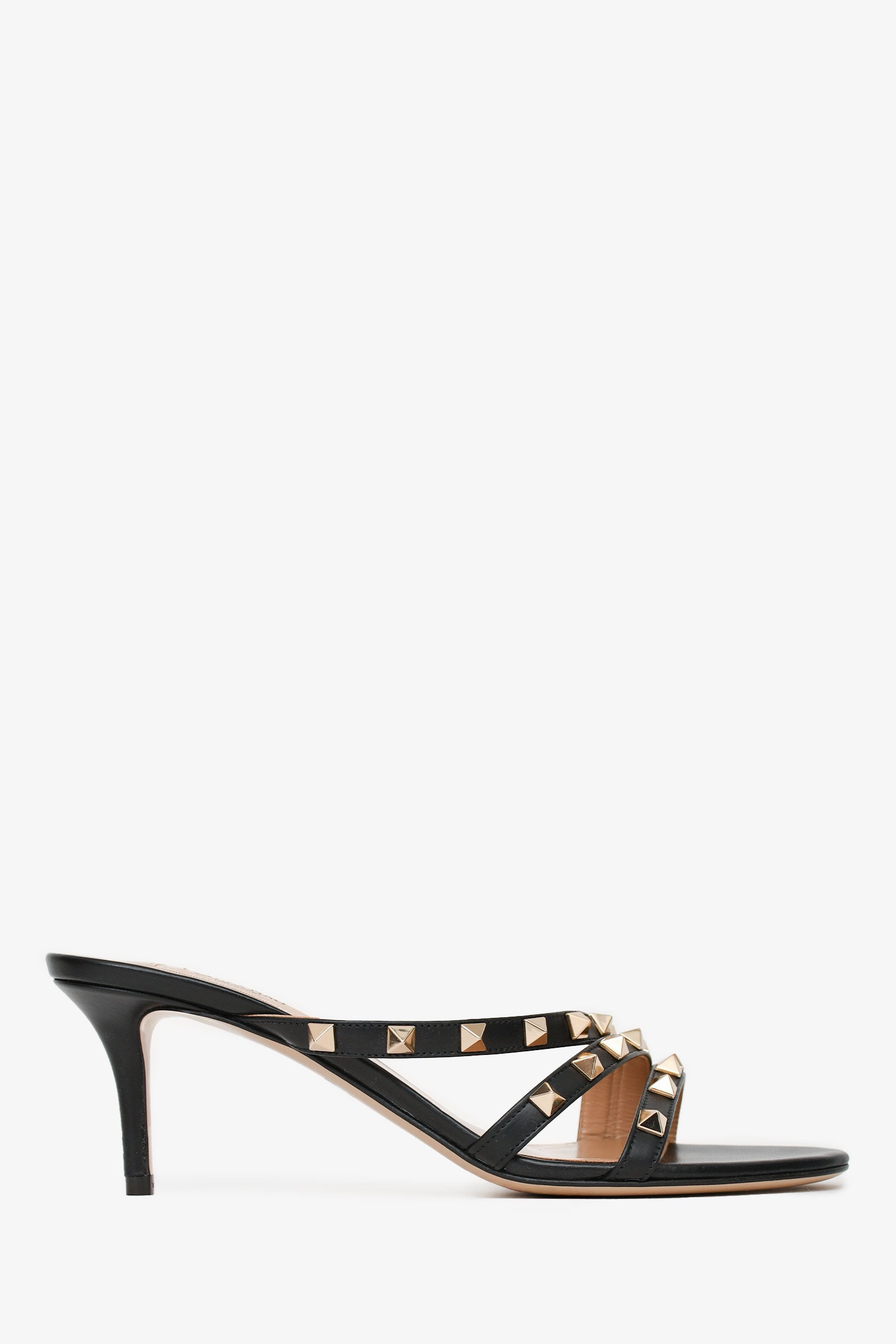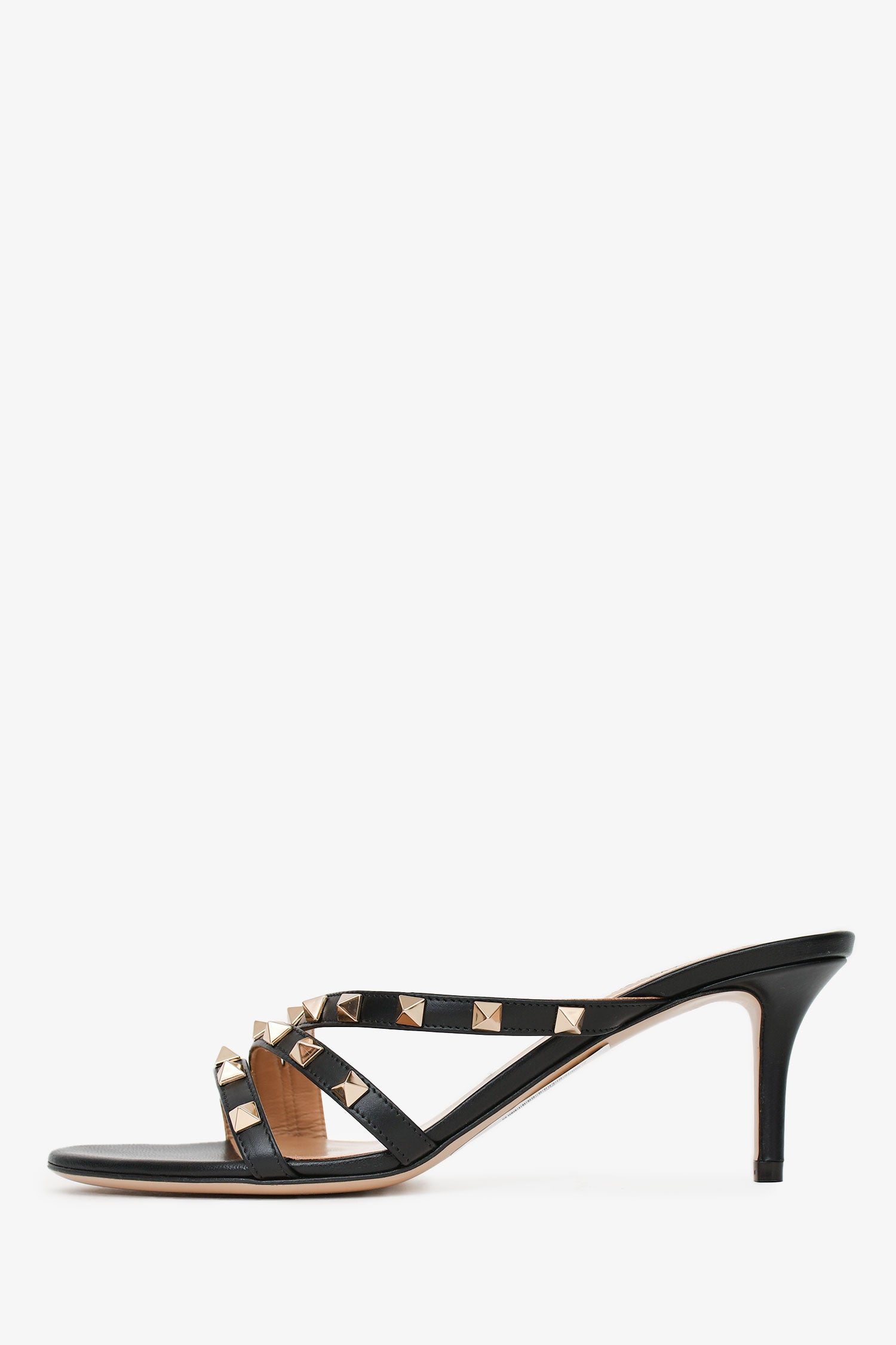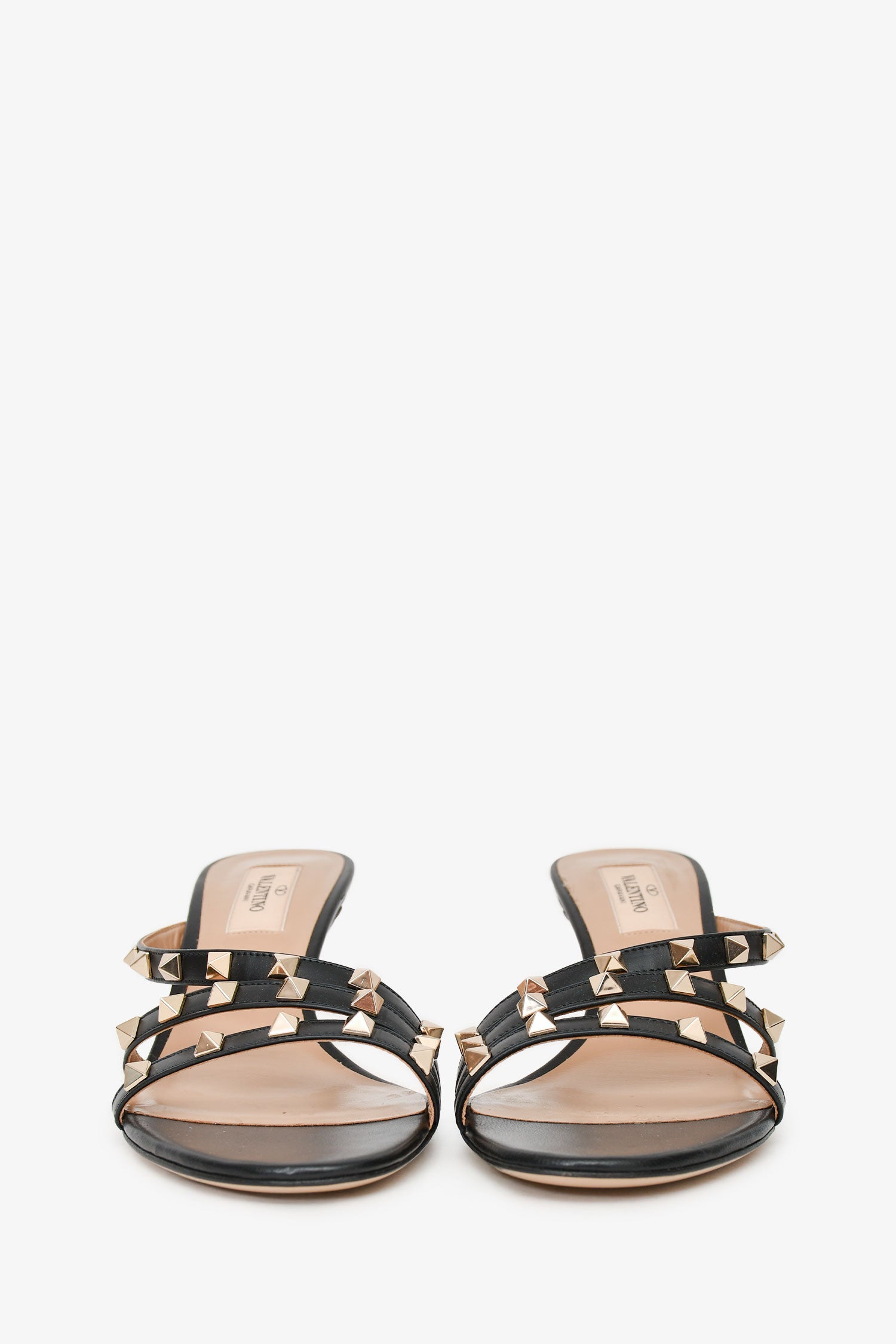 Refresh availabilityValentino Black Leather Rockstud Sandals. Open toe. Slip-on. Signature gold-tone Rockstud embellishments. Leather sole. Tonal stitching. Comes with dust bag and box.