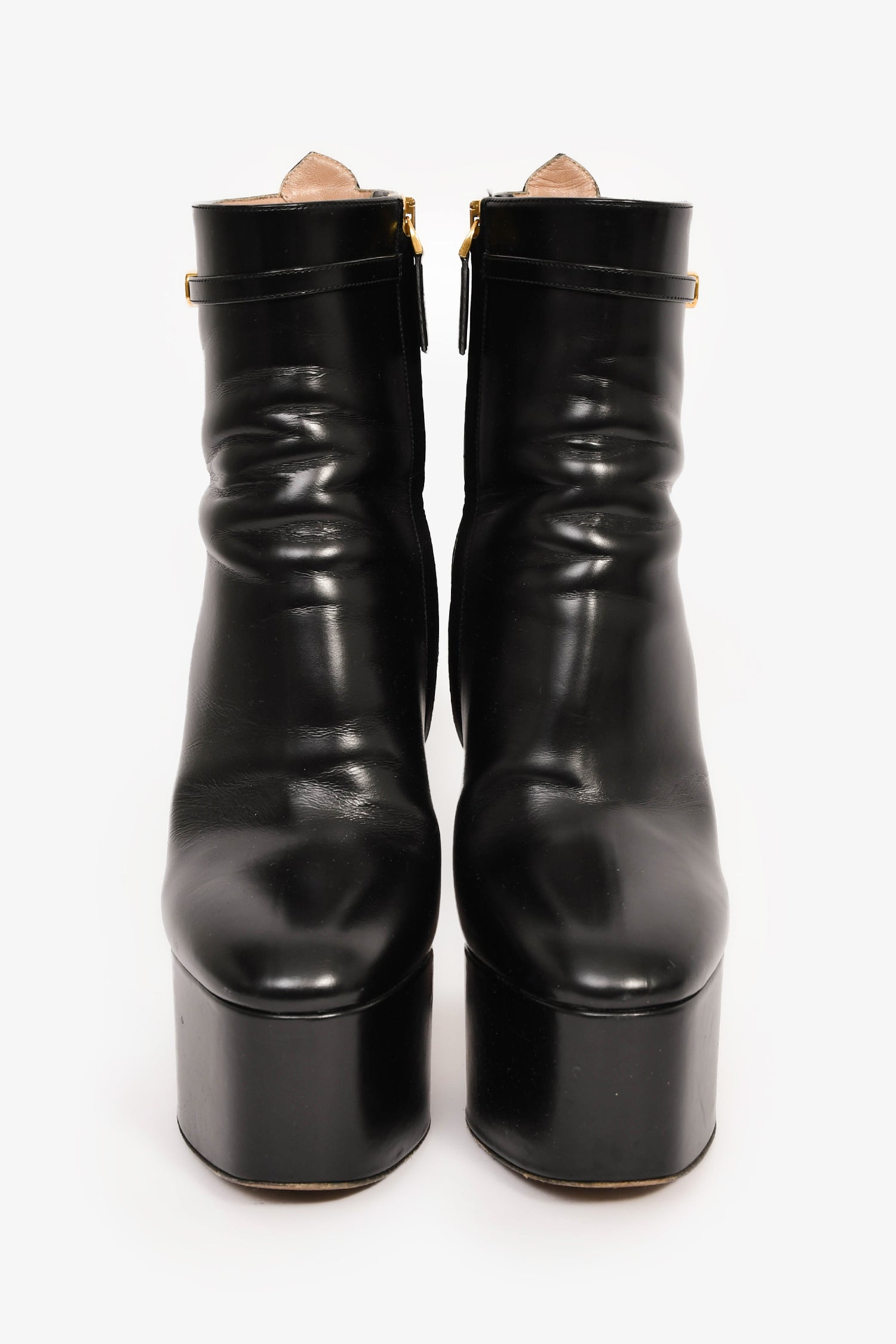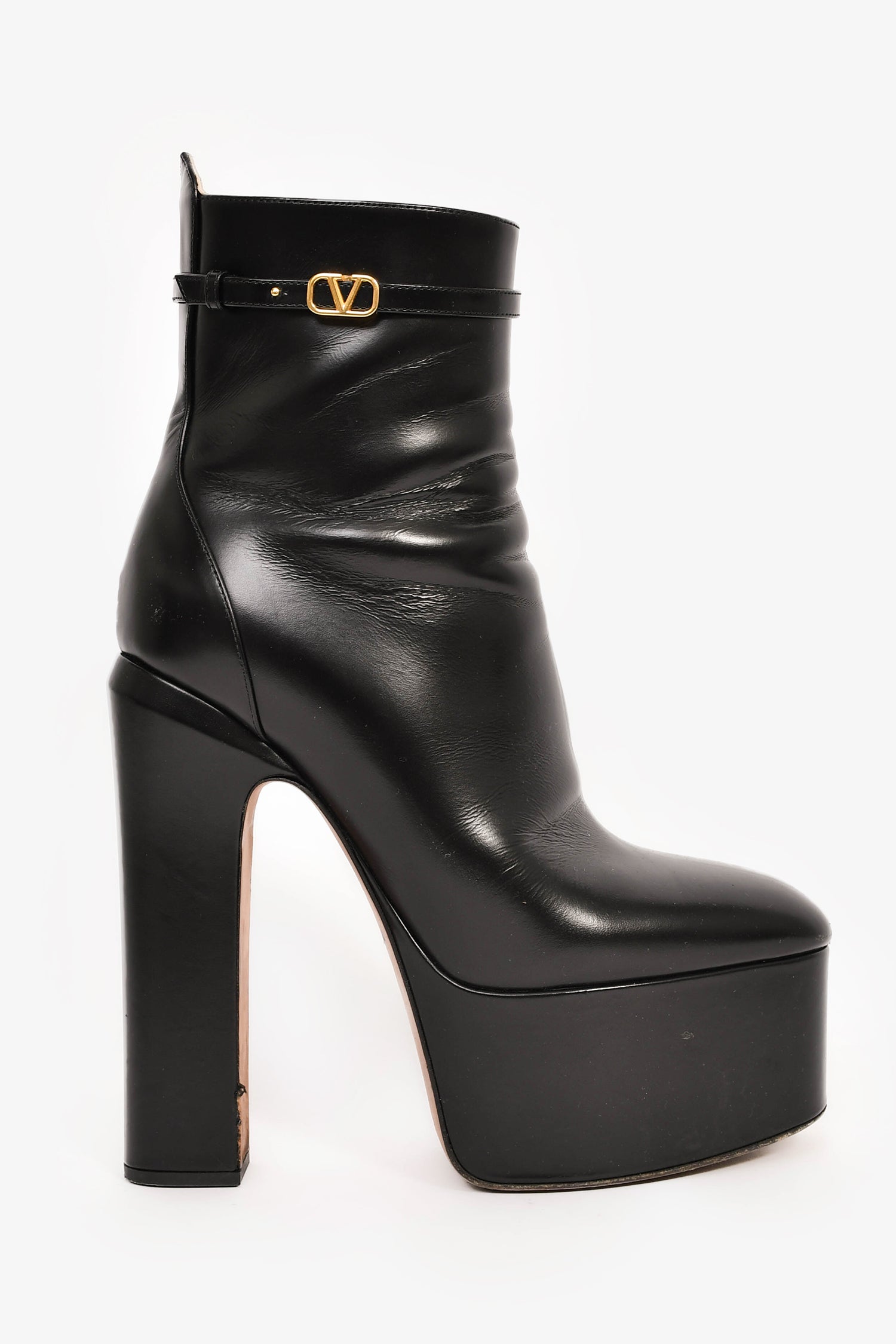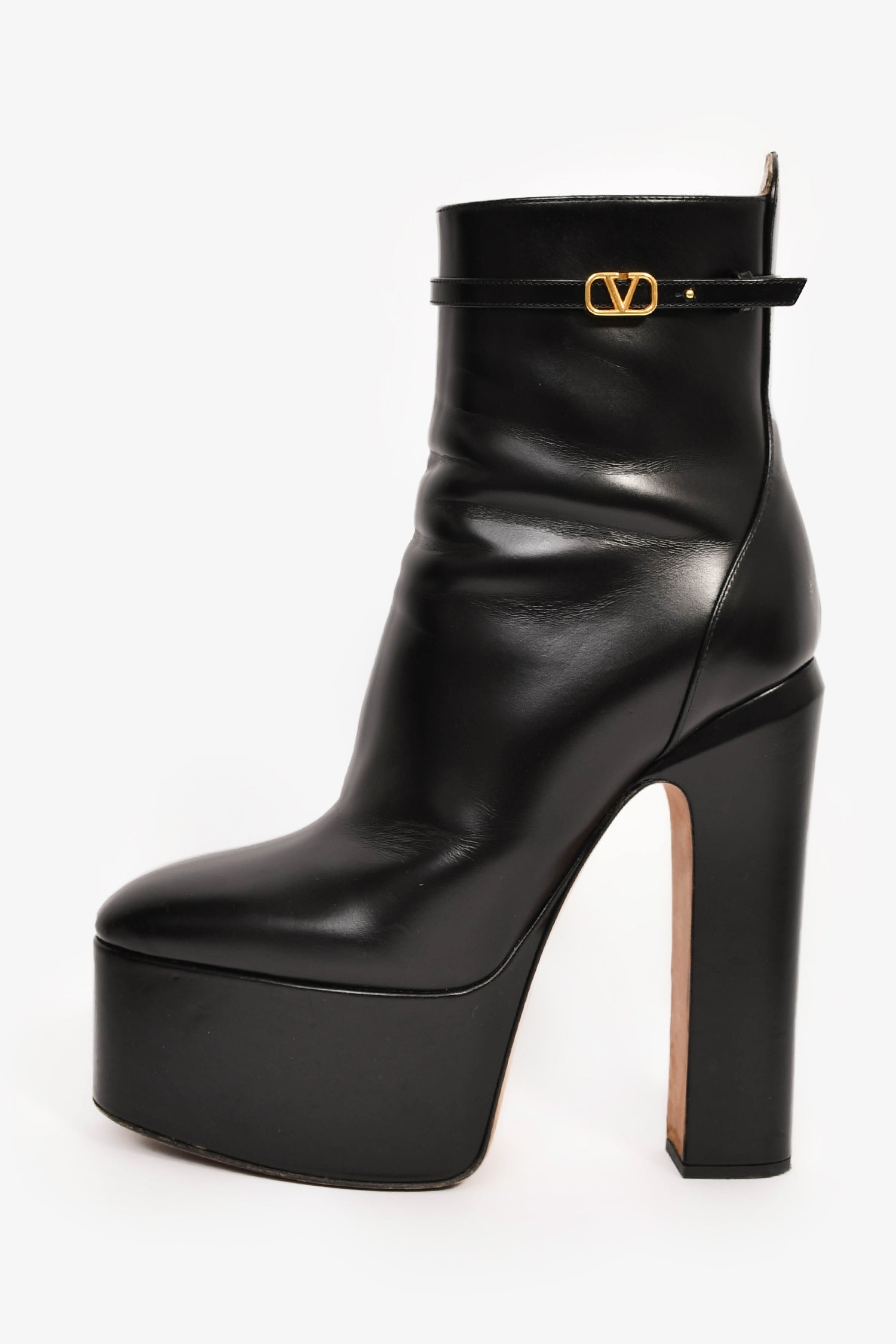 Refresh availabilityValentino Black Leather 'V' Platform Heeled Boots. Pull-on. Round toe. Side zip closure. Gold-tone hardware. Tonal stitching.
