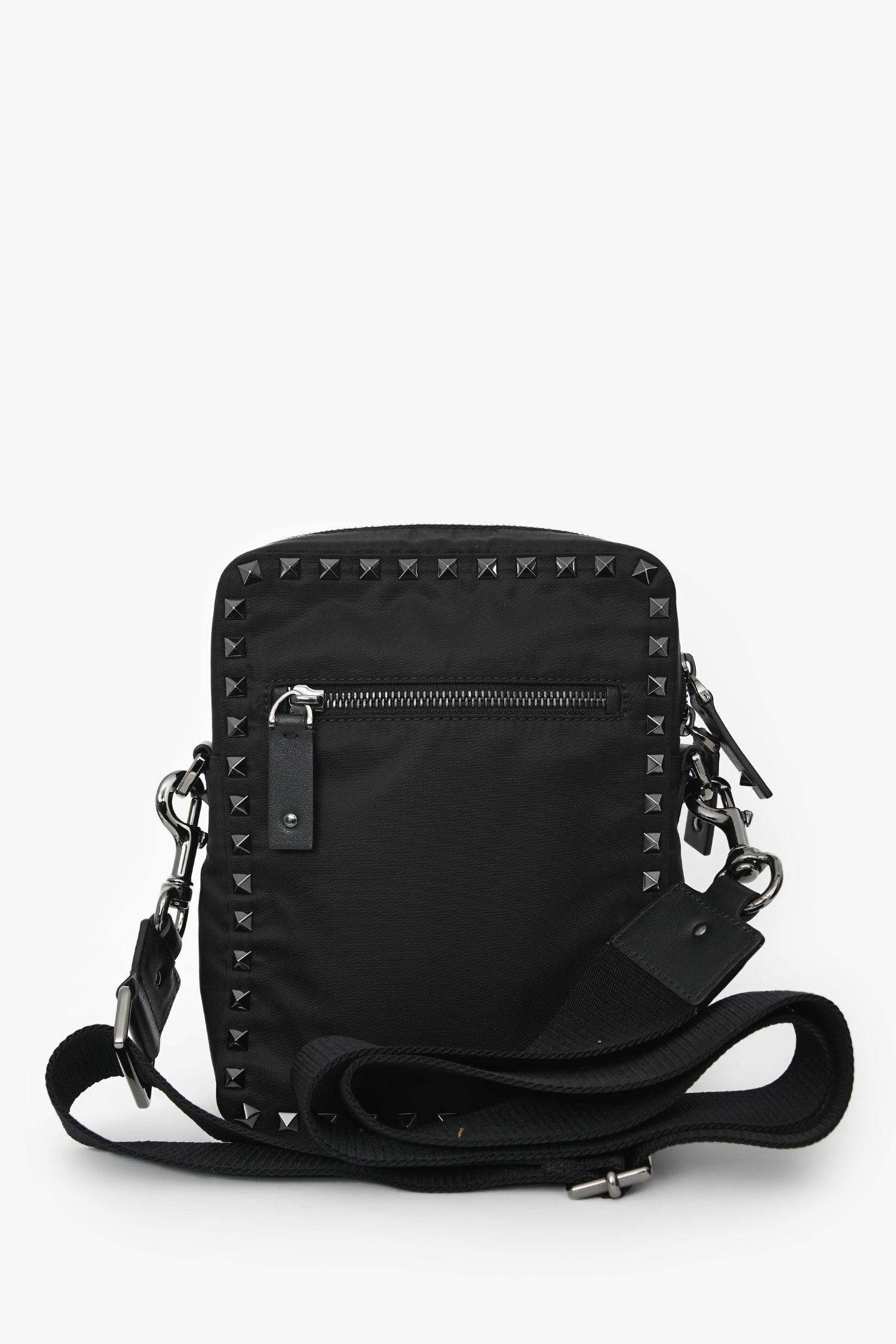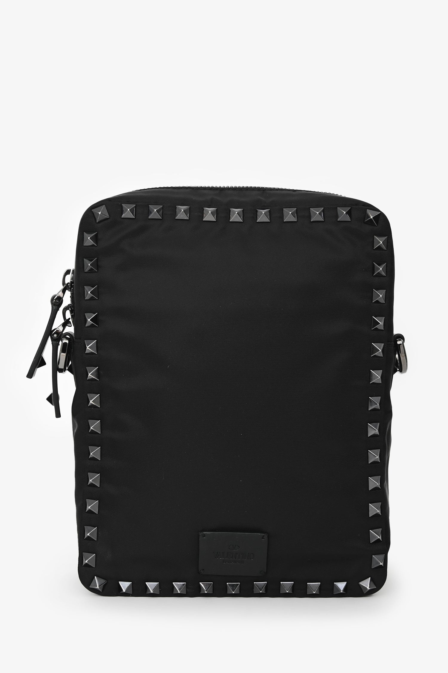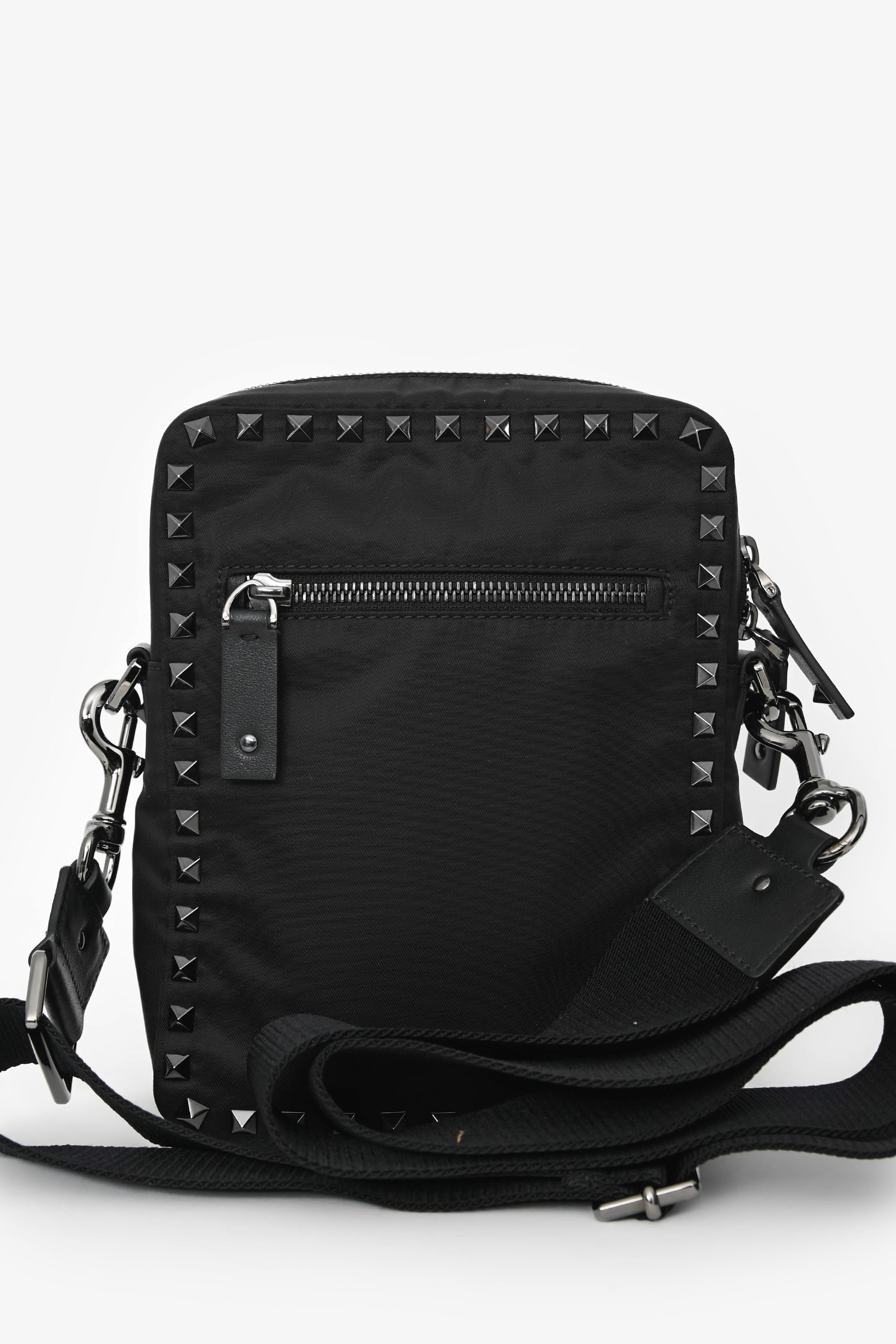 Refresh availabilityValentino Black Nylon Rockstud Messenger Bag. Top 2-way zip closure. Adjustable and detachable crossbody strap. Single exterior zip pocket. Single interior compartment with a wall slip pocket and a zip pocket. Textile-lined. Gunmetal-tone metal. Tonal stitching.