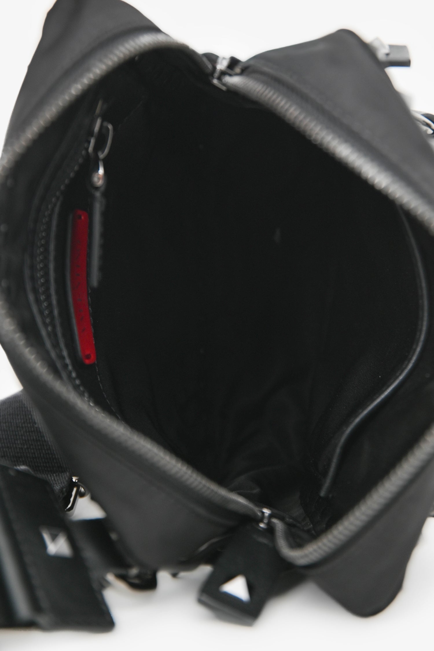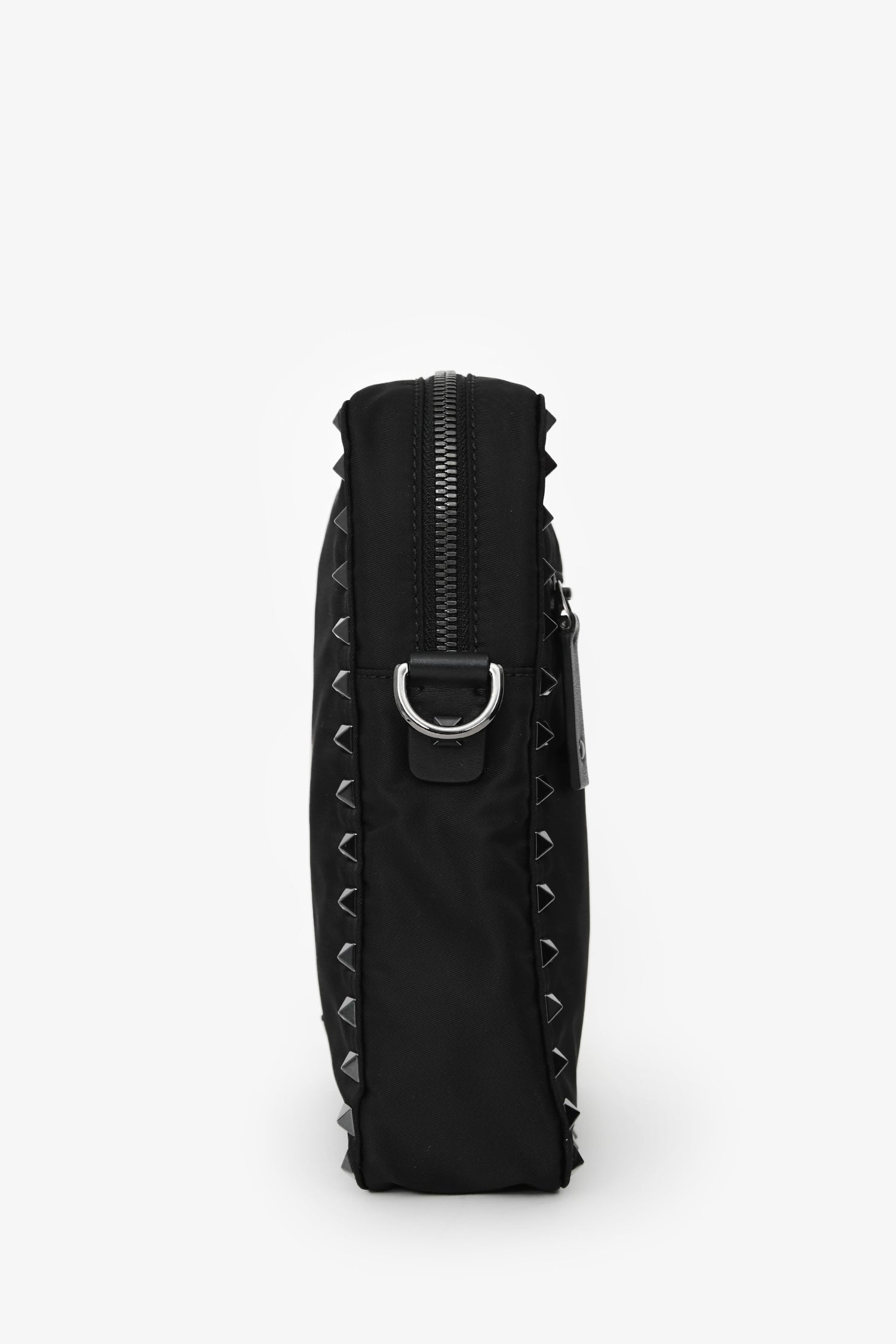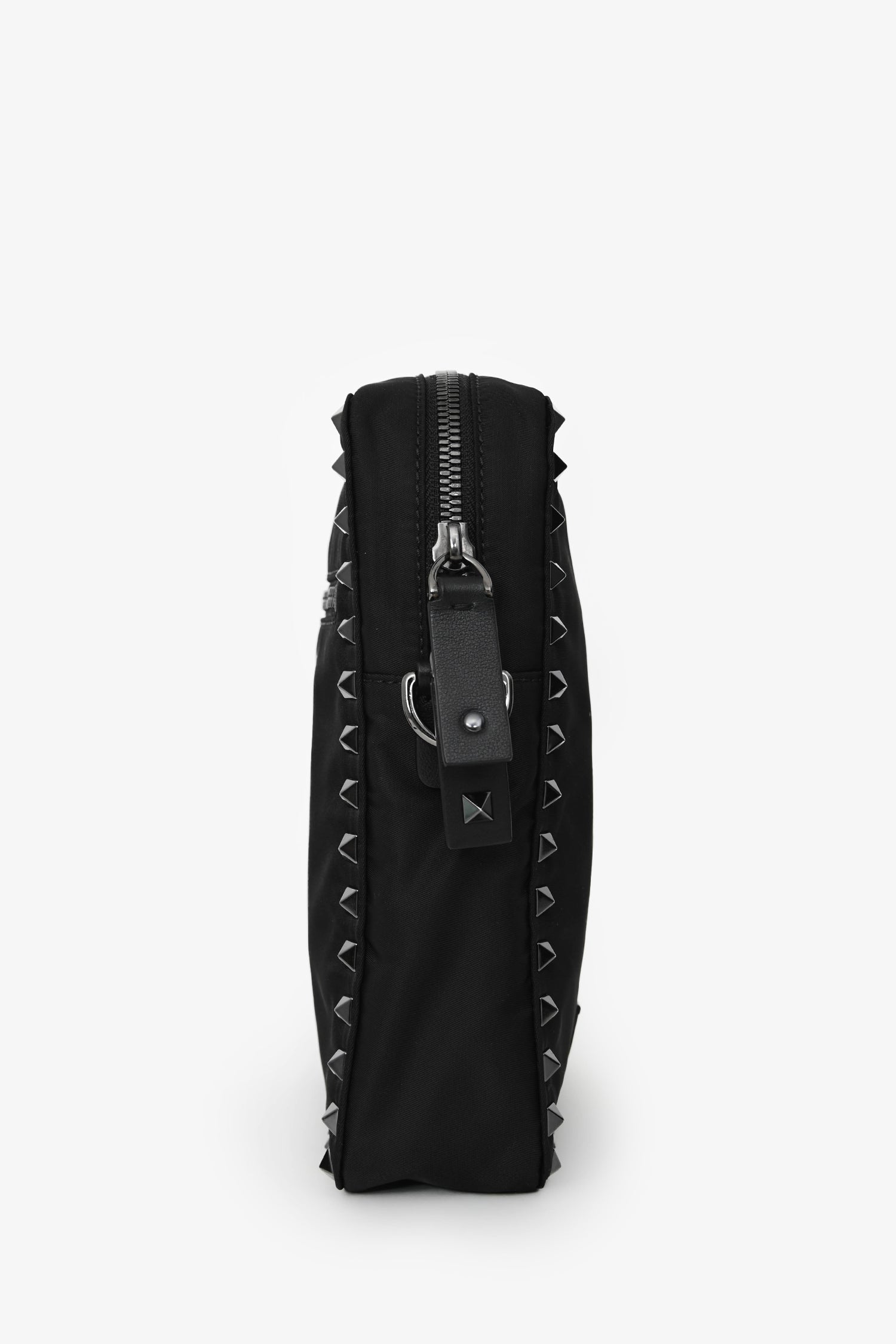 Refresh availabilityValentino Black Nylon Rockstud Messenger Bag. Top 2-way zip closure. Adjustable and detachable crossbody strap. Single exterior zip pocket. Single interior compartment with a wall slip pocket and a zip pocket. Textile-lined. Gunmetal-tone metal. Tonal stitching.