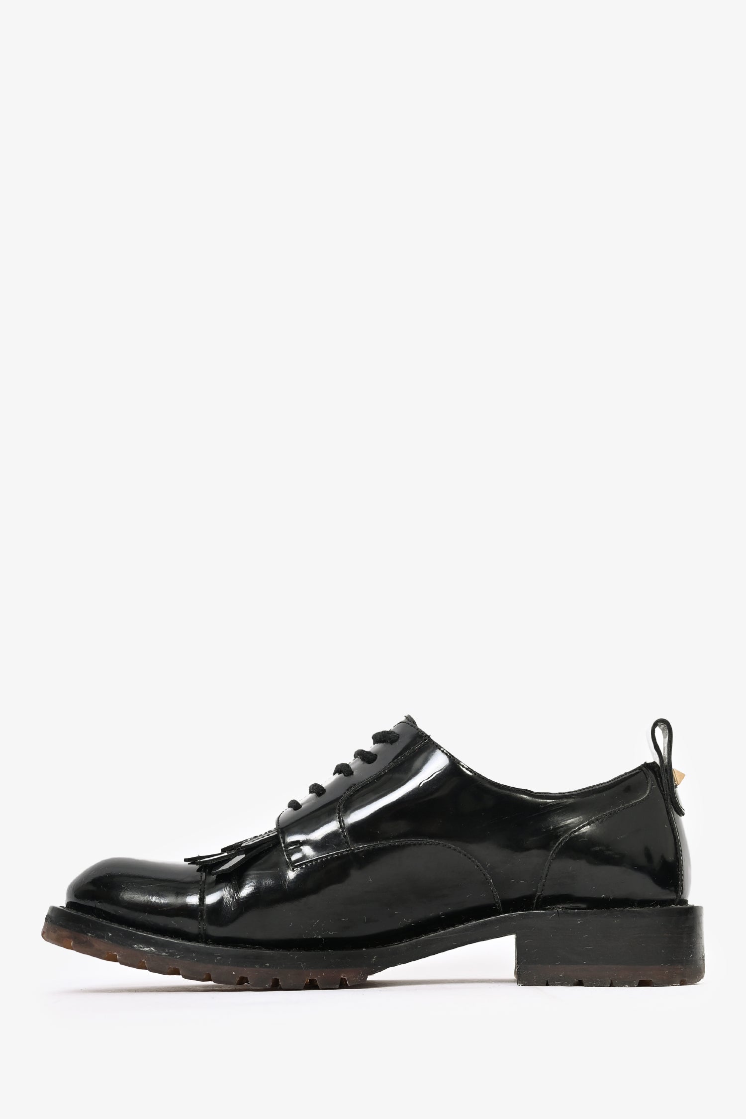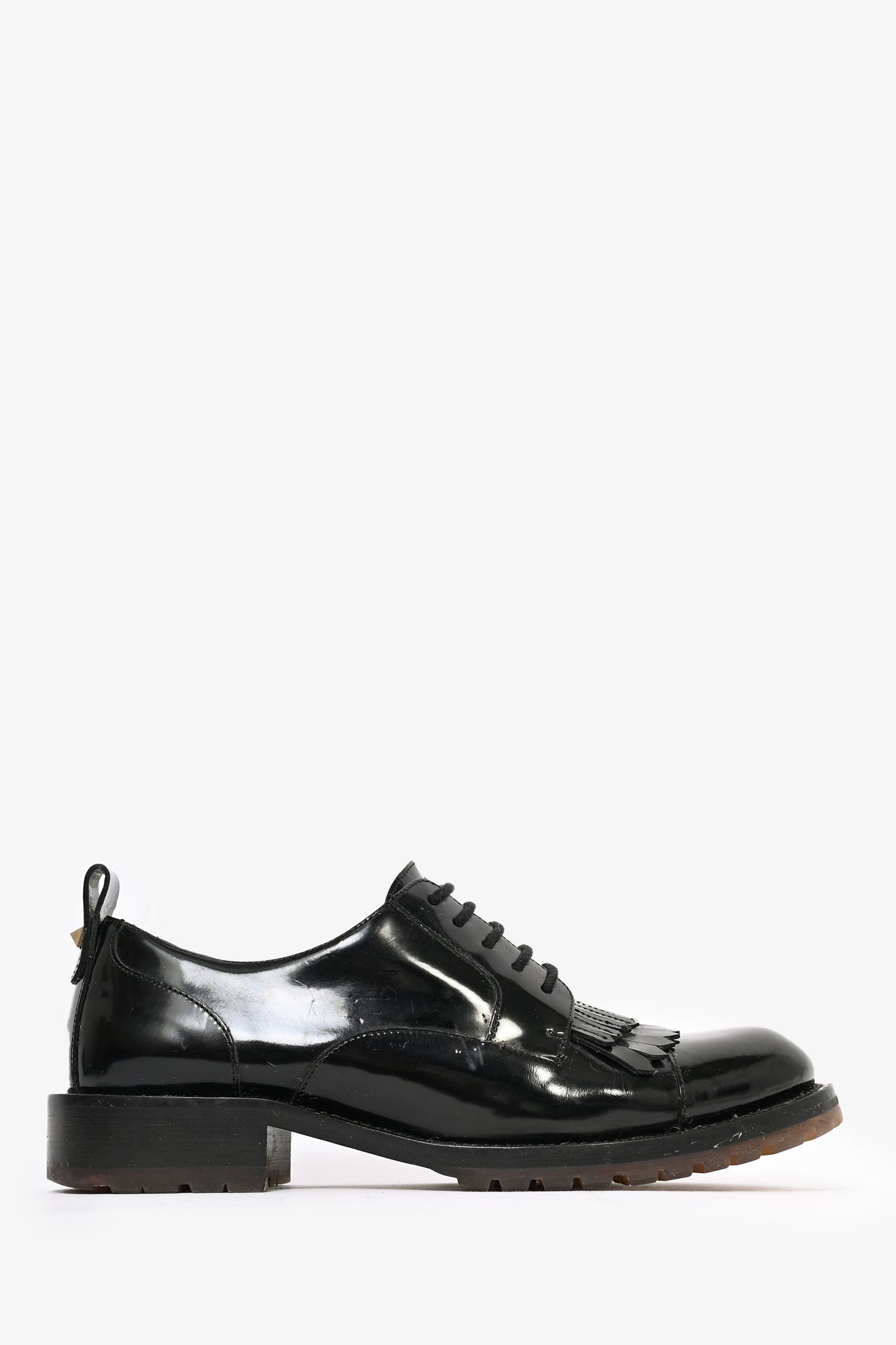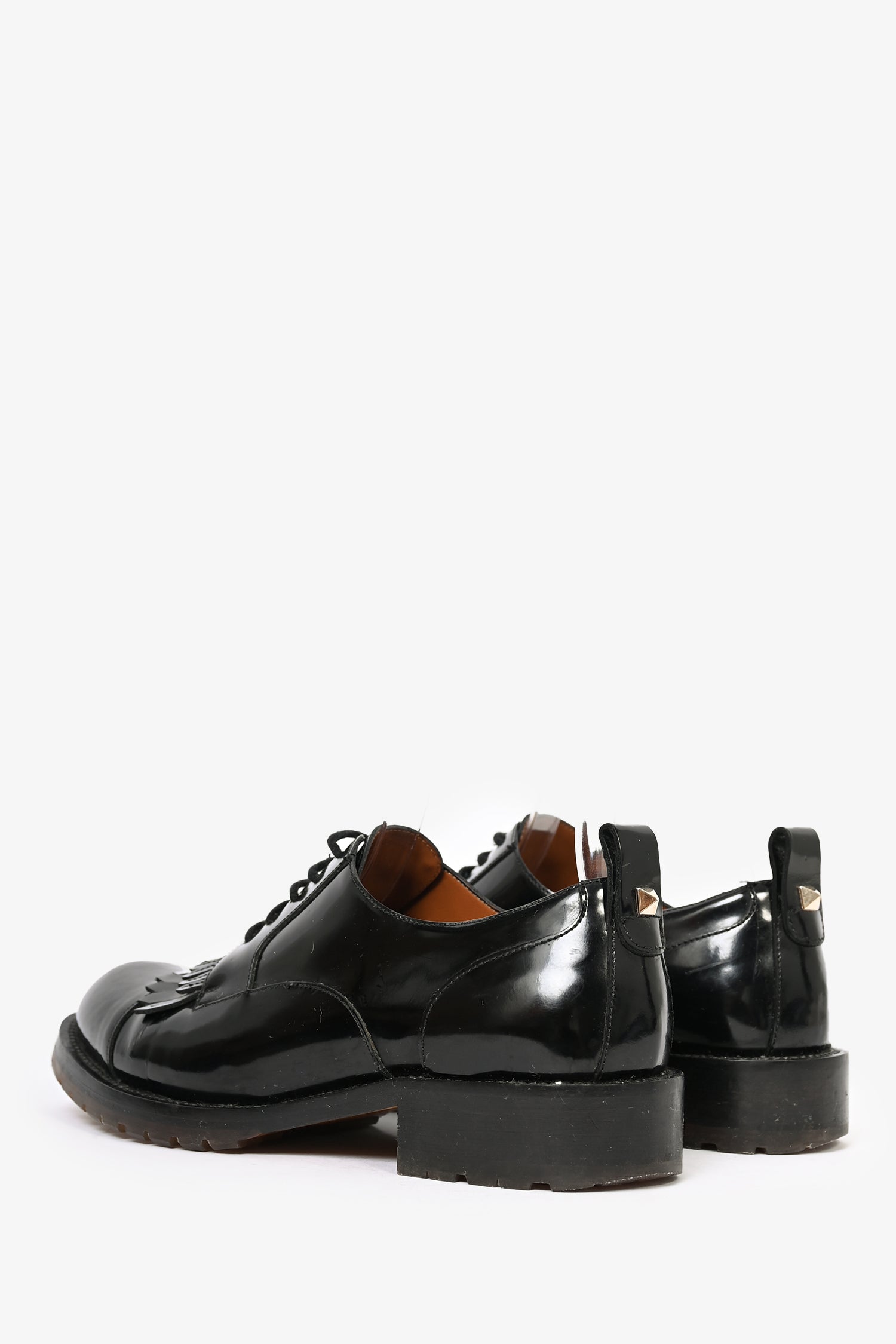 Refresh availabilityValentino Black Patent Leather Brogues. Round toe. Lace up closure. Leather lined interior. Gold-tone triangular hardware piece at back. Rubber soles.