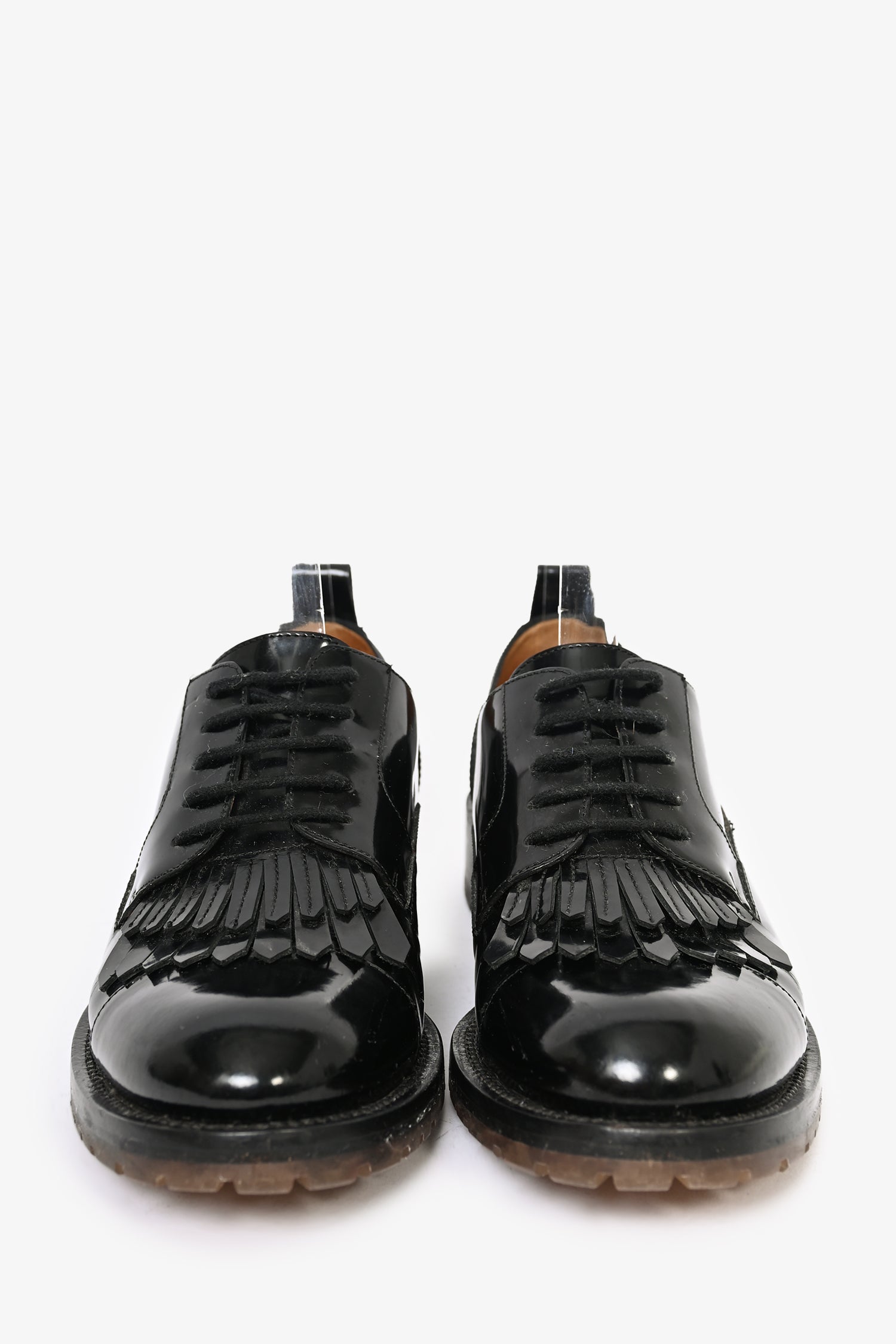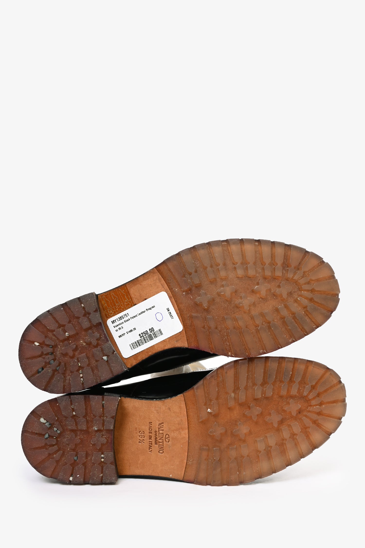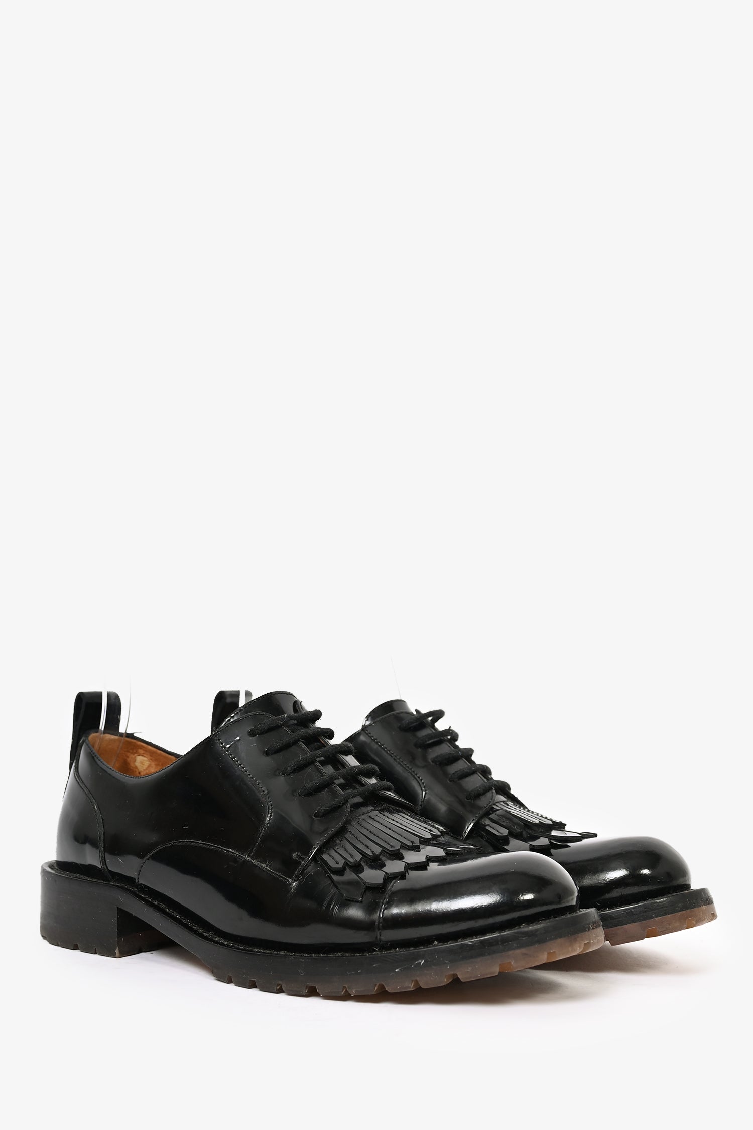 Refresh availabilityValentino Black Patent Leather Brogues. Round toe. Lace up closure. Leather lined interior. Gold-tone triangular hardware piece at back. Rubber soles.