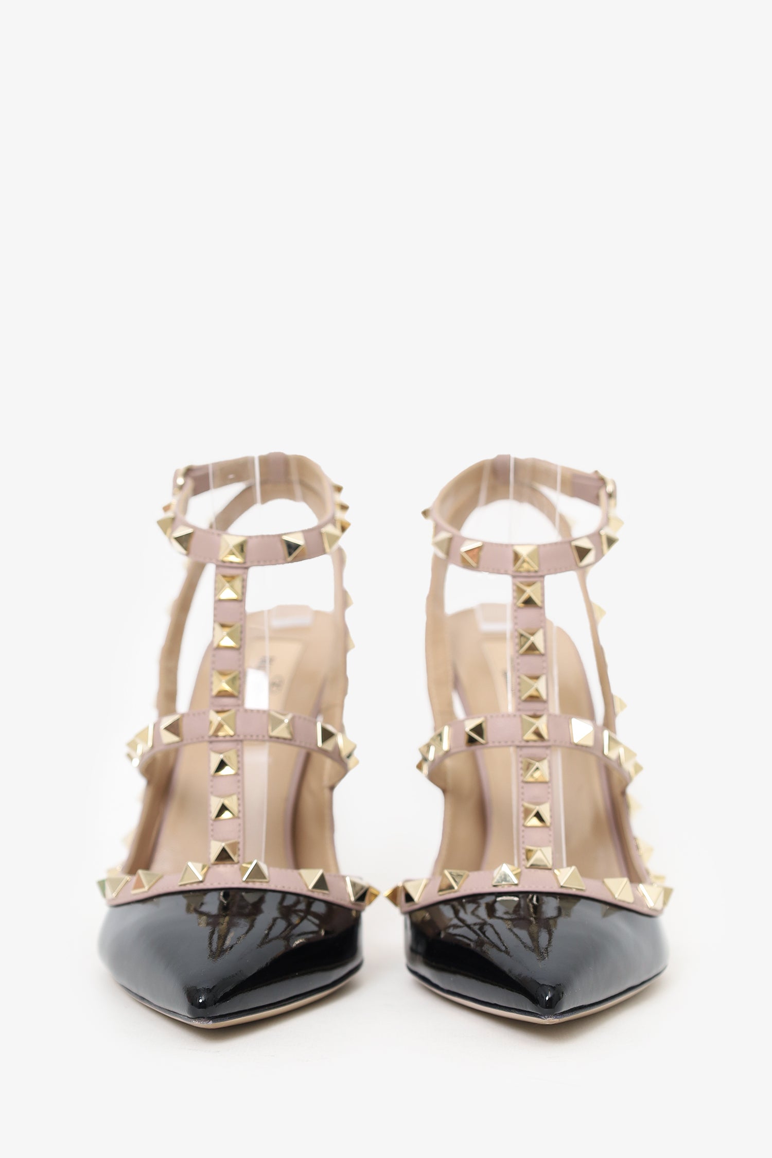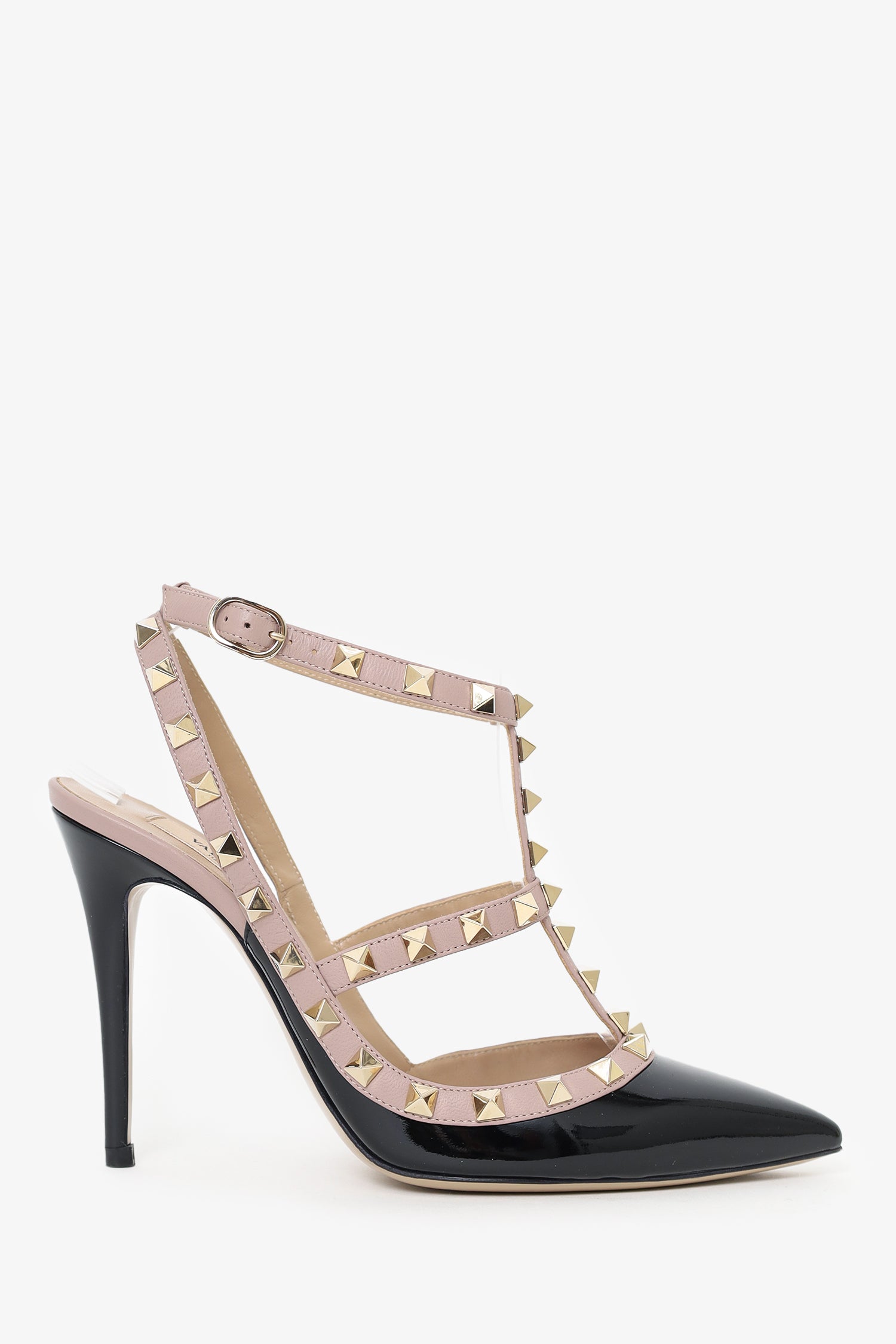 Refresh availabilityValentino Black Patent Leather Pointed Rockstud Heels. Slip-on. Pointed-toe. Ankle strap with adjustable buckle closure. Gold-tone hardware. Tonal stitching.