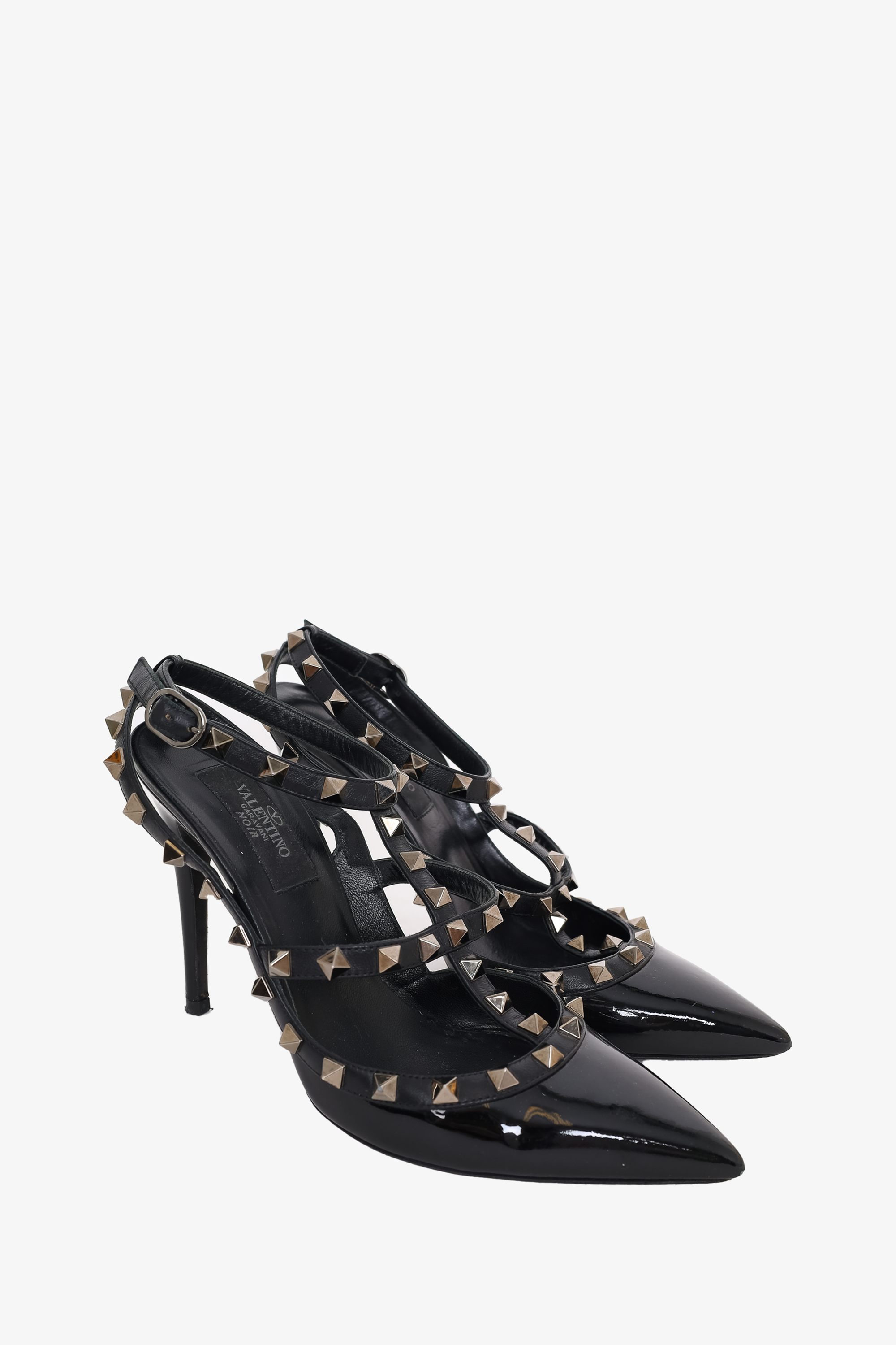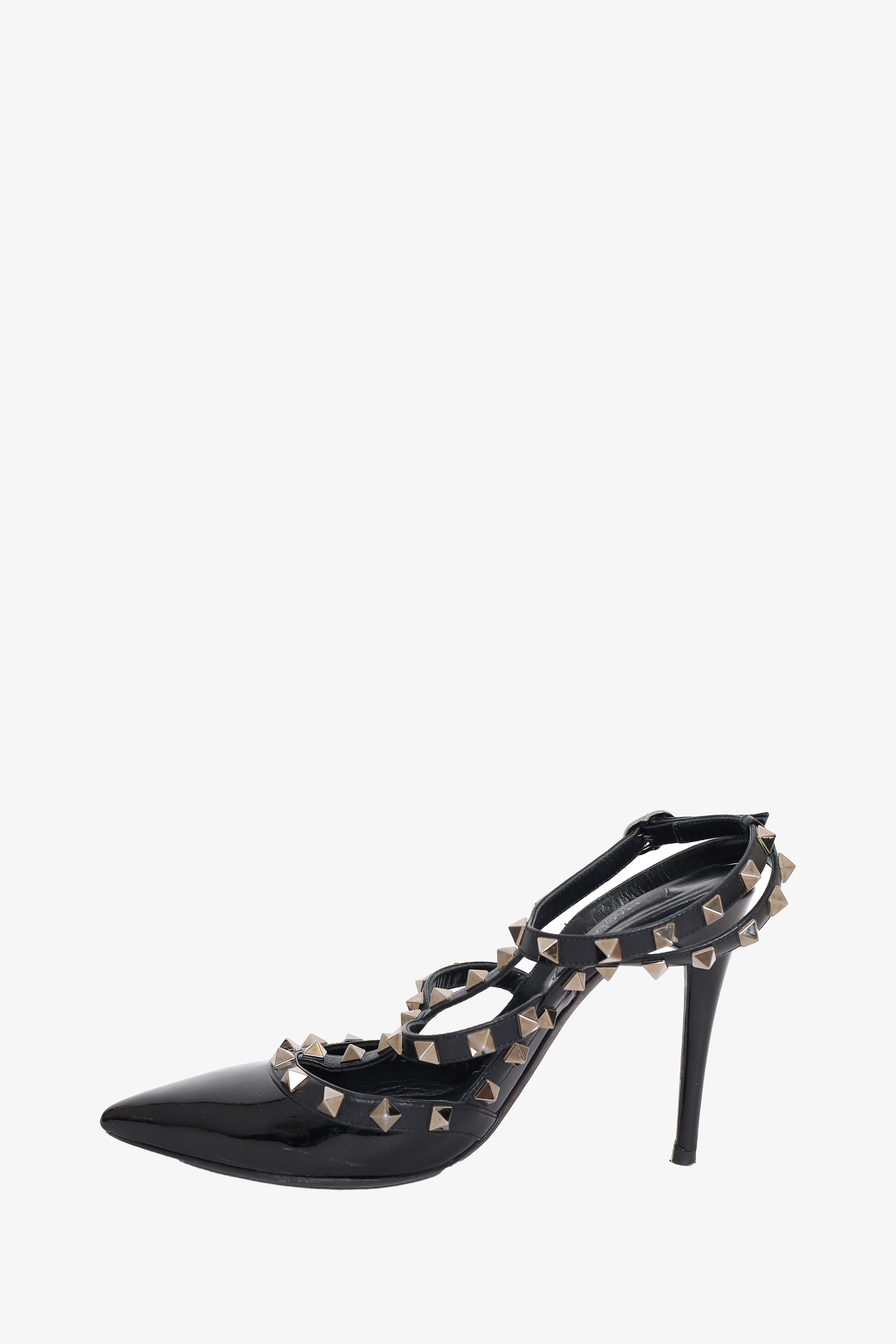 Refresh availabilityValentino Black Patent Rockstud Cage Heels. Ankle strap with adjustable buckle closure. Pointed toe. Tonal stitching. Glossy finish.