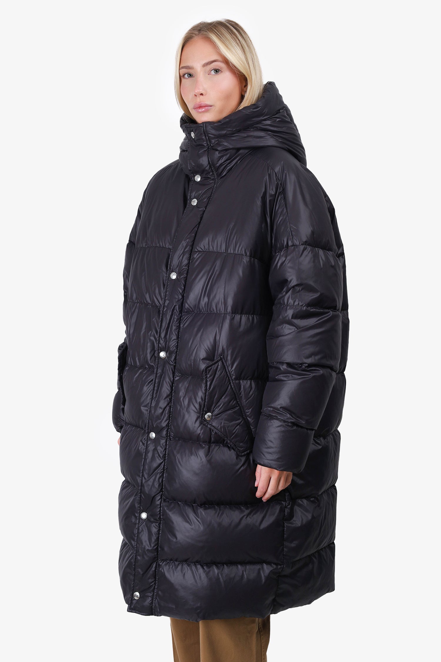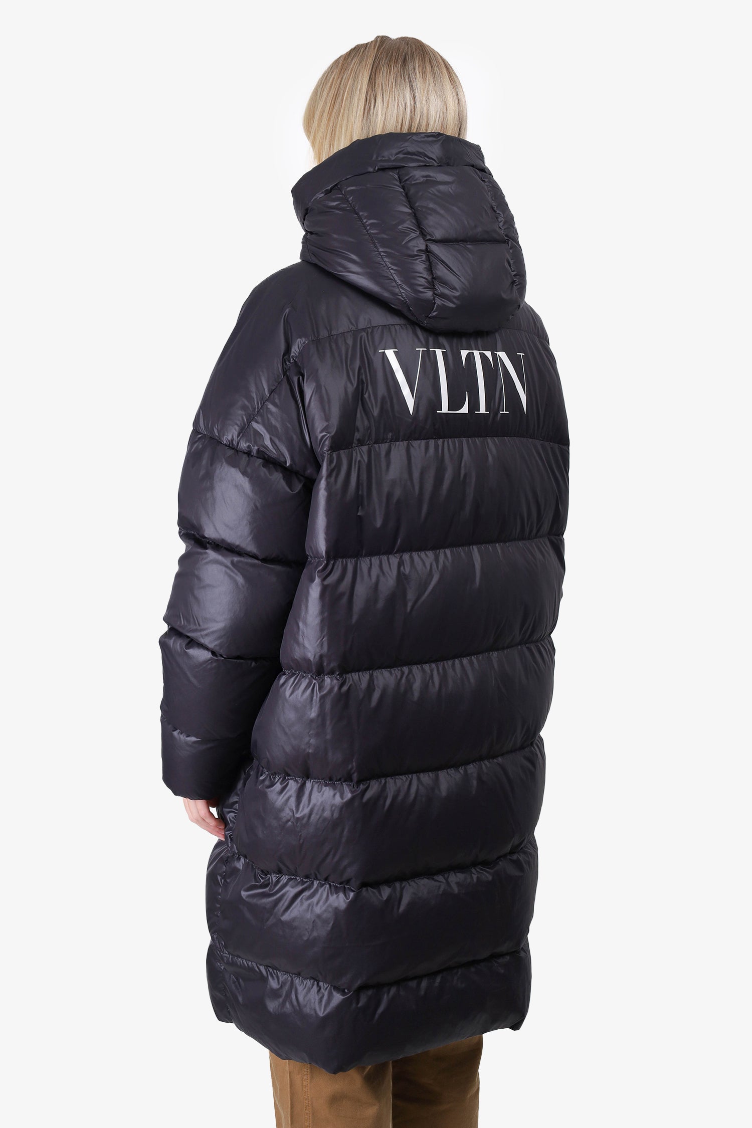 Refresh availabilityValentino Black Quilted Oversize Vltn Hooded Down Coat. Front zip and snap button closure. 2 front pockets with snap button closure. Ribbed cuffs. Lined. Tonal stitching.