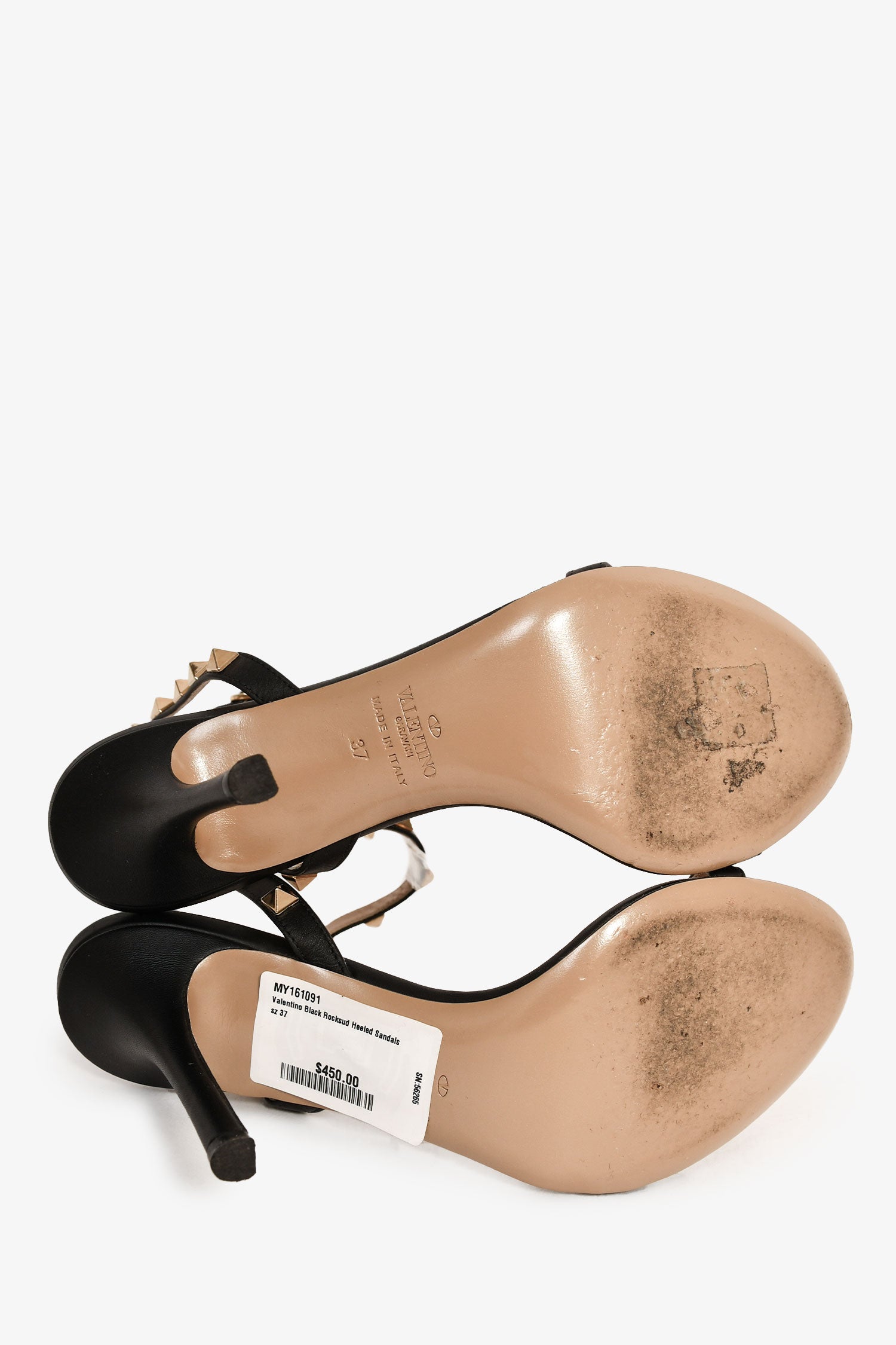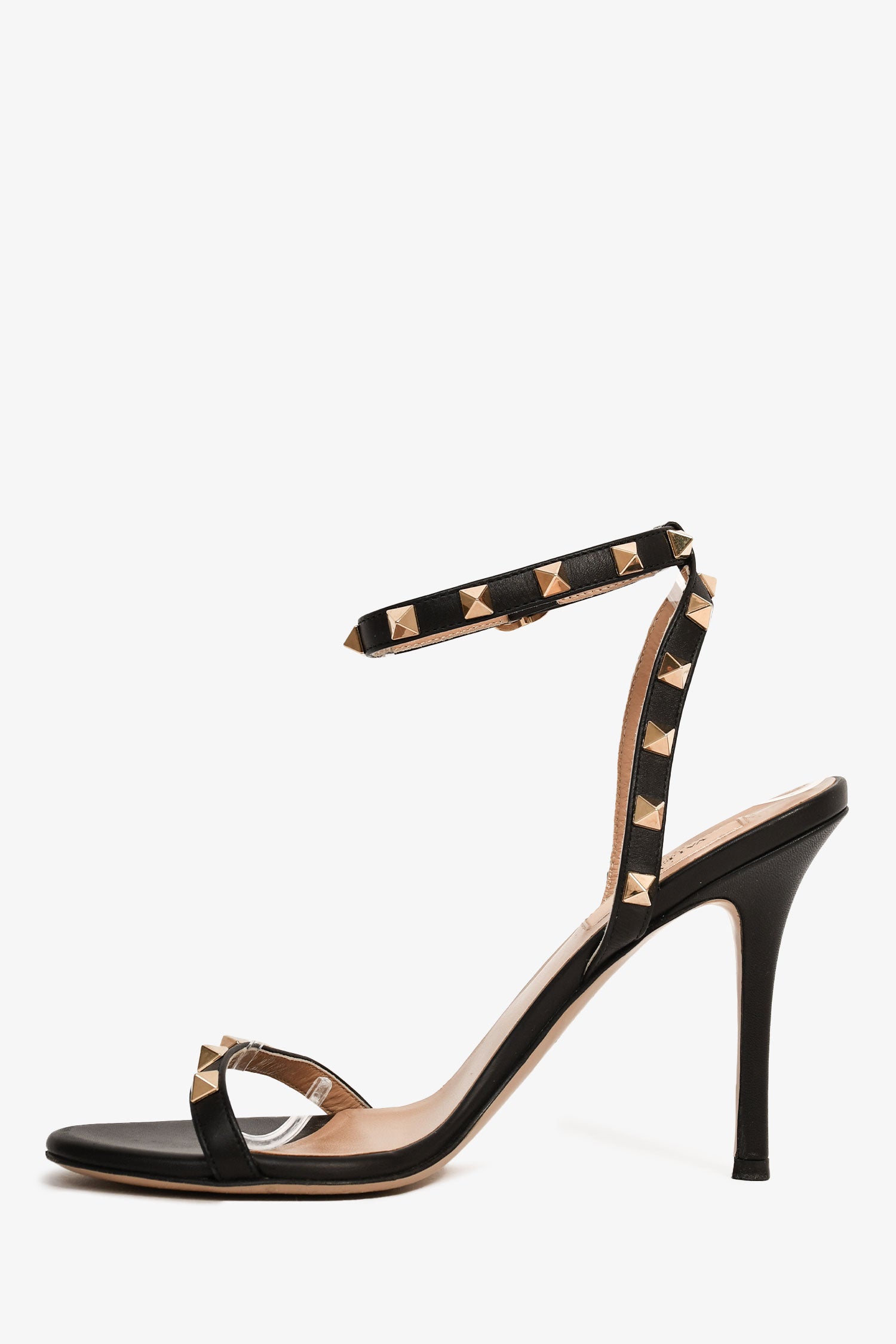 Refresh availabilityValentino Black Rocksud Heeled Sandals. Rounded open toe. Leather insoles. Stiletto heel. Gold-tone hardware. Tonal stitching.