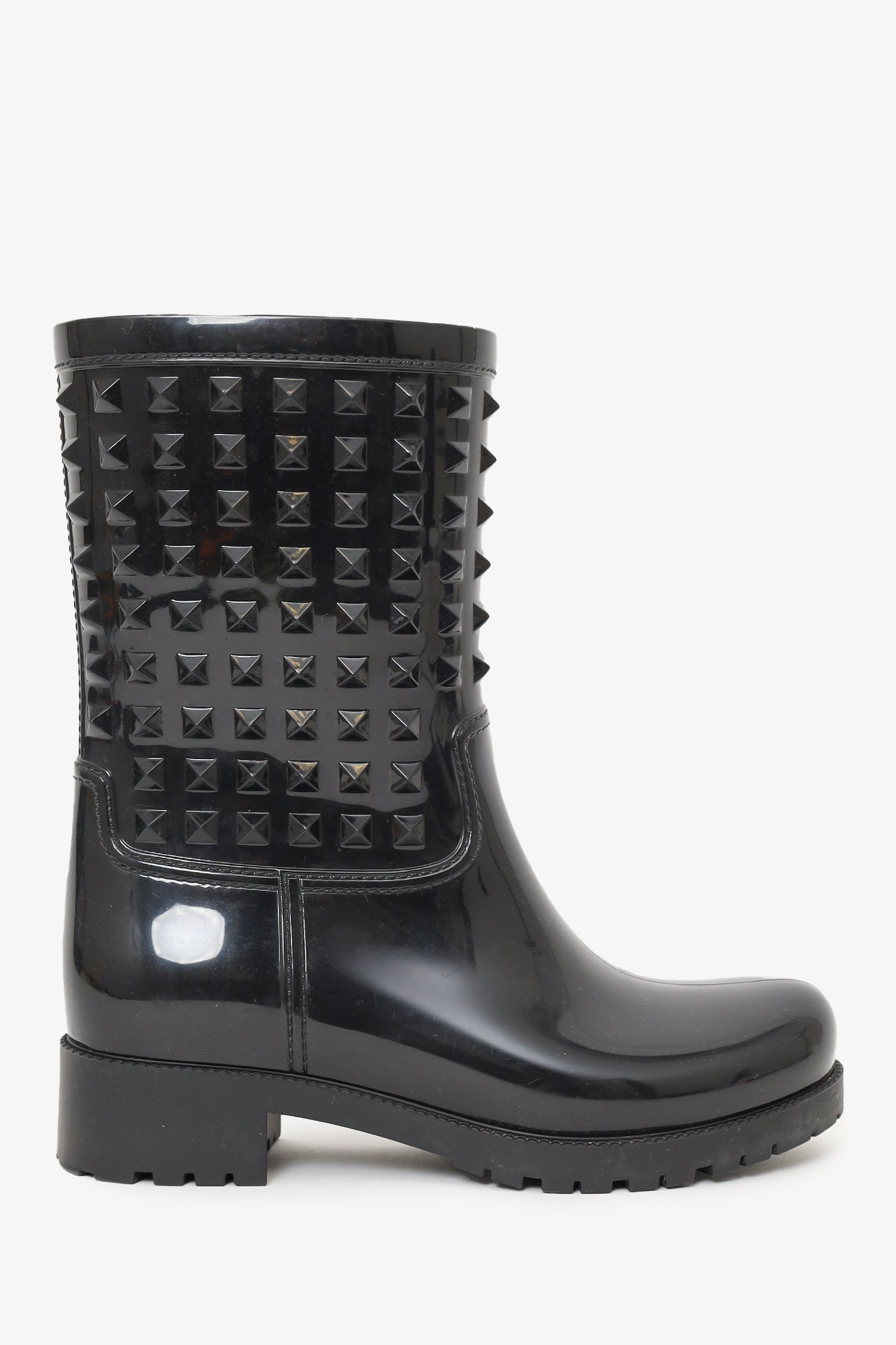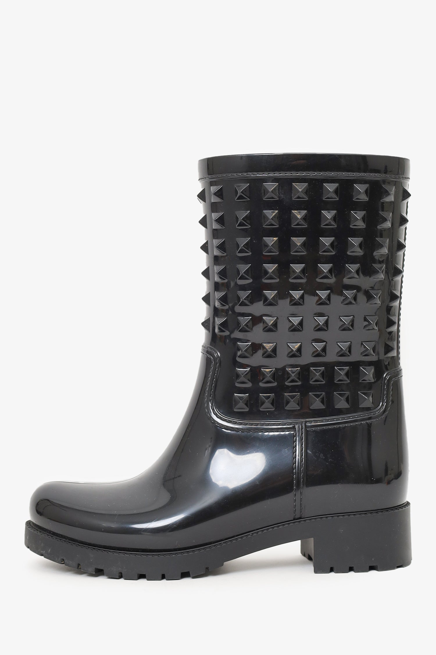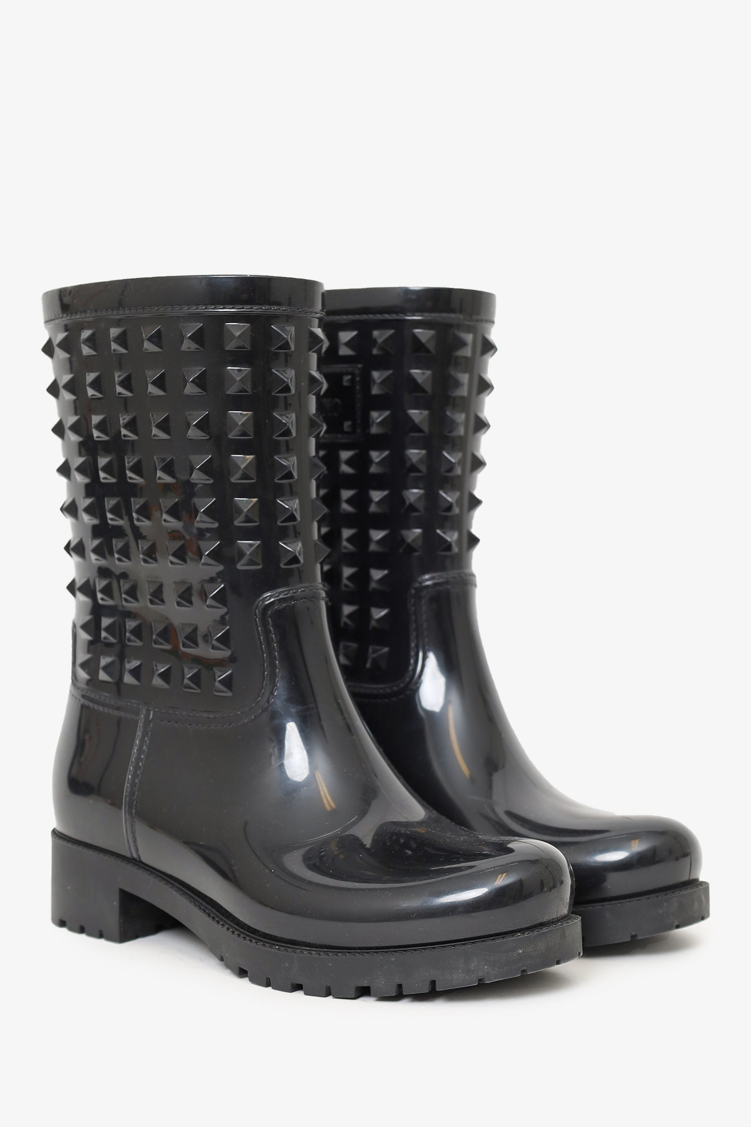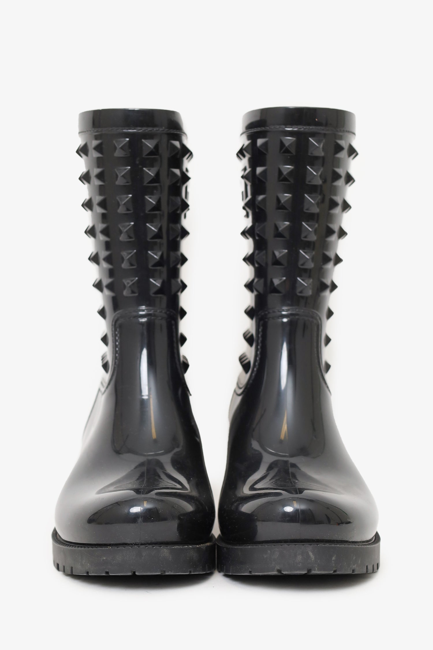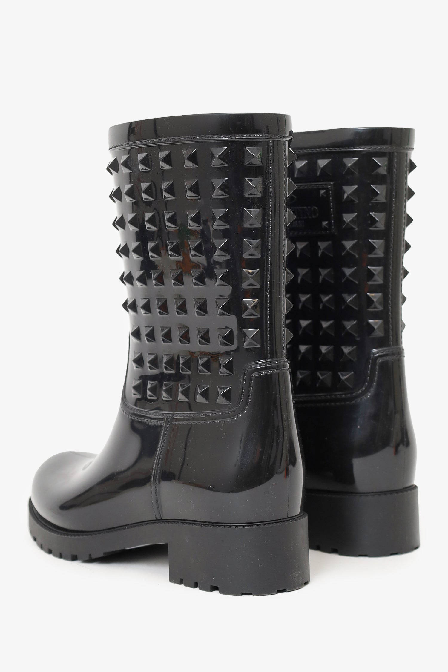 Refresh availabilityValentino Black Rubber Rockstud Rainboots. Pull-on. Pointed-round toe. Glossy finish. Tonal stitching.