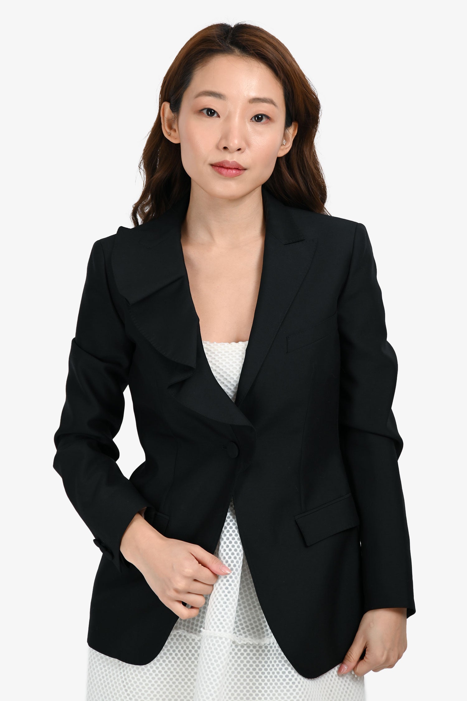 Refresh availabilityValentino Black Wool/Silk Asymmetrical Lapel Blazer. V-neckline. Single button closure in the front. 2 exterior pockets with fold-over closure. Single welt pocket in the front. Lined. Tonal stitching.
